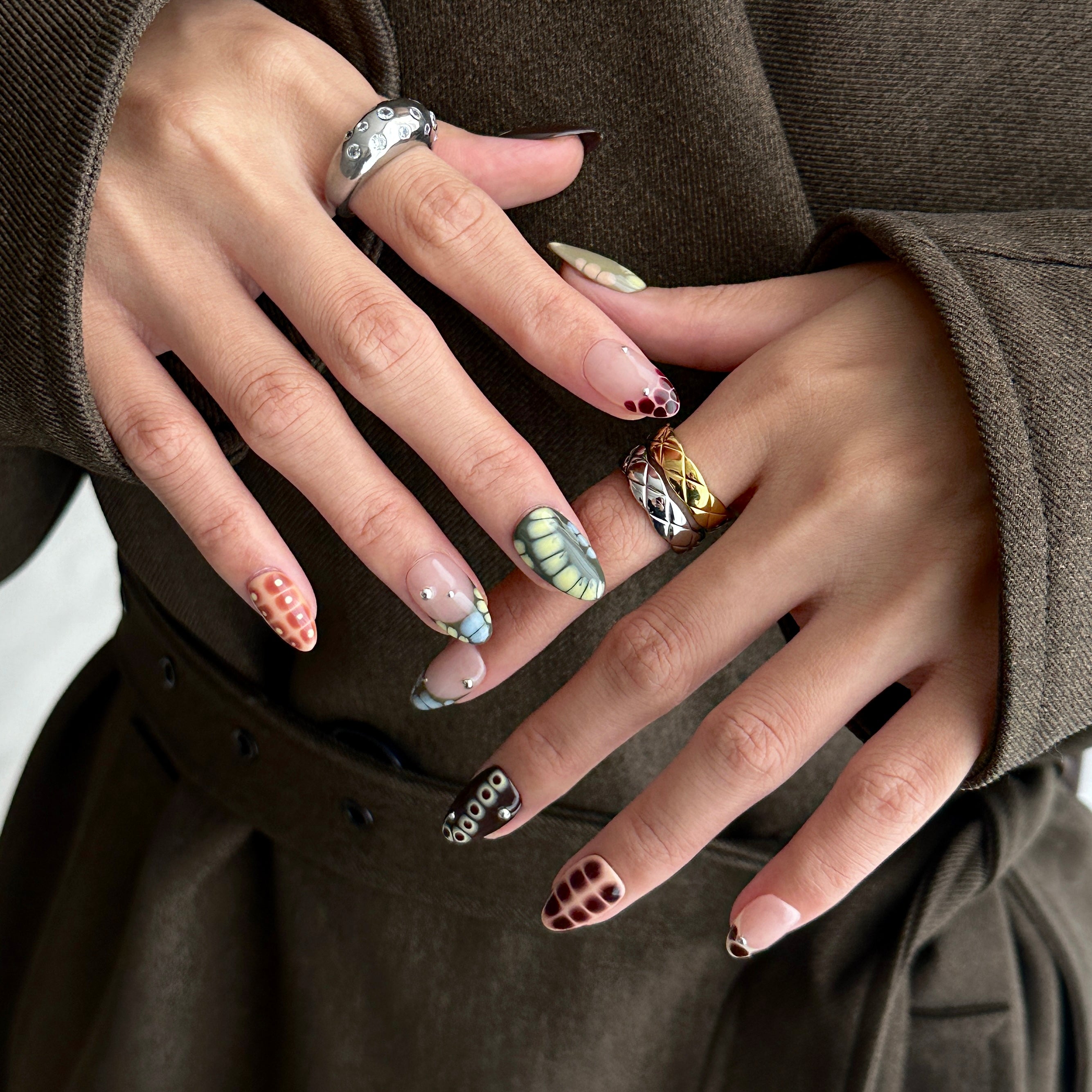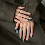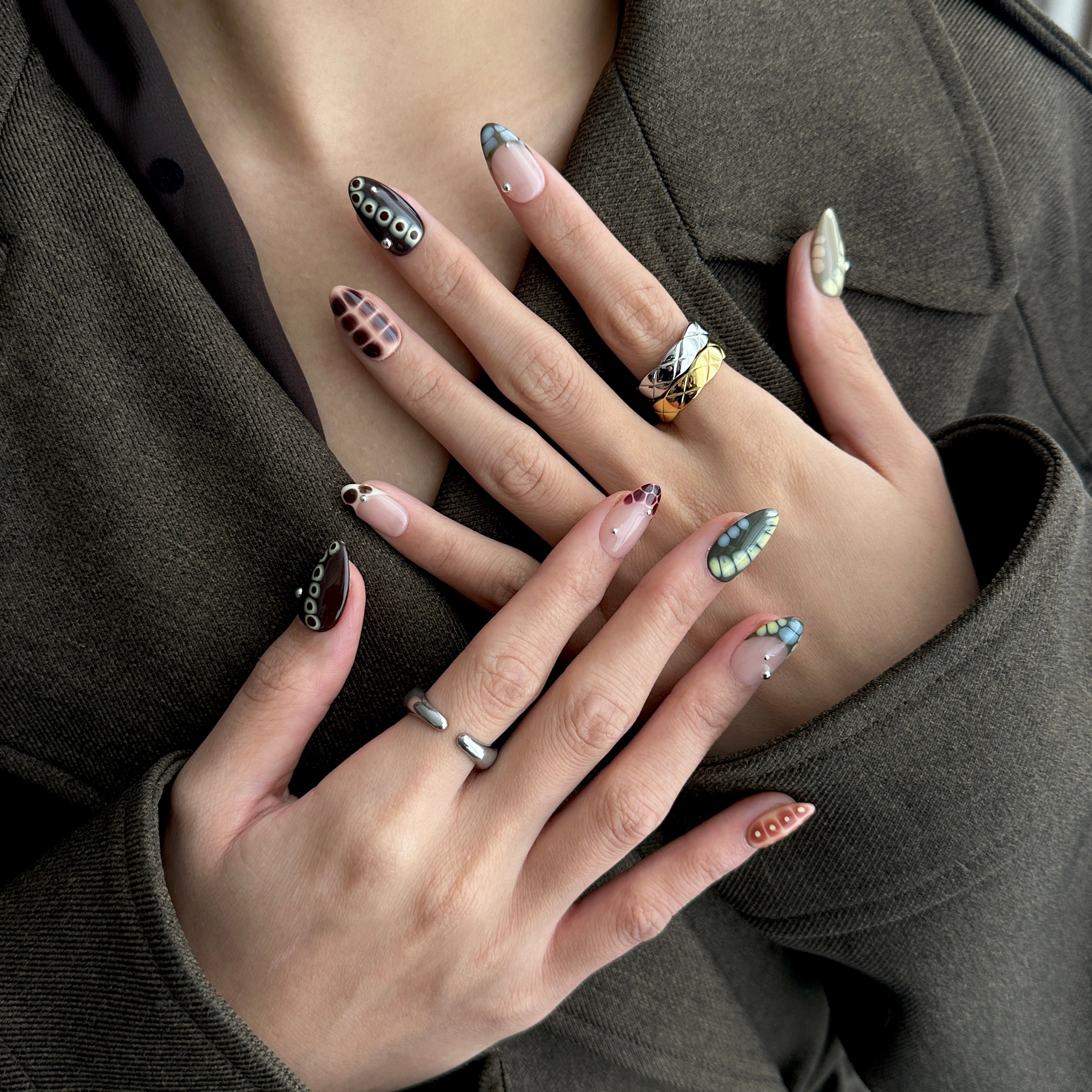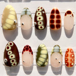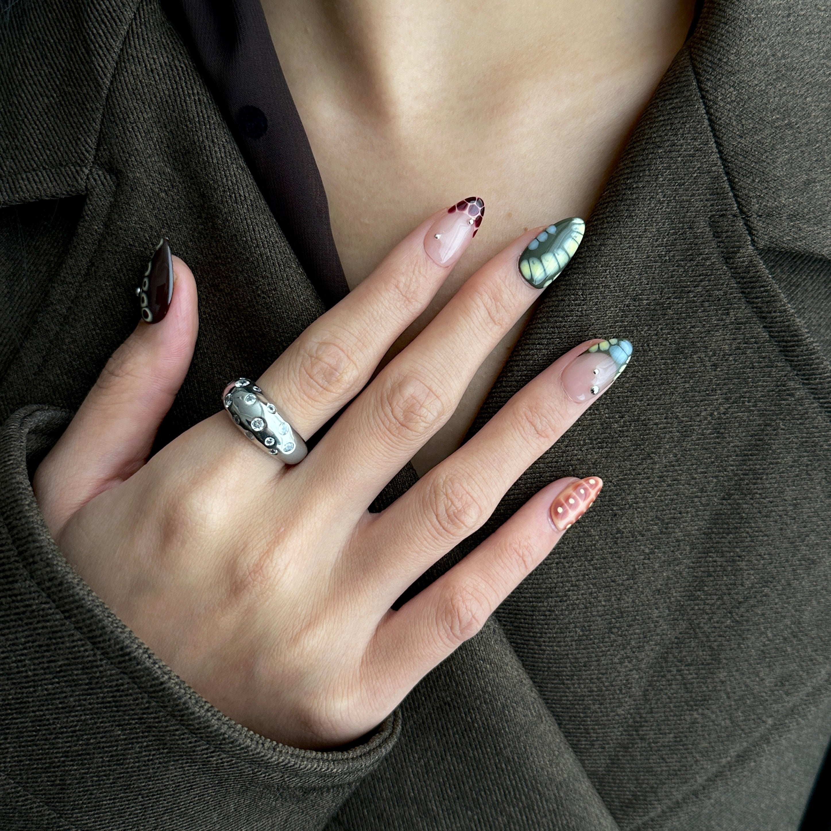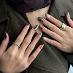 A captivating design for fall season that brings the untamed beauty of the forest to your fingertips. This handmade press-on nail style features a unique crocodile print in deep, earthy greens with elegant silver charms, creating a look that is both wild and refined.