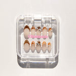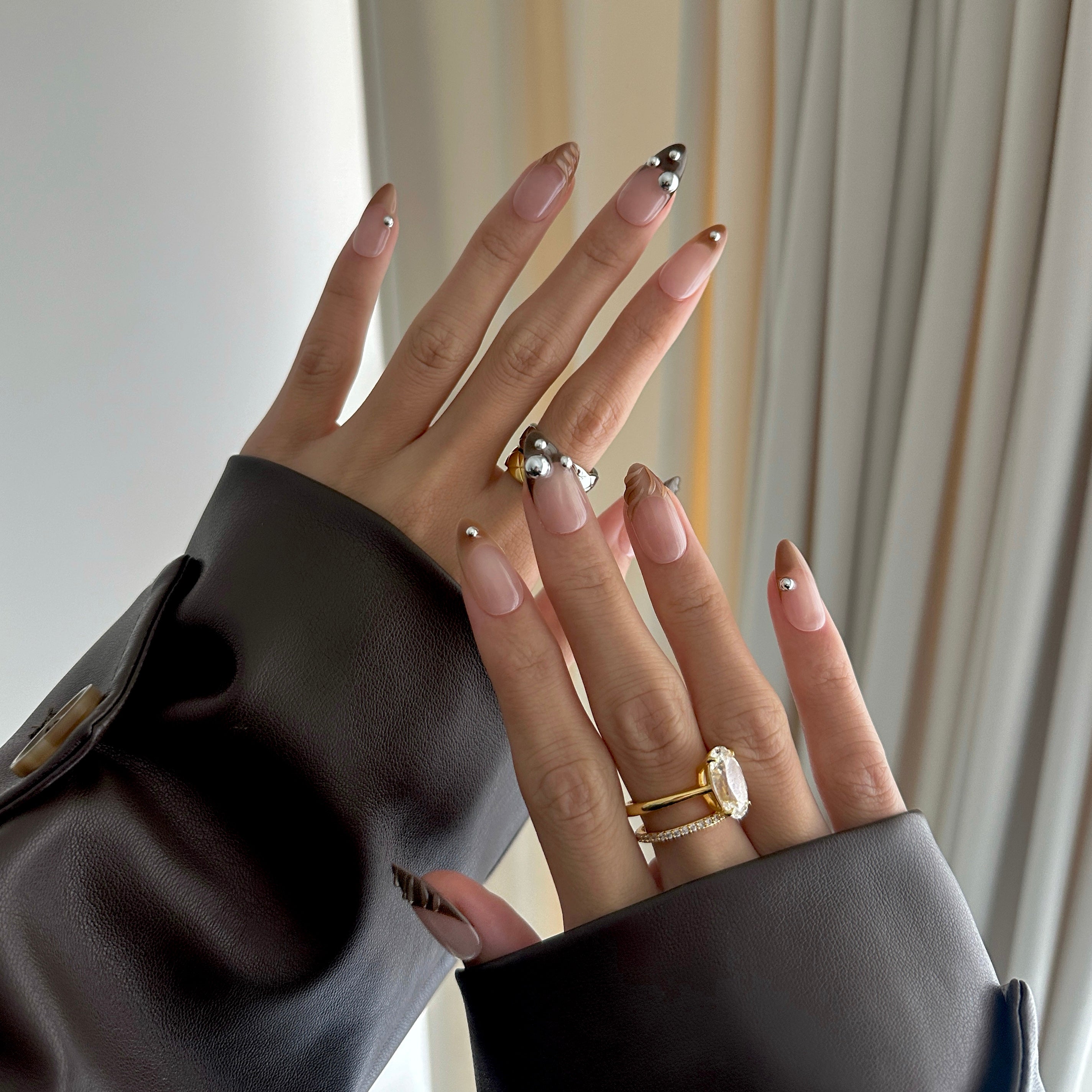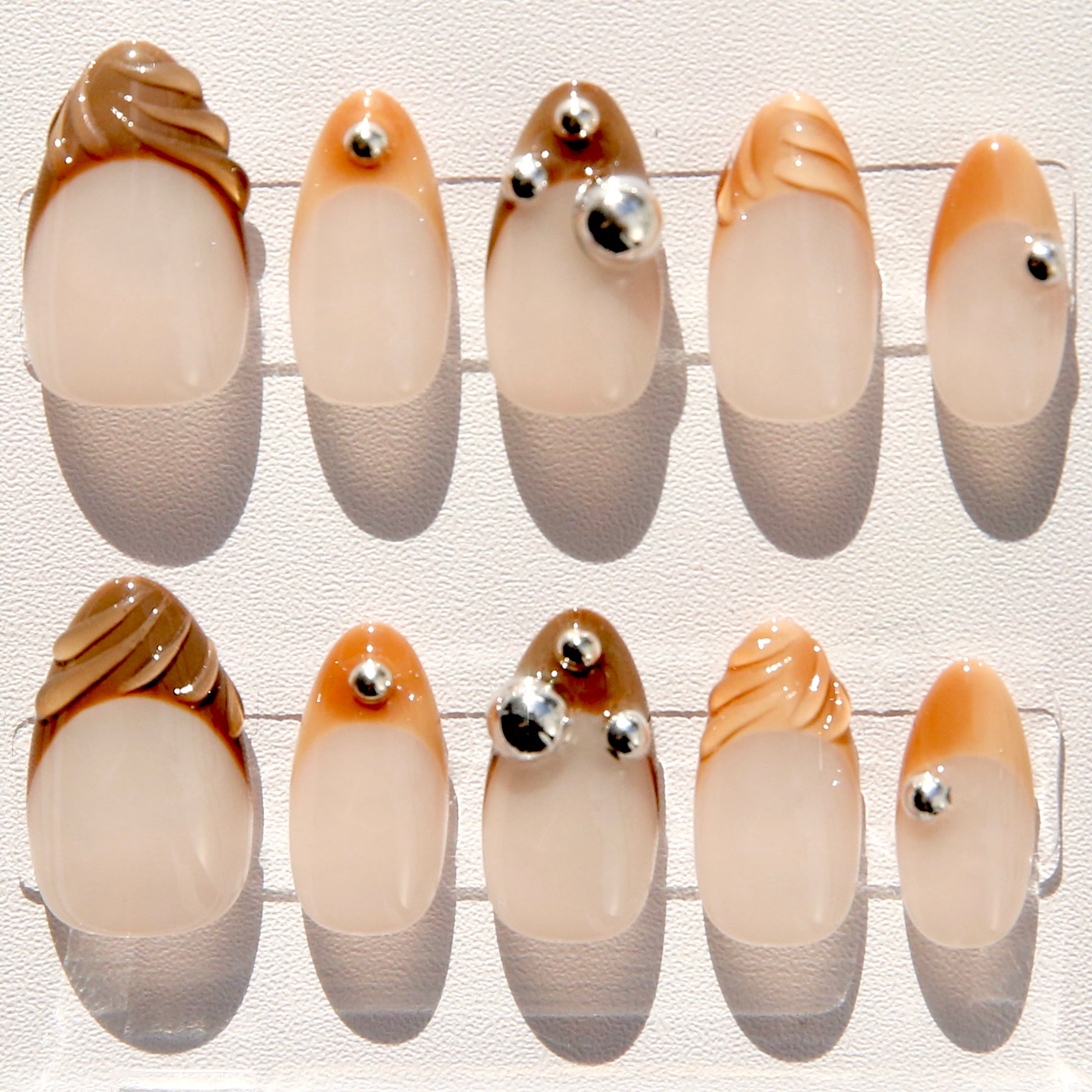 Cozy up to the season with our Coffee Break press-on nails, inspired by the comforting ritual of a warm cup on a crisp autumn day. This set features a rich palette of brown hues in a sophisticated aura French design, accented with 3D water swirls and glimmering silver charms, capturing the essence of fall’s inviting warmth.