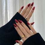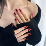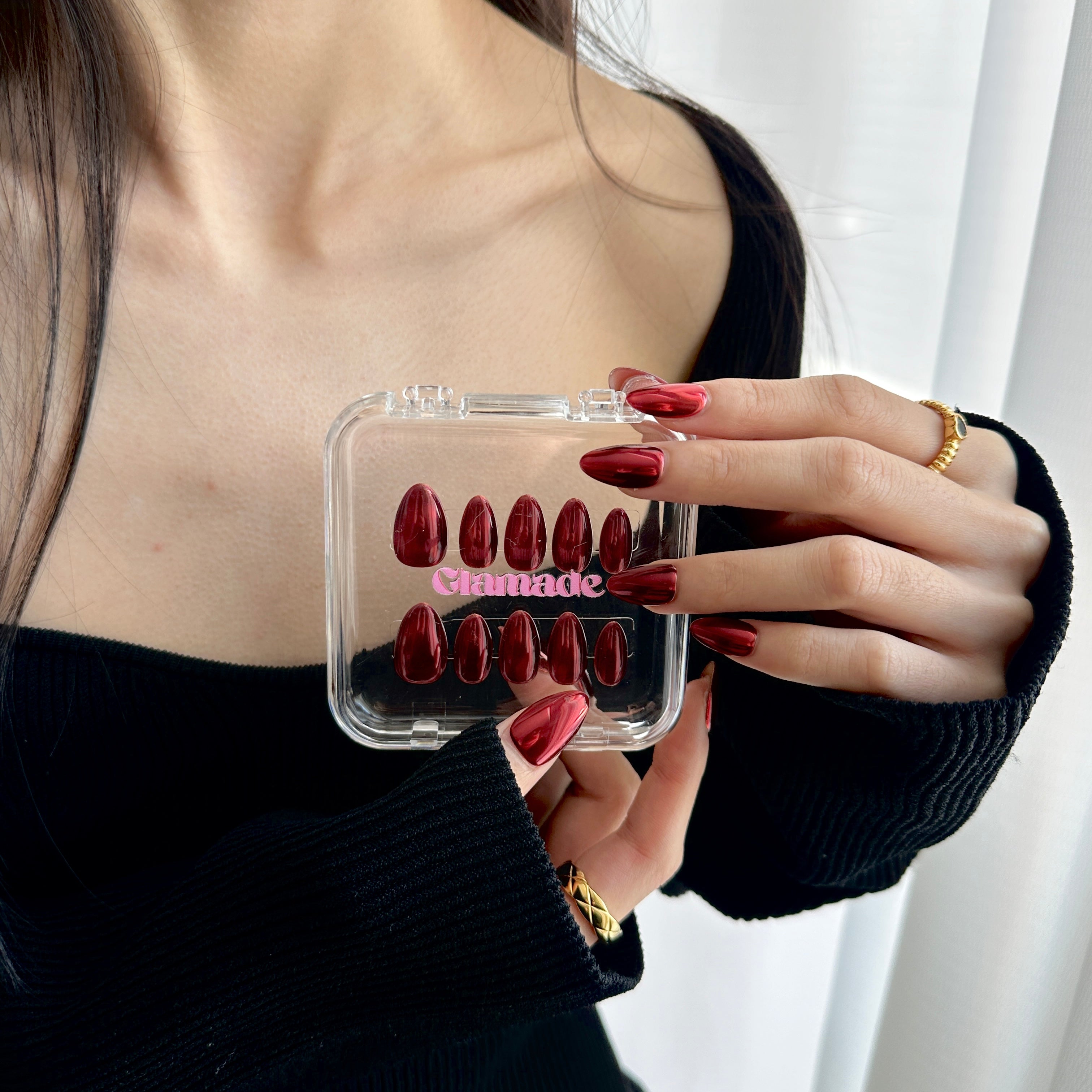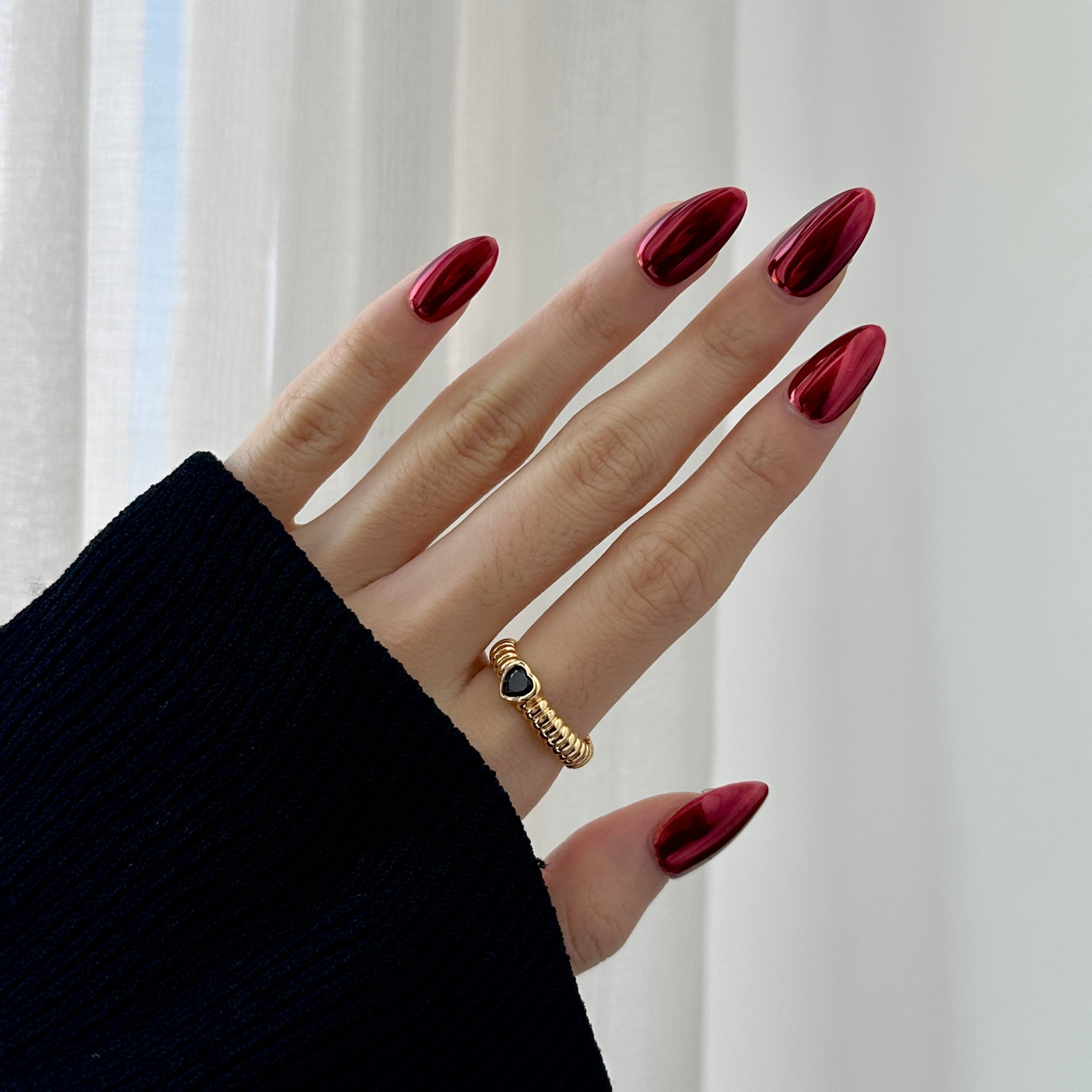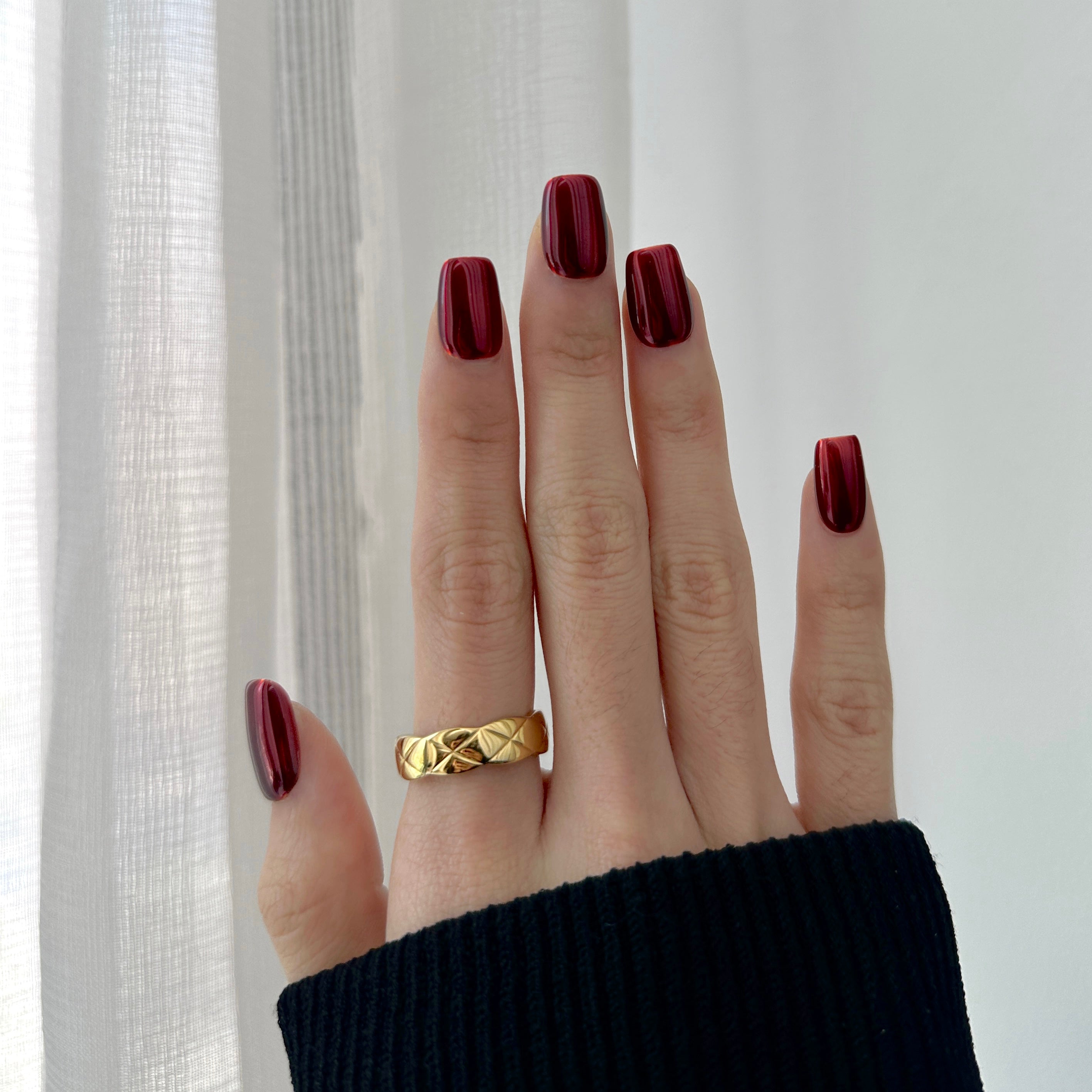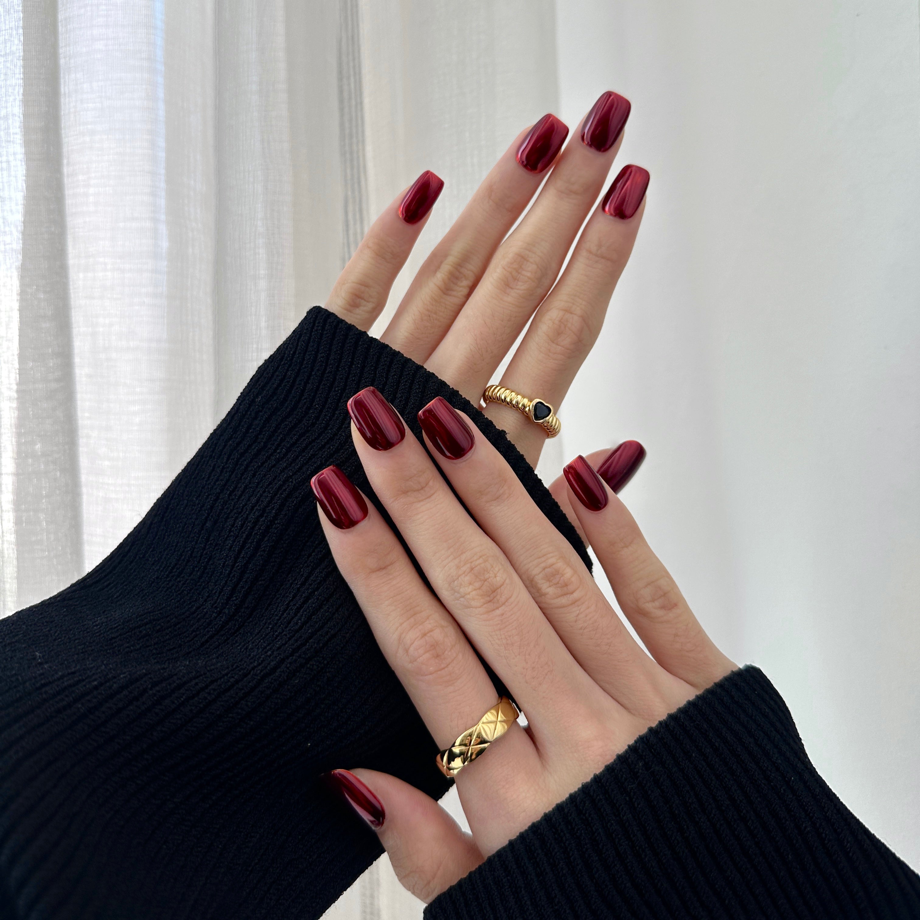 This enchanting style features a rich red jelly glaze that elegantly overlays a brilliant gold chrome base, evoking the timeless beauty of a ruby gemstone illuminated by golden light. Ideal for making a bold yet sophisticated statement, Ruby Jelly is your go-to accessory for any romantic occasion.