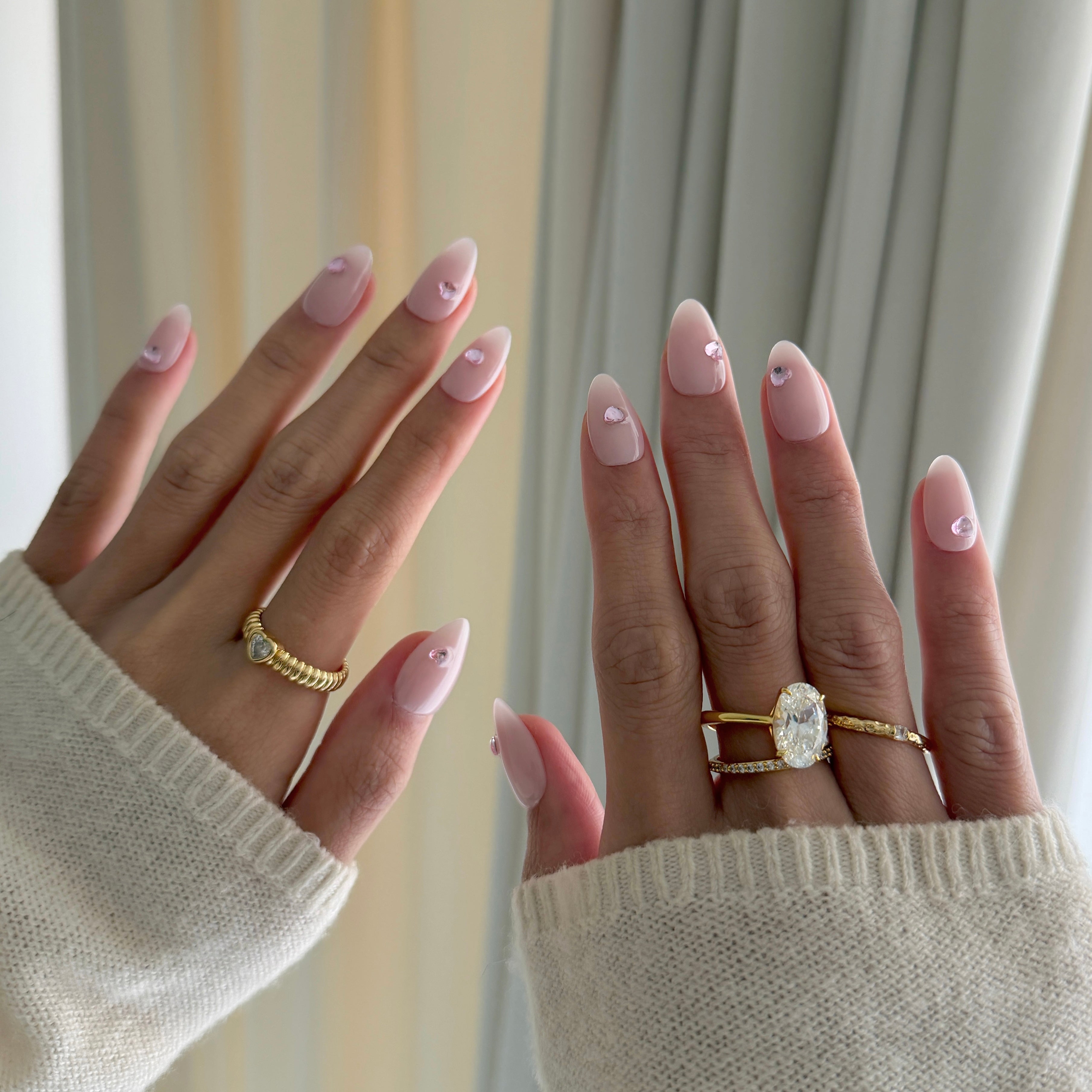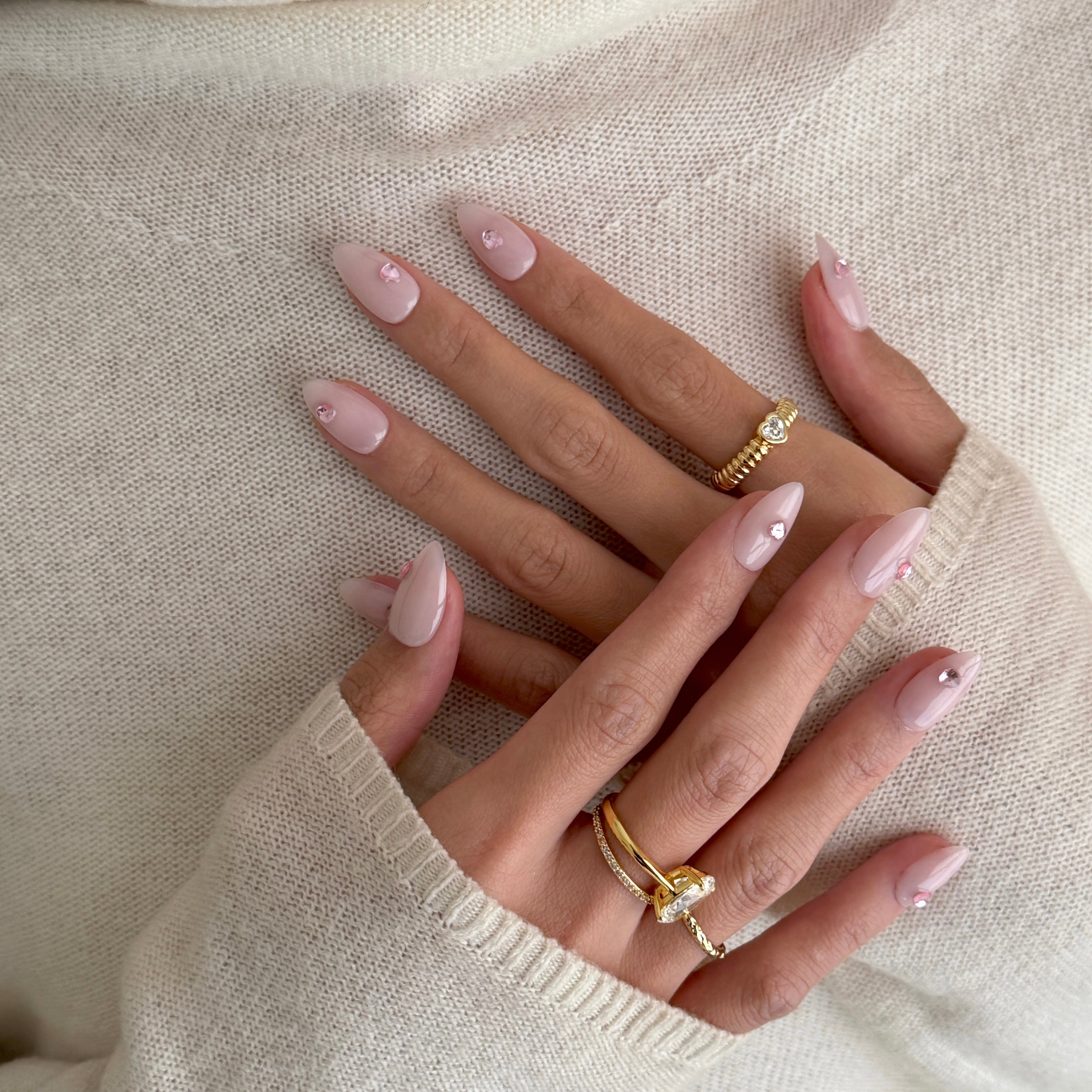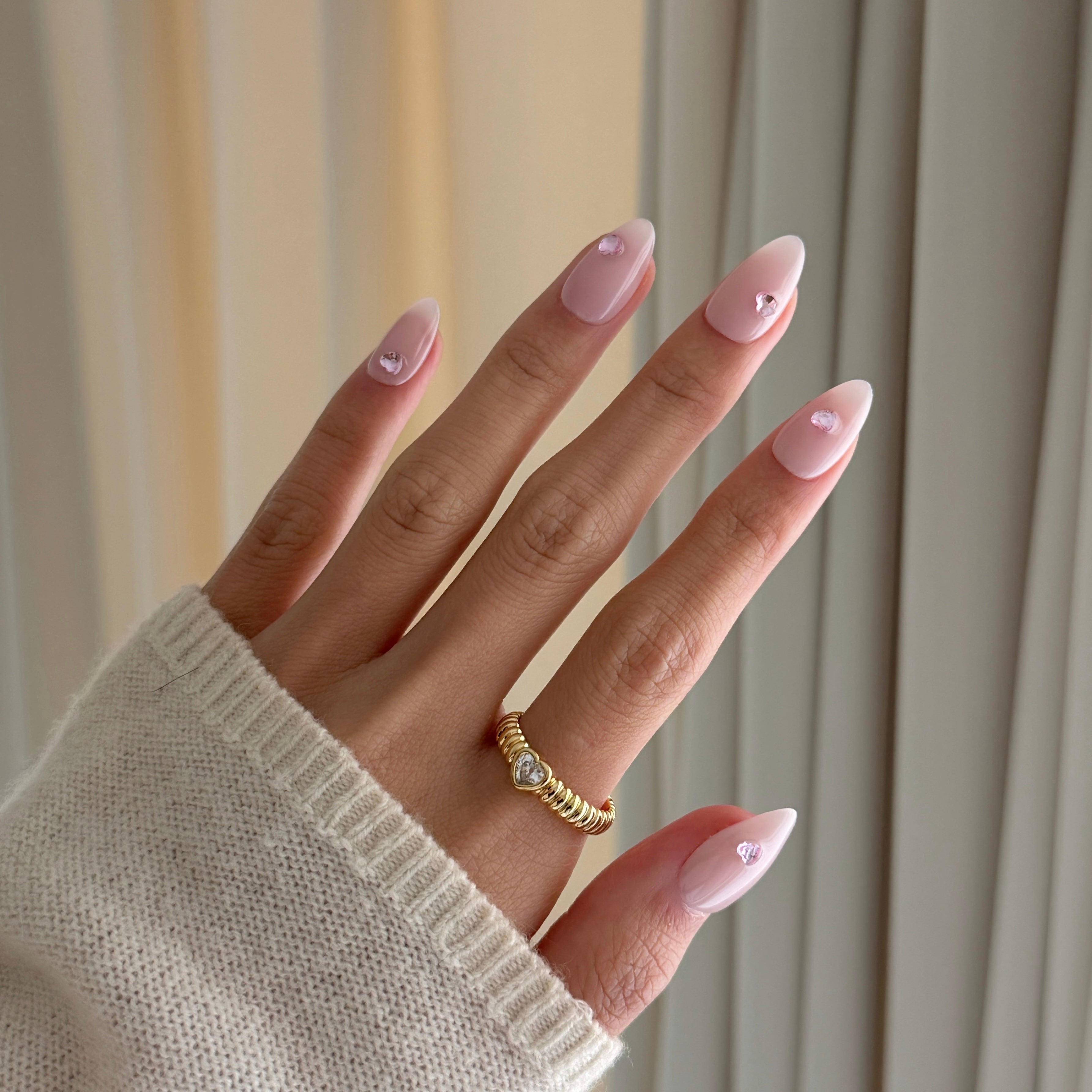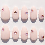 - Heart Gem Accent: Faceted, blush‑pink heart crystals are individually placed at the center of each nail, adding a subtle, romantic glint that catches the light with every movement.