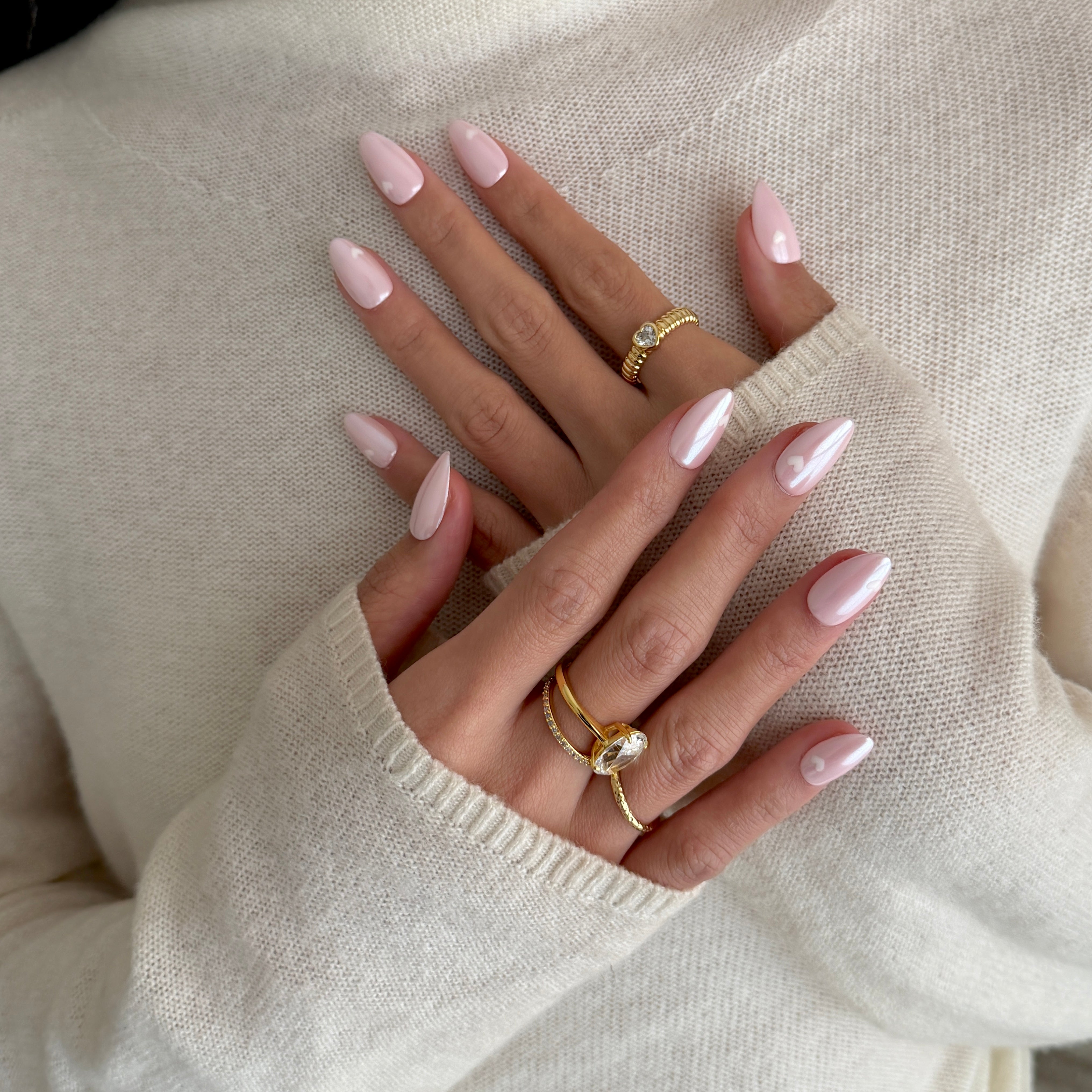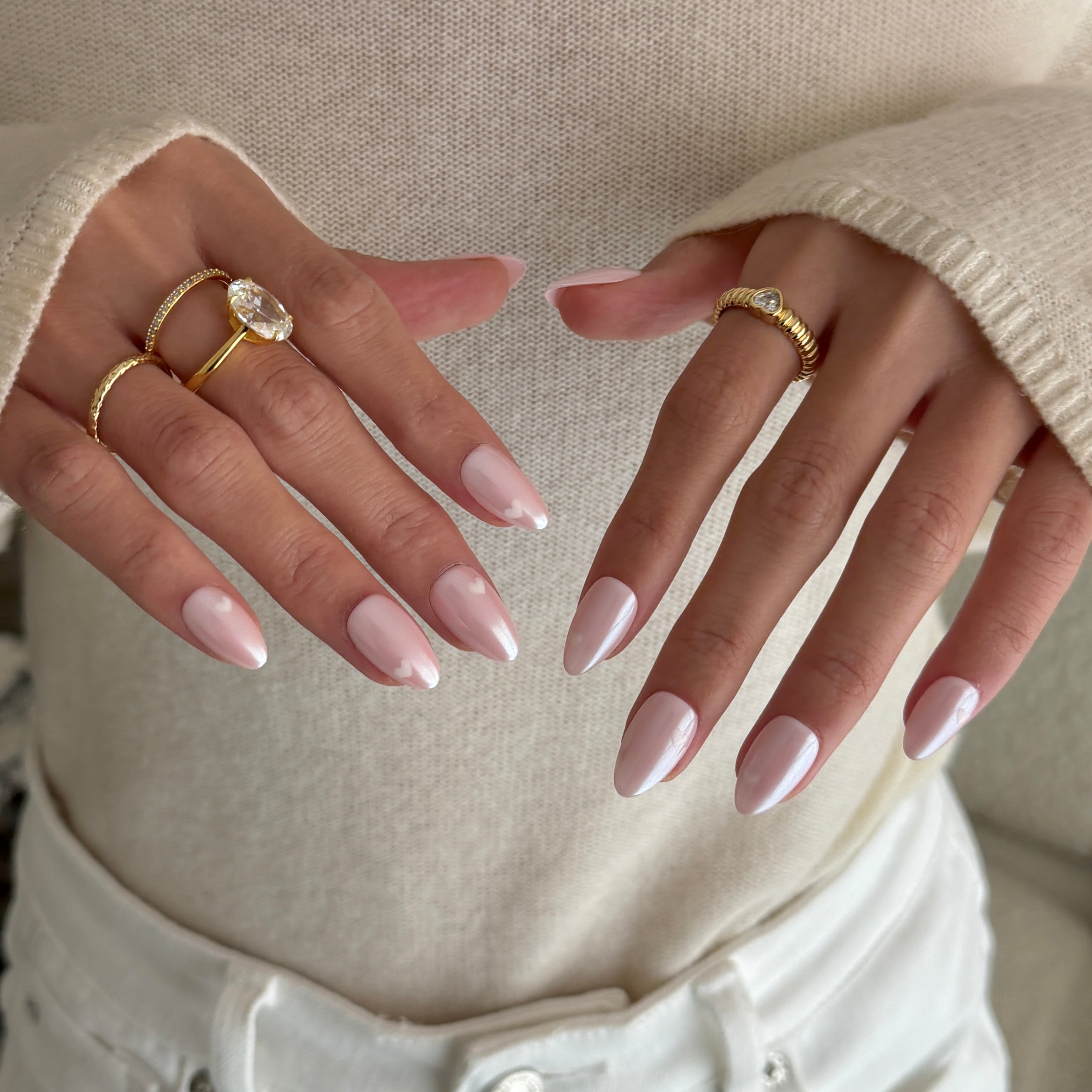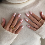 First Crush feels like that soft, fluttery moment when everything turns a little more romantic. This almond‑shaped press‑on set pairs a blush‑pink chrome glow with tiny white hearts, creating a luminous, feminine look that’s sweet but still quietly polished.