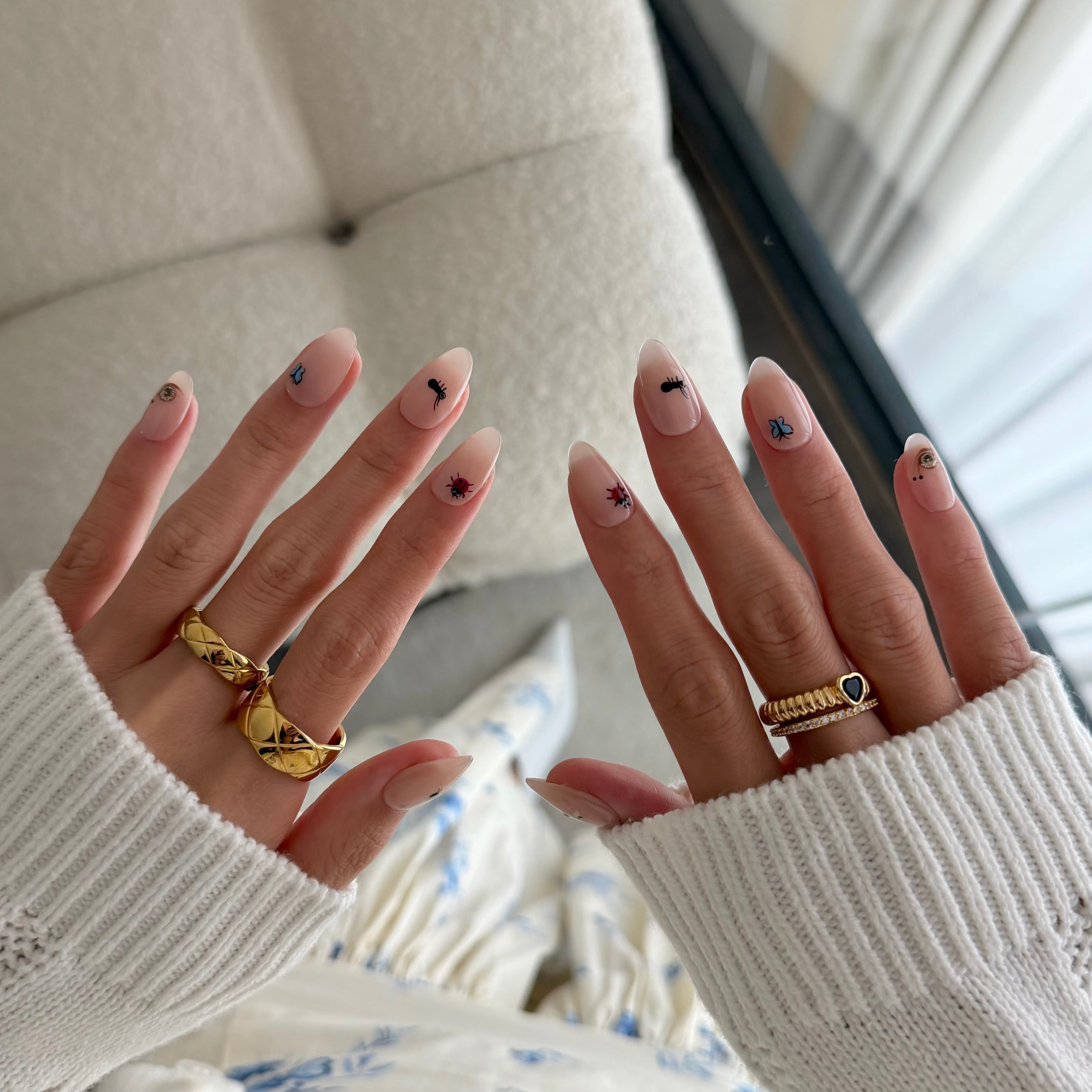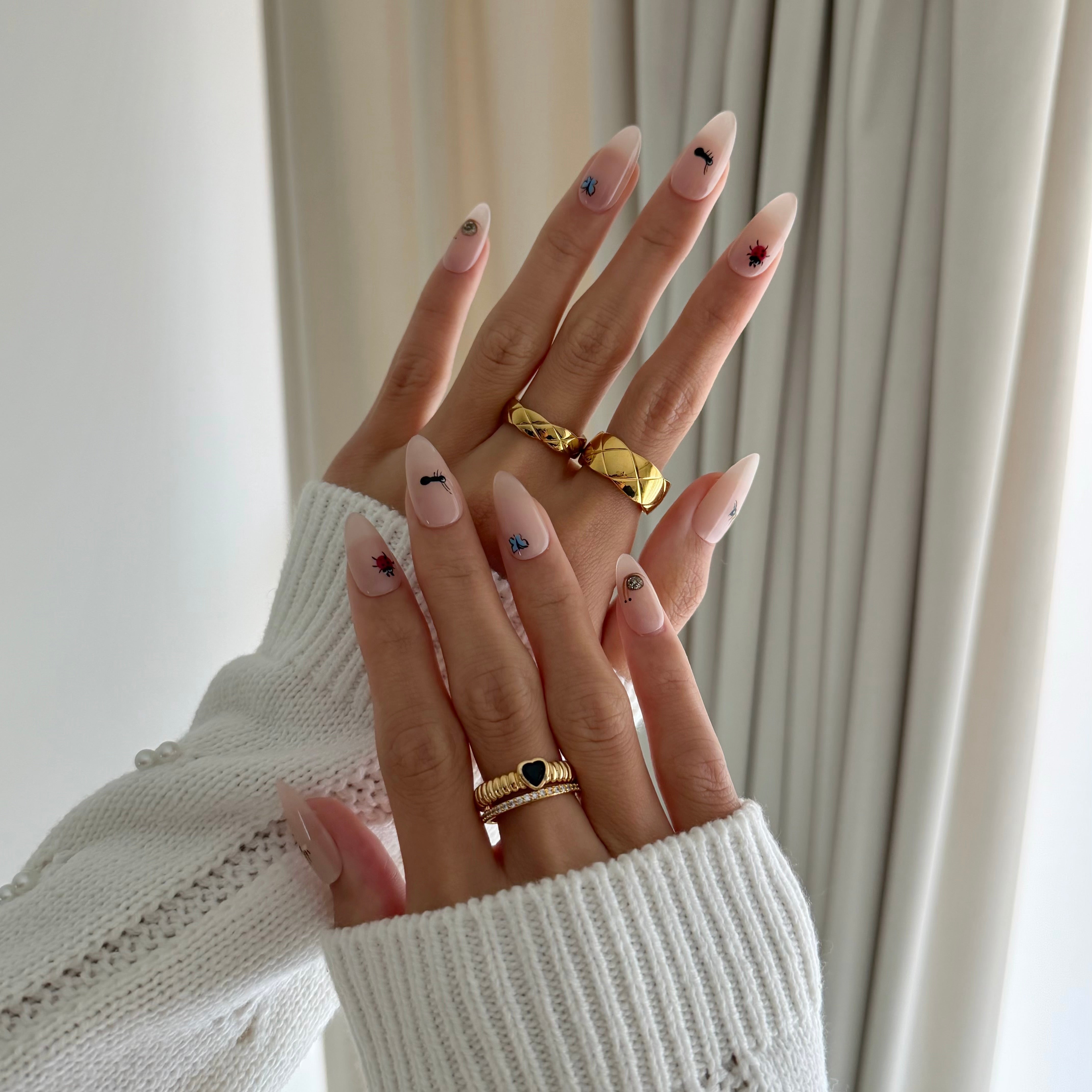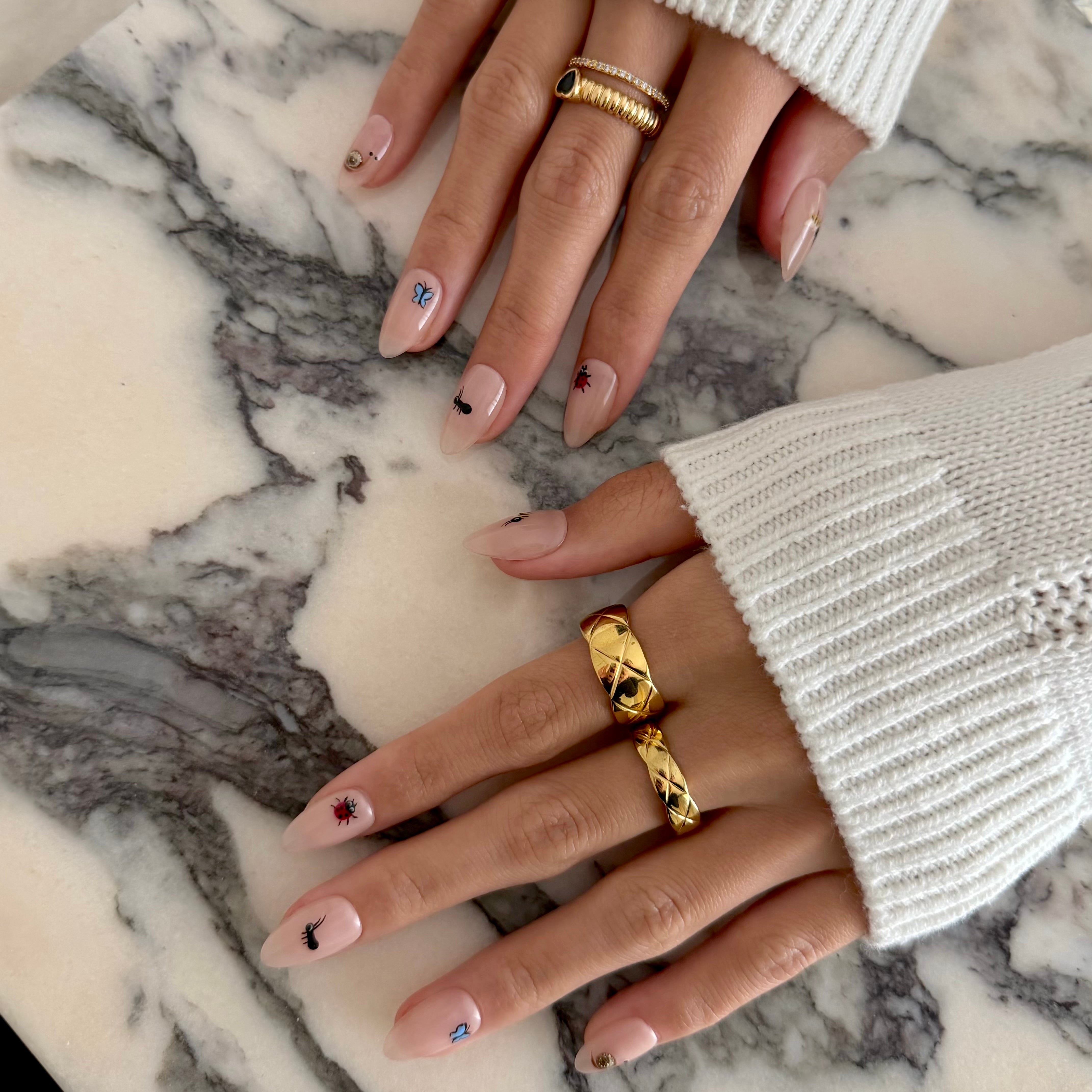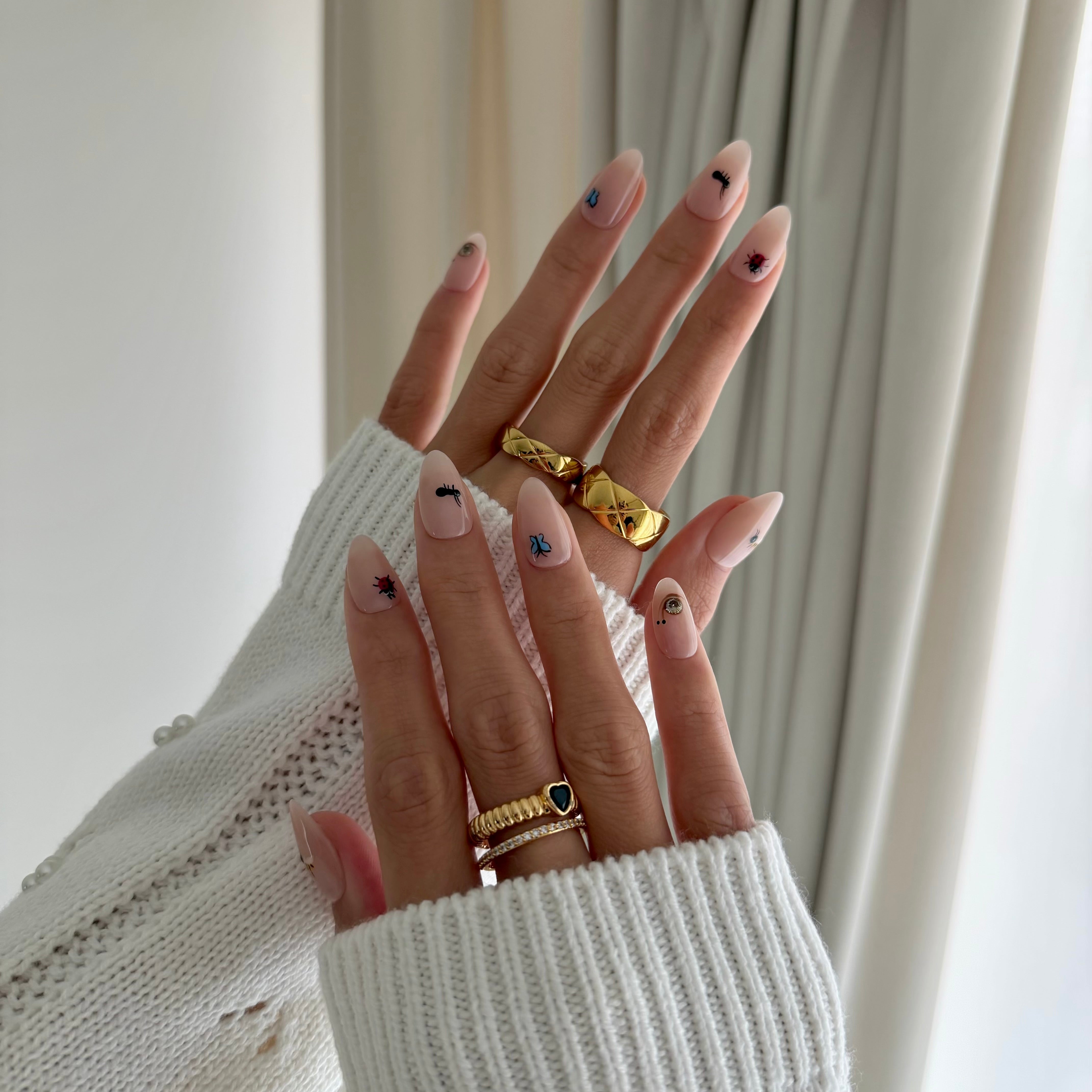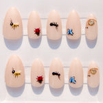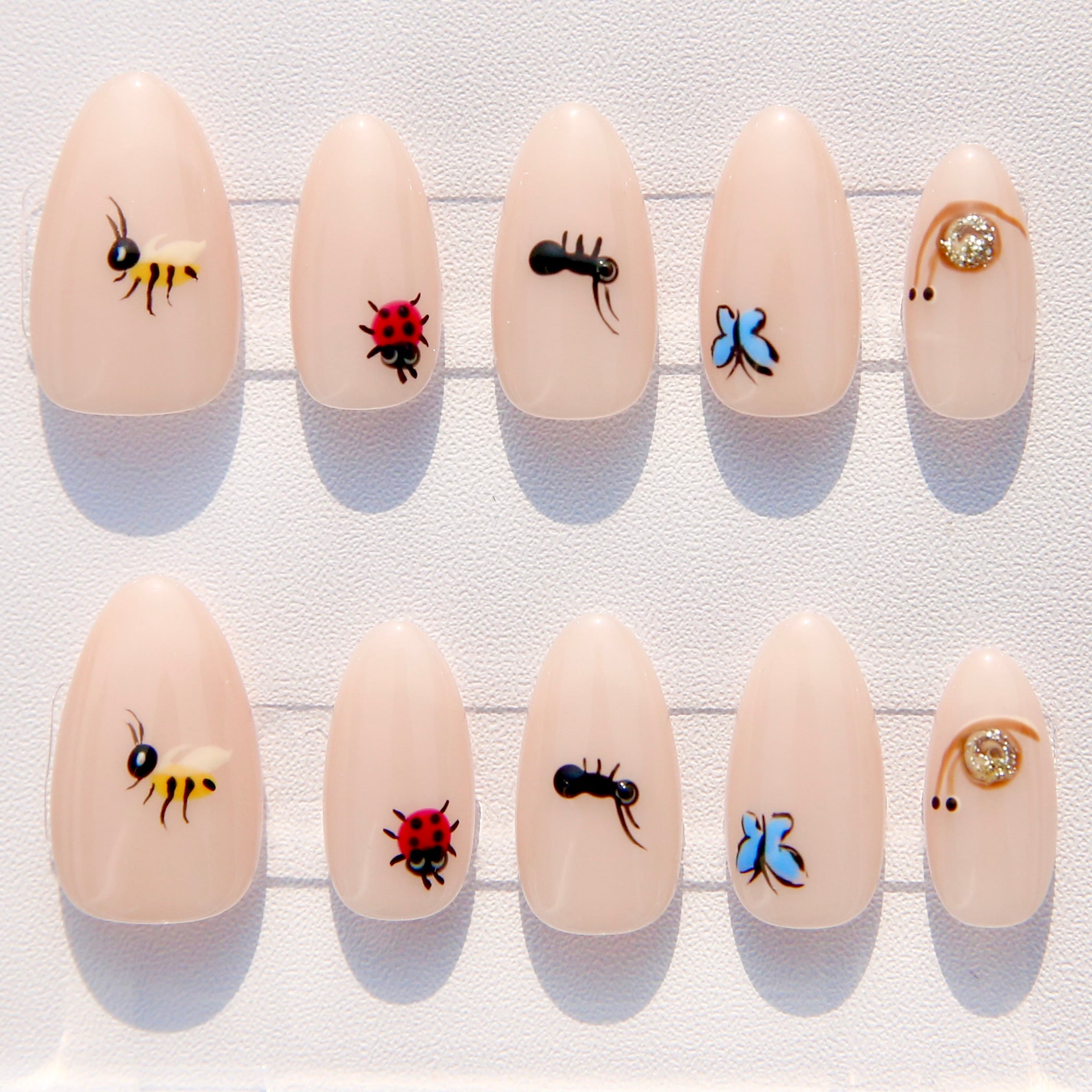 Garden Guests feels like peeking down at a sun‑lit path and spotting all the tiny visitors that call the garden home—ladybugs, bees, butterflies, and a slow little snail making its way through the morning dew. This almond‑shaped handmade press‑on set turns your nails into a soft, storybook scene, where every fingertip hosts a different charming guest.