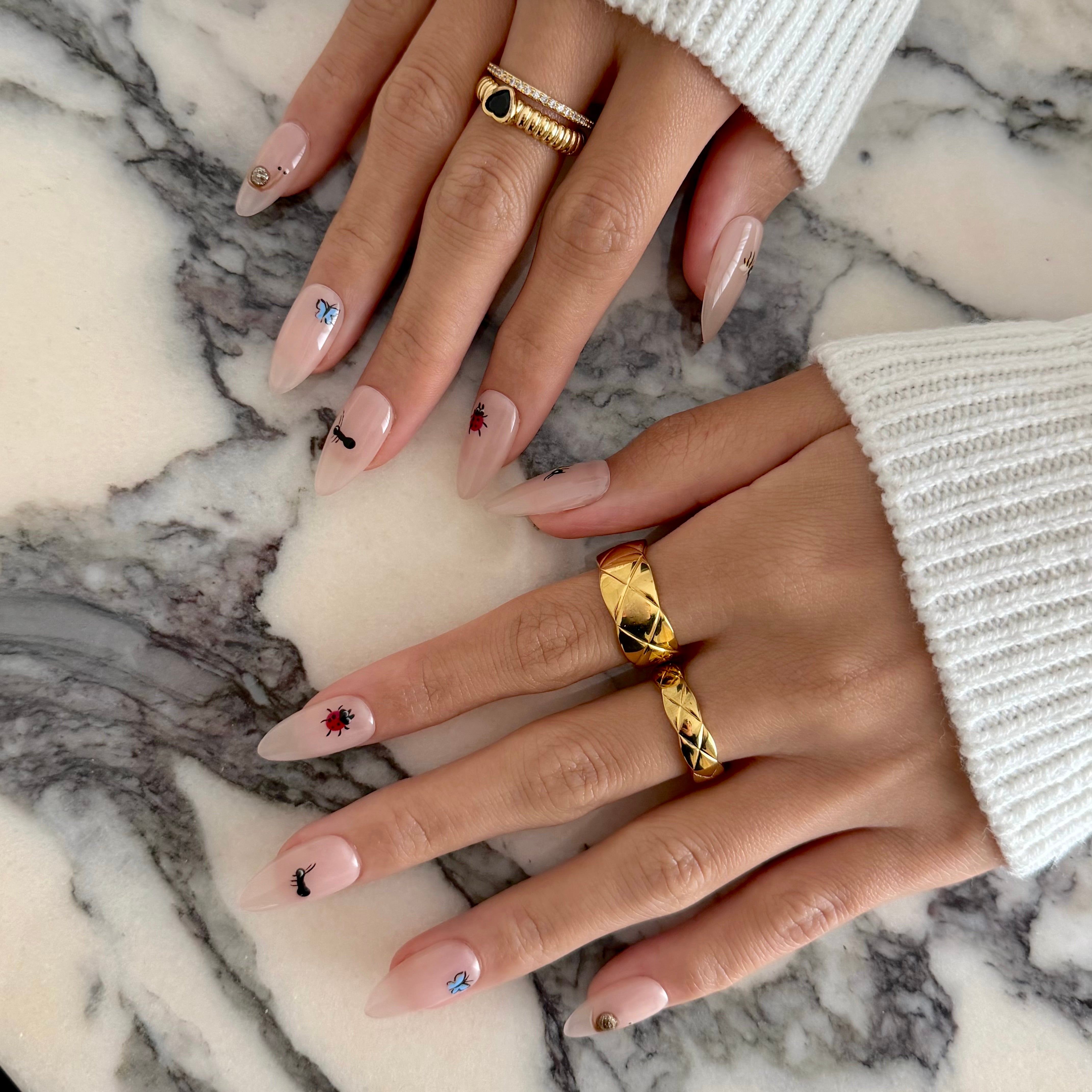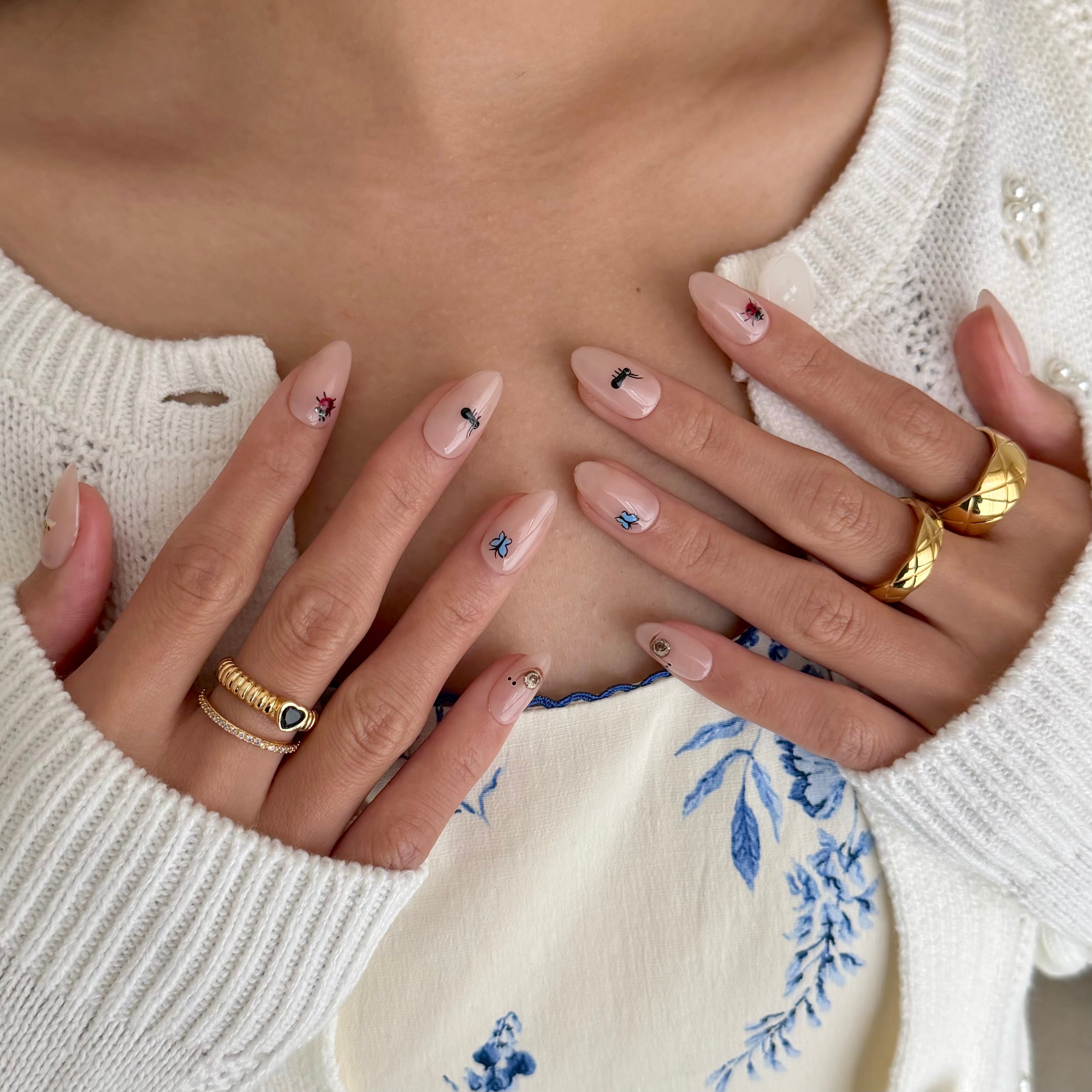 • Tiny Garden Guests: Each nail features a different hand‑painted critter—bright red ladybug, tiny ant, blue butterfly, golden snail, and a sweet little bee—arranged to feel playful yet minimal.