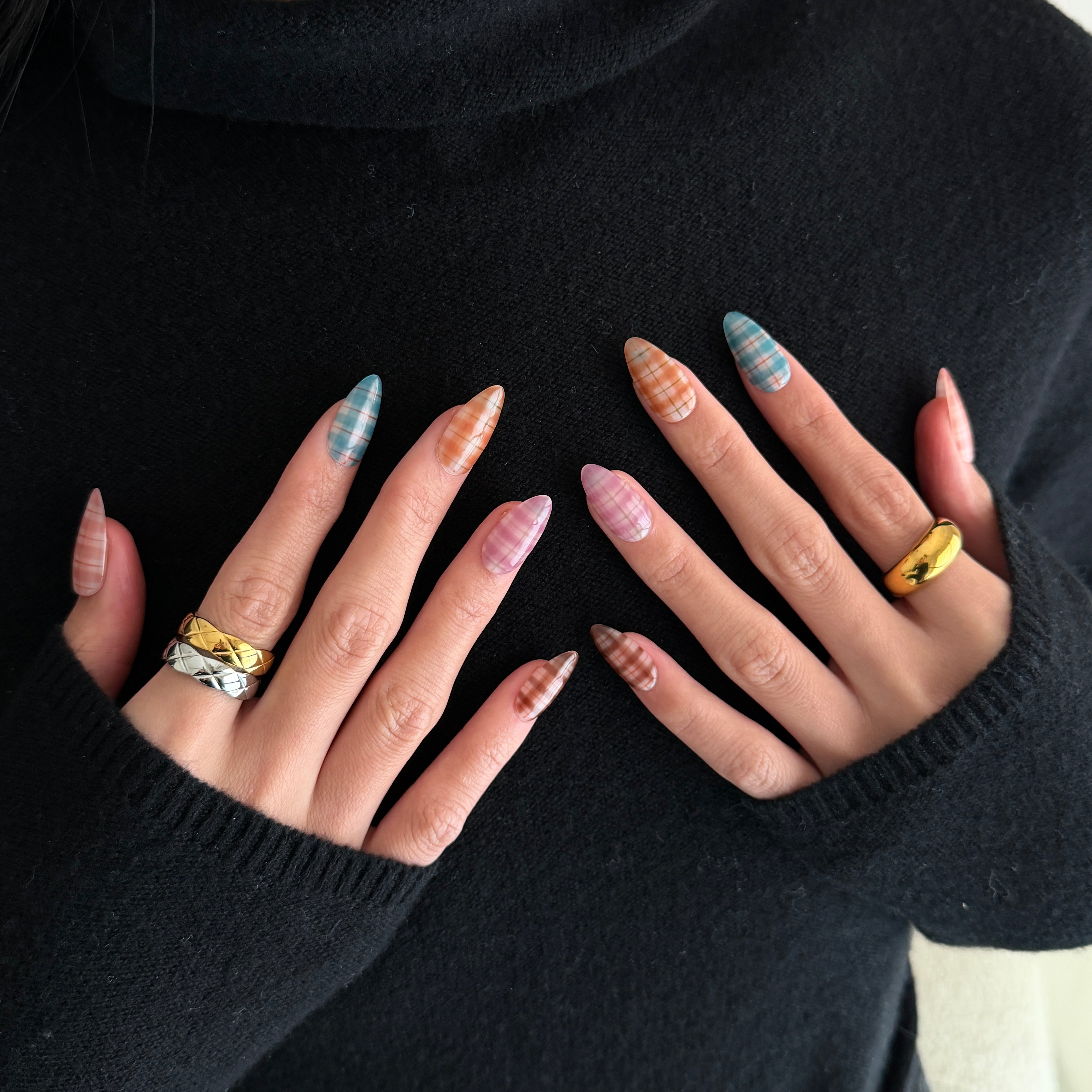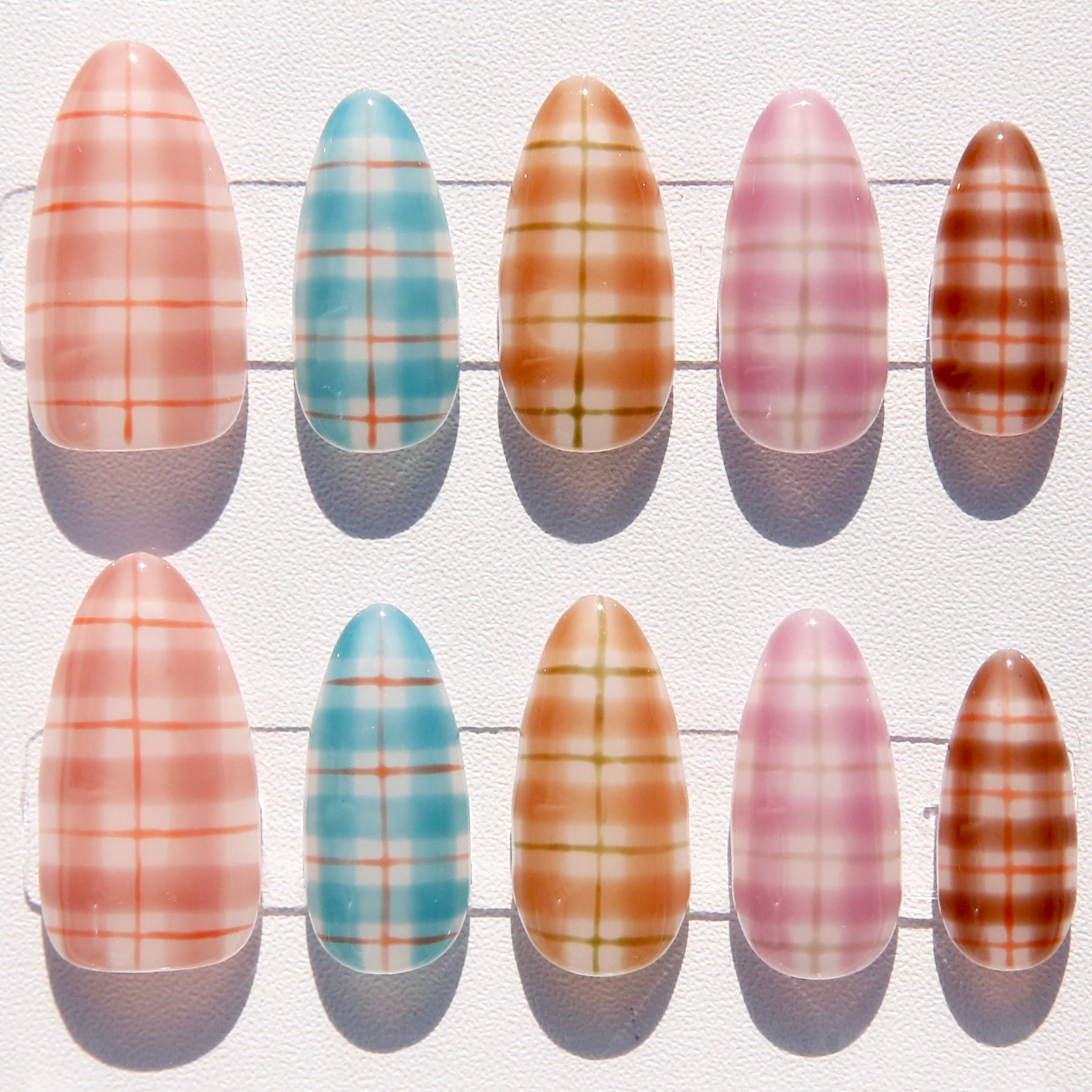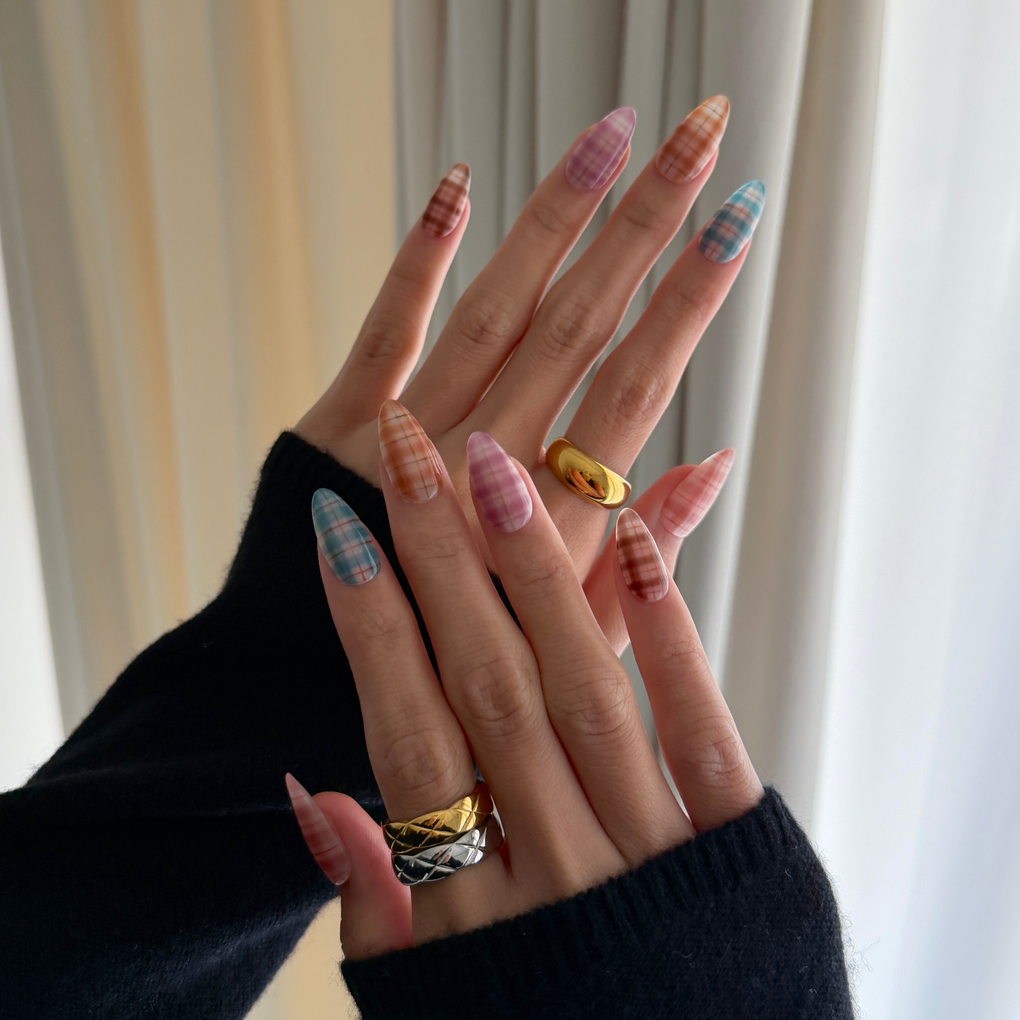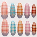 - Multi‑Tone Plaid: Each nail features its own sheer plaid color story for a curated, mix‑and‑match look inspired by celebrity plaid manicures.