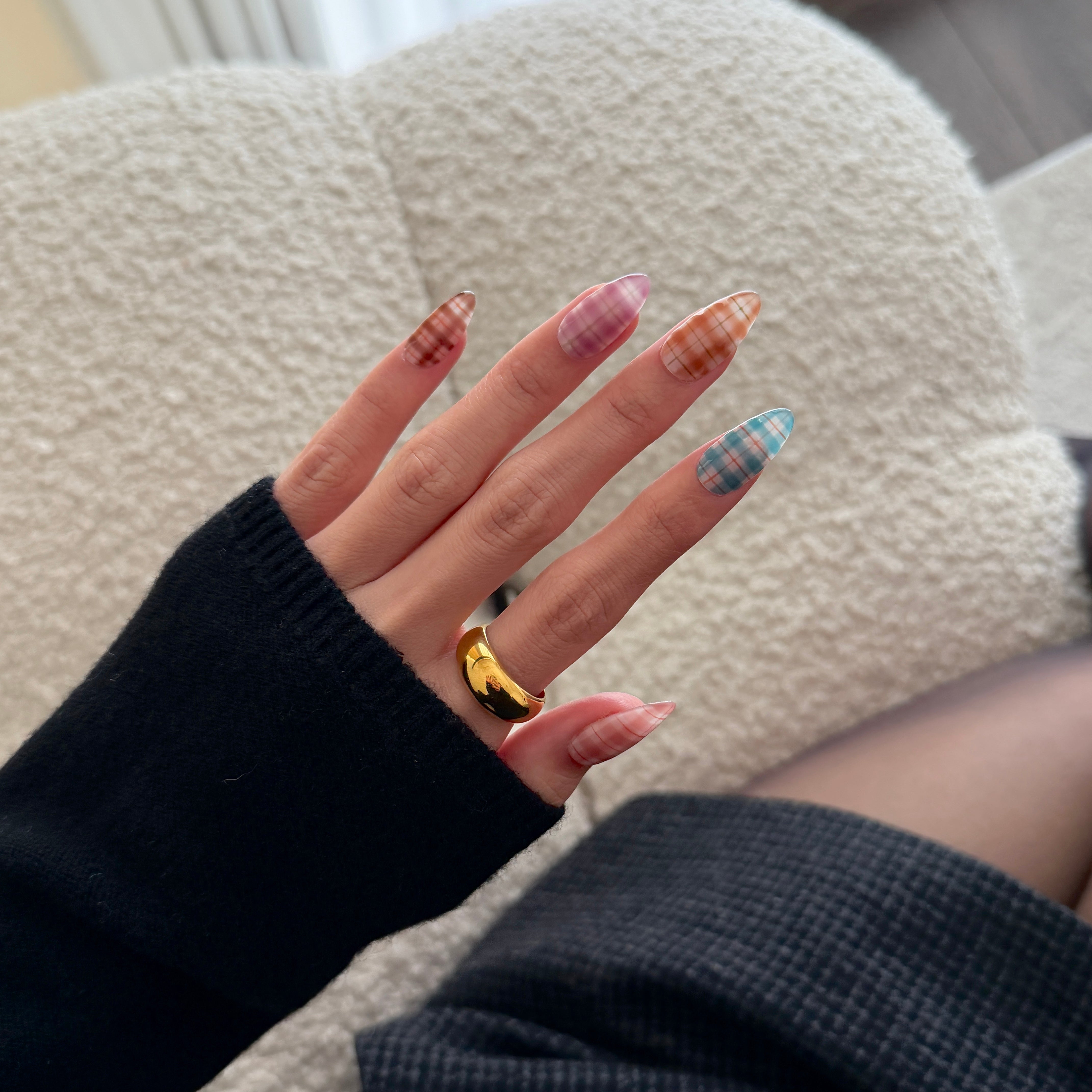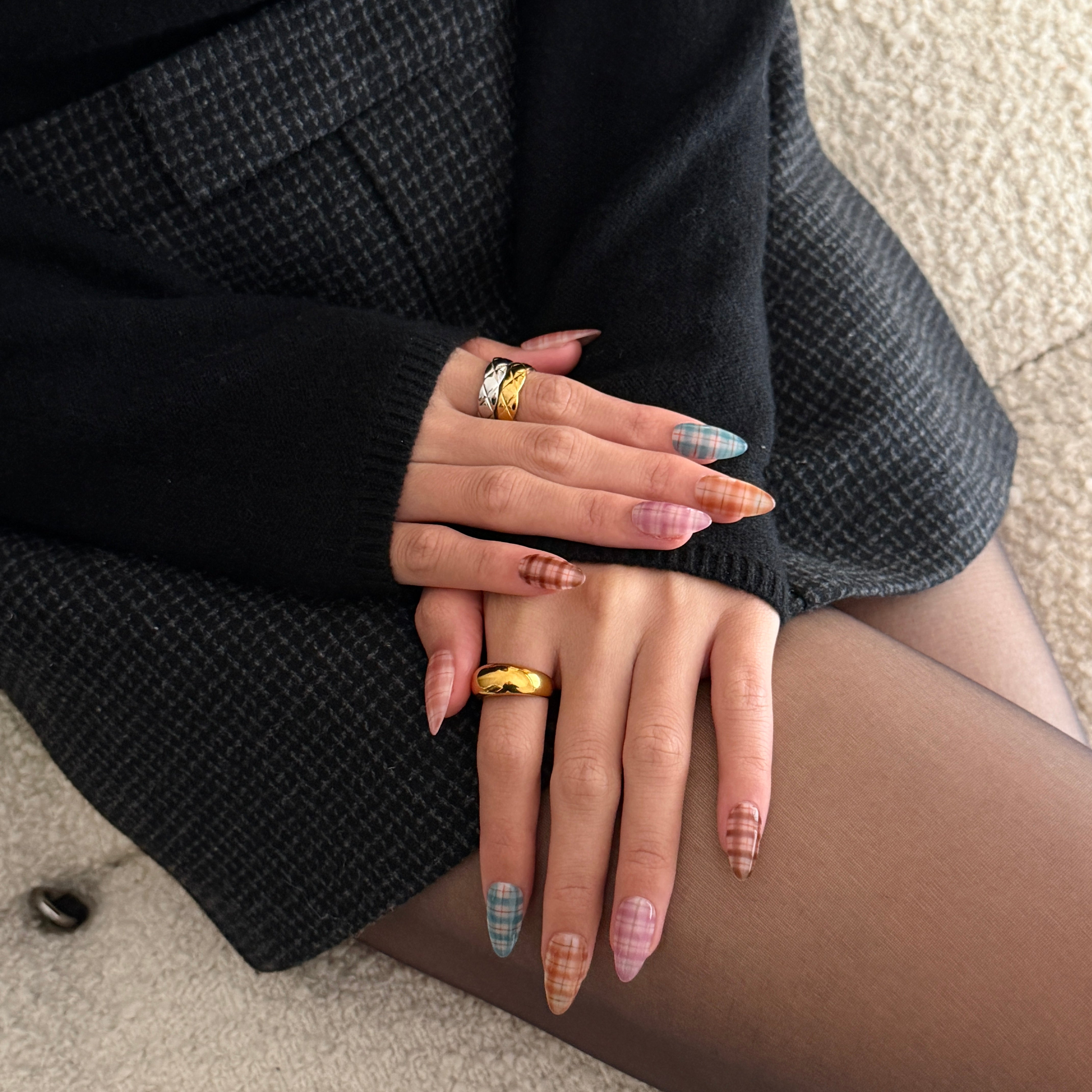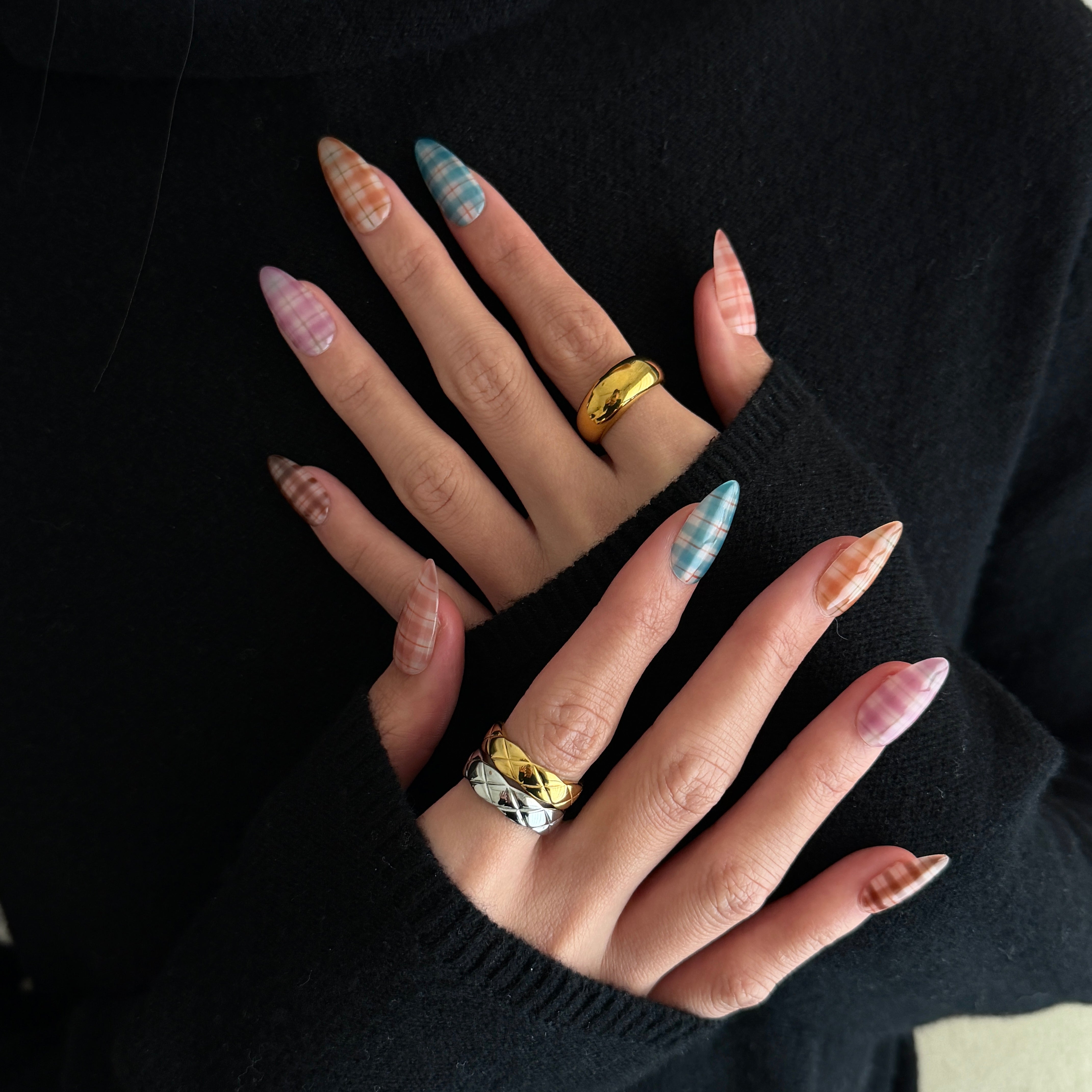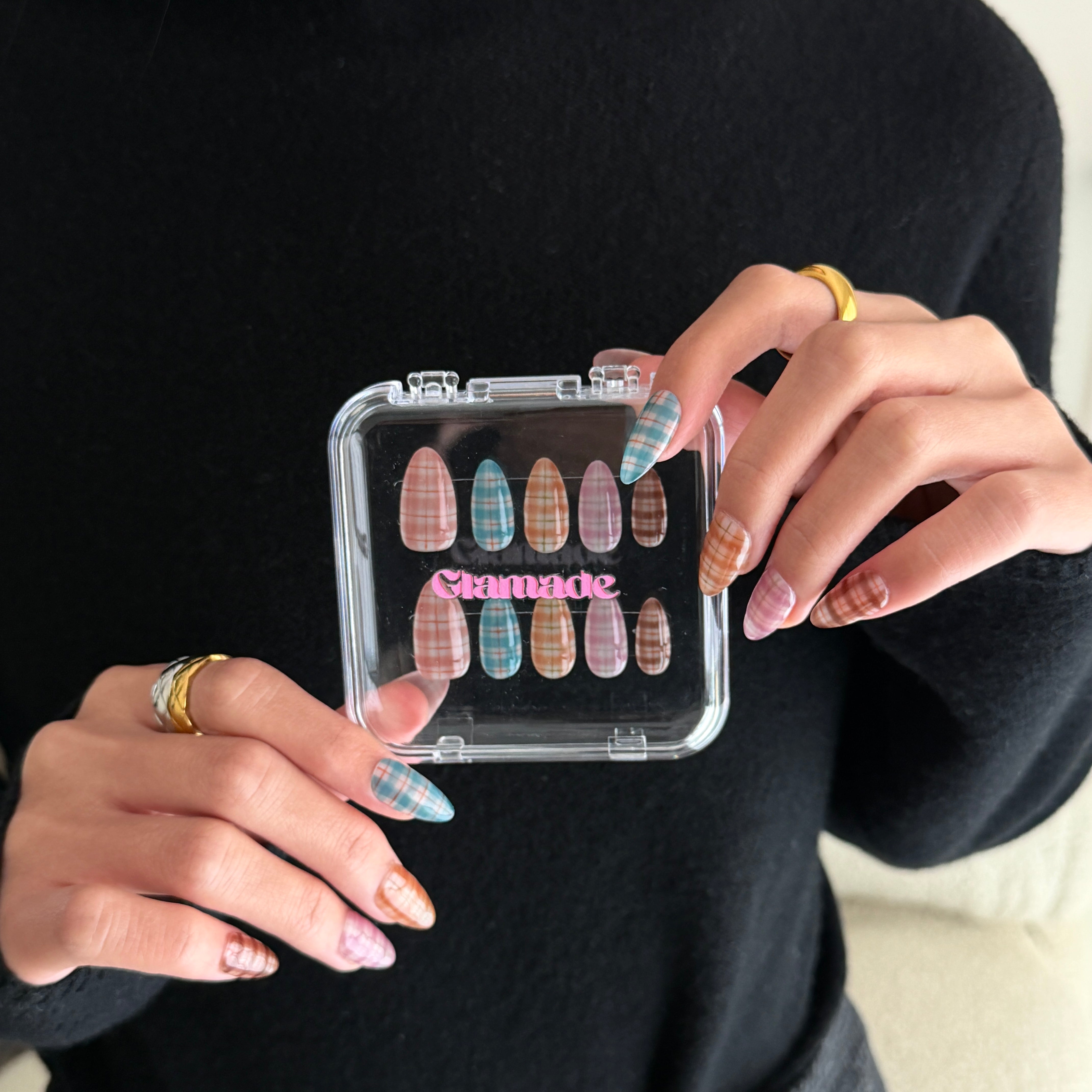 - Multi‑Tone Plaid: Each nail features its own sheer plaid color story for a curated, mix‑and‑match look inspired by celebrity plaid manicures.