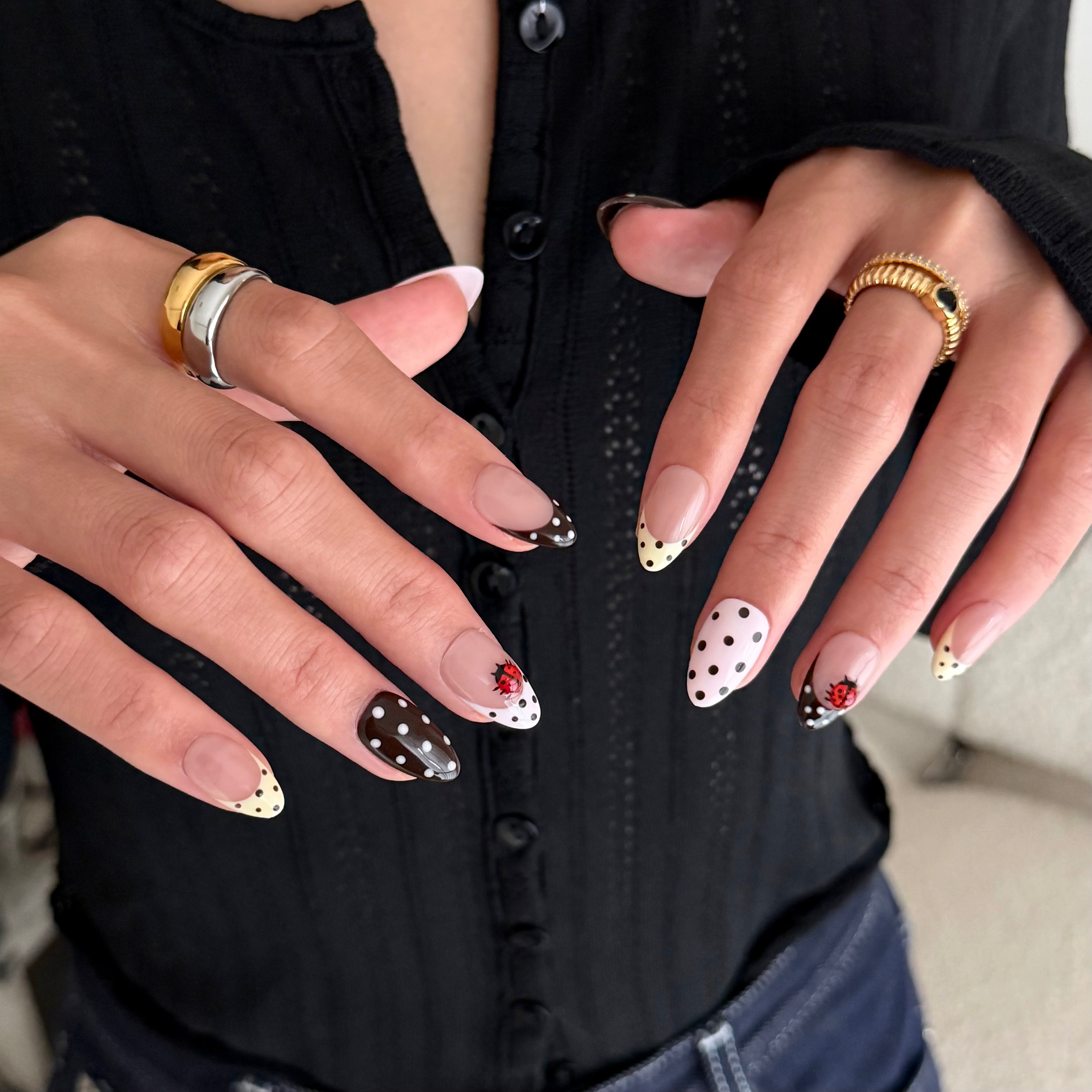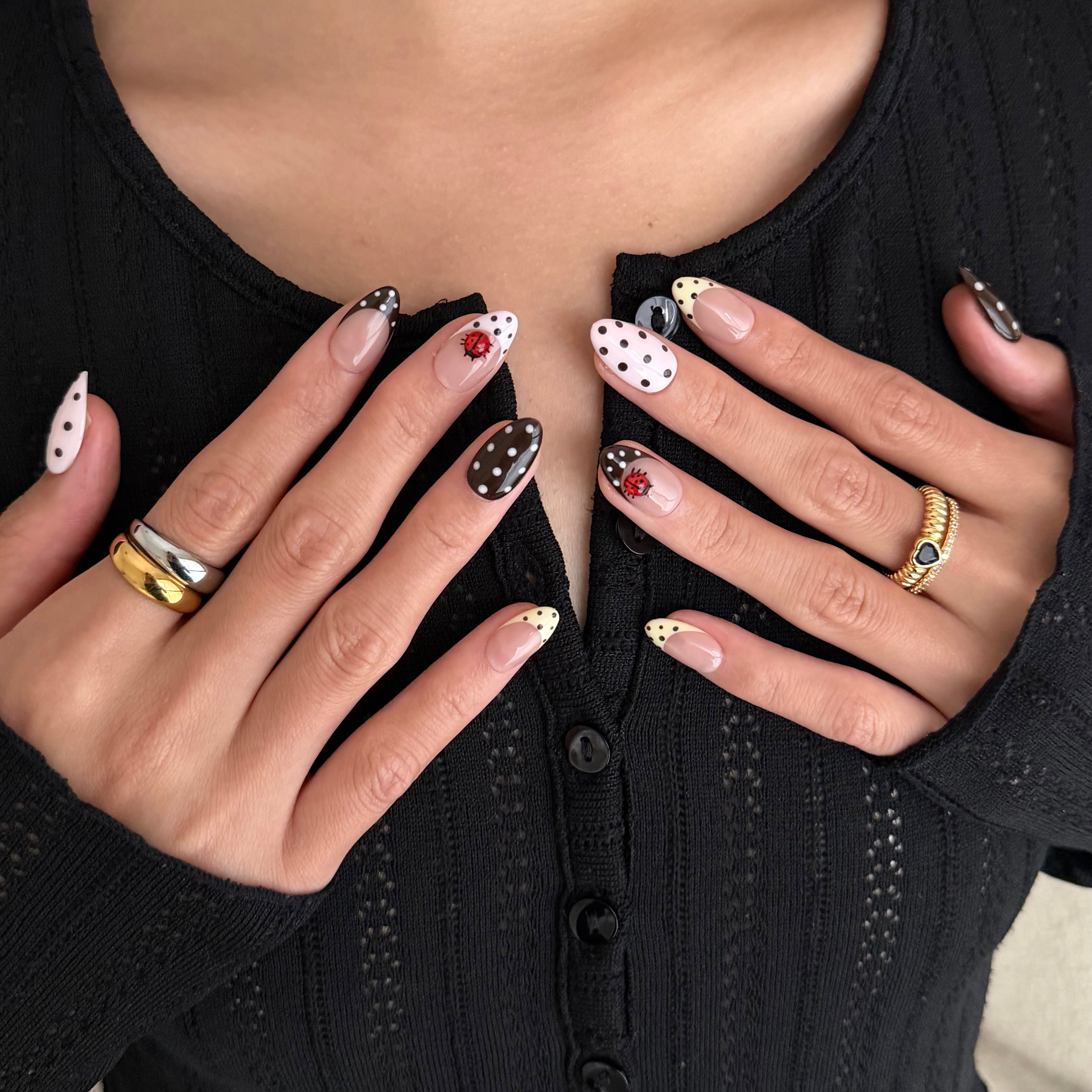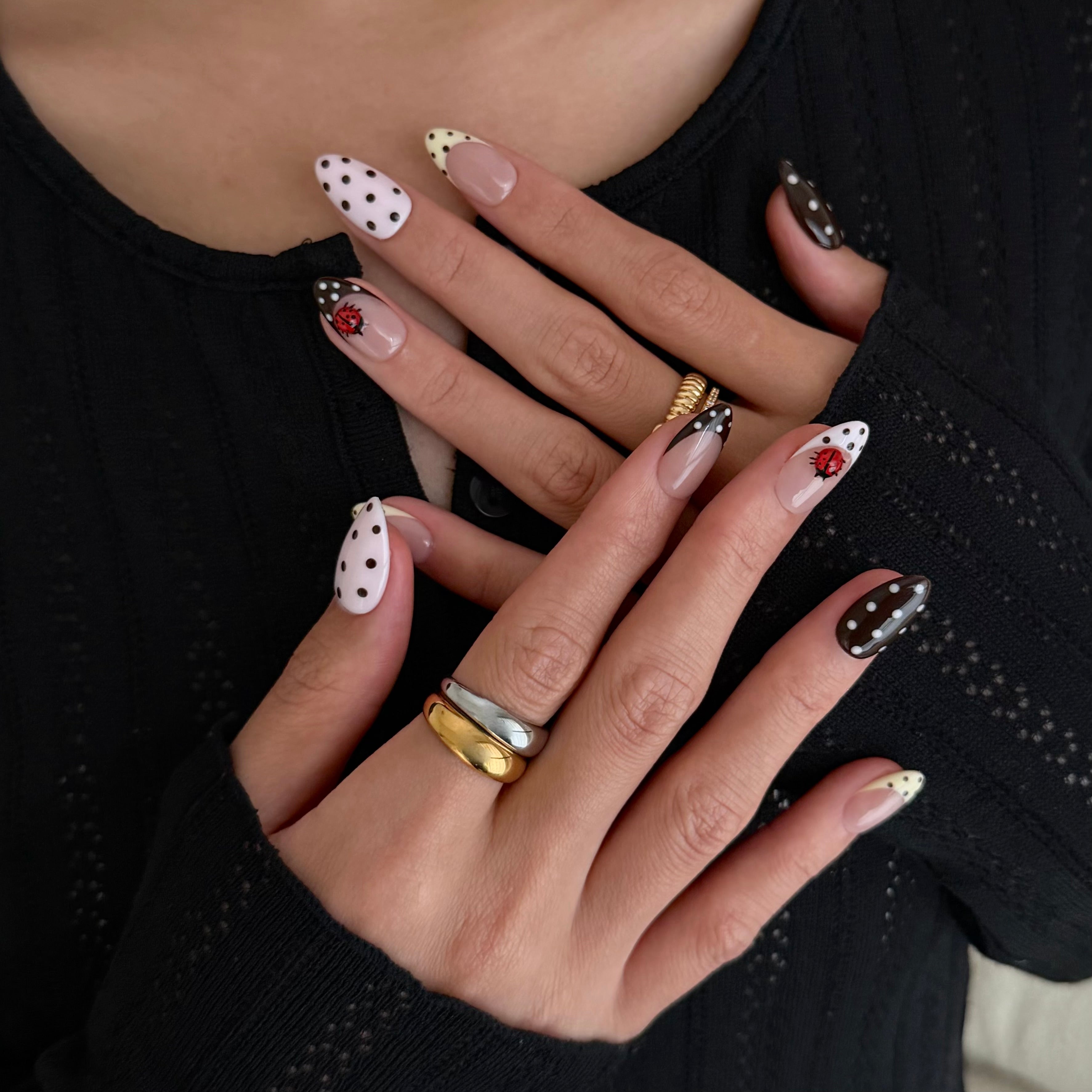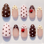 Ladybug Picnic is a sweet, storybook take on spring—think gingham blankets, chocolate-dipped treats, and tiny ladybugs landing on your dessert. This almond‑shaped handmade press‑on set pairs a soft sheer nude base with blush and cocoa polka dots and tiny red ladybugs for a look that’s playful, nostalgic, and still beautifully polished.