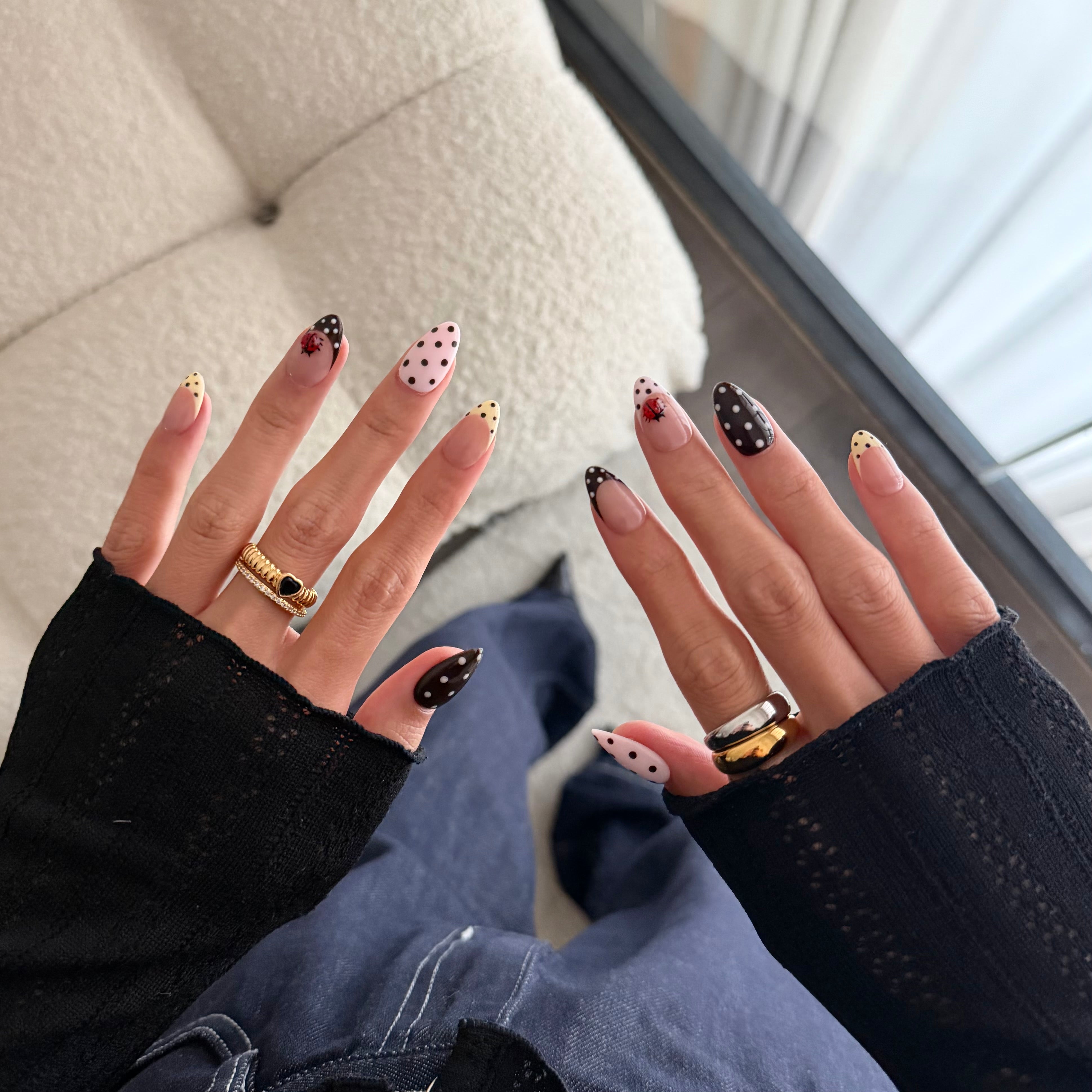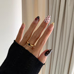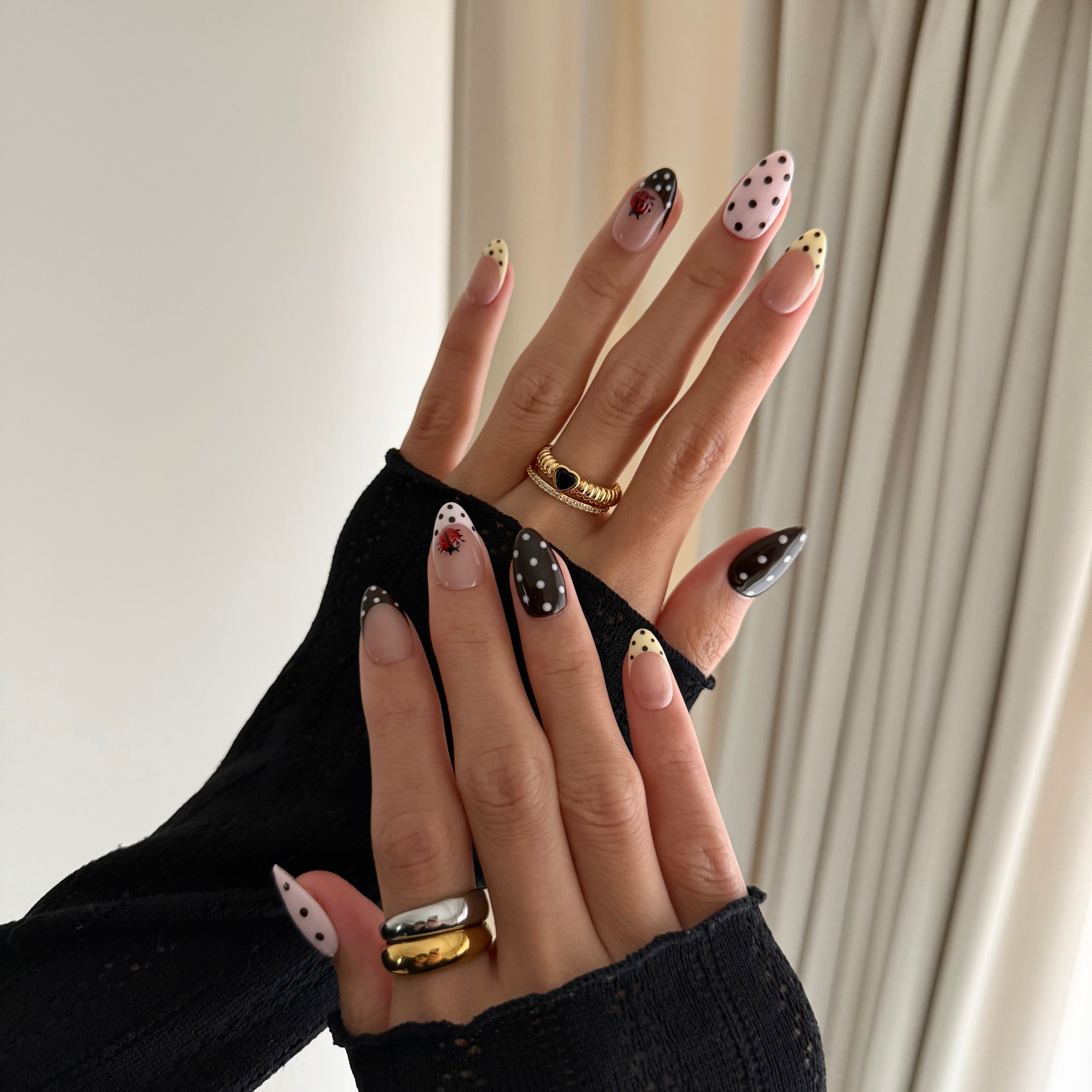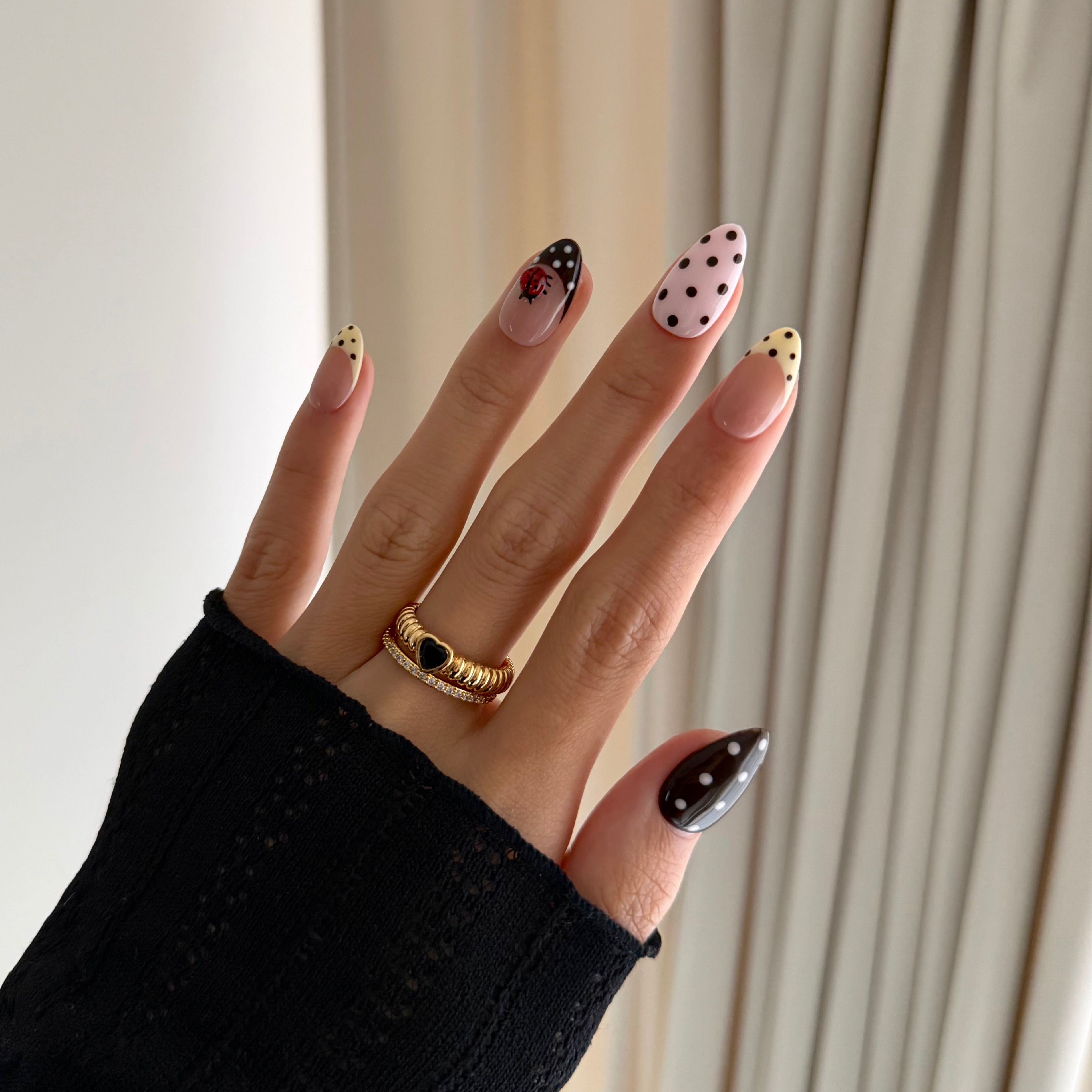 Ladybug Picnic is a sweet, storybook take on spring—think gingham blankets, chocolate-dipped treats, and tiny ladybugs landing on your dessert. This almond‑shaped handmade press‑on set pairs a soft sheer nude base with blush and cocoa polka dots and tiny red ladybugs for a look that’s playful, nostalgic, and still beautifully polished.