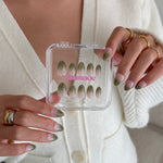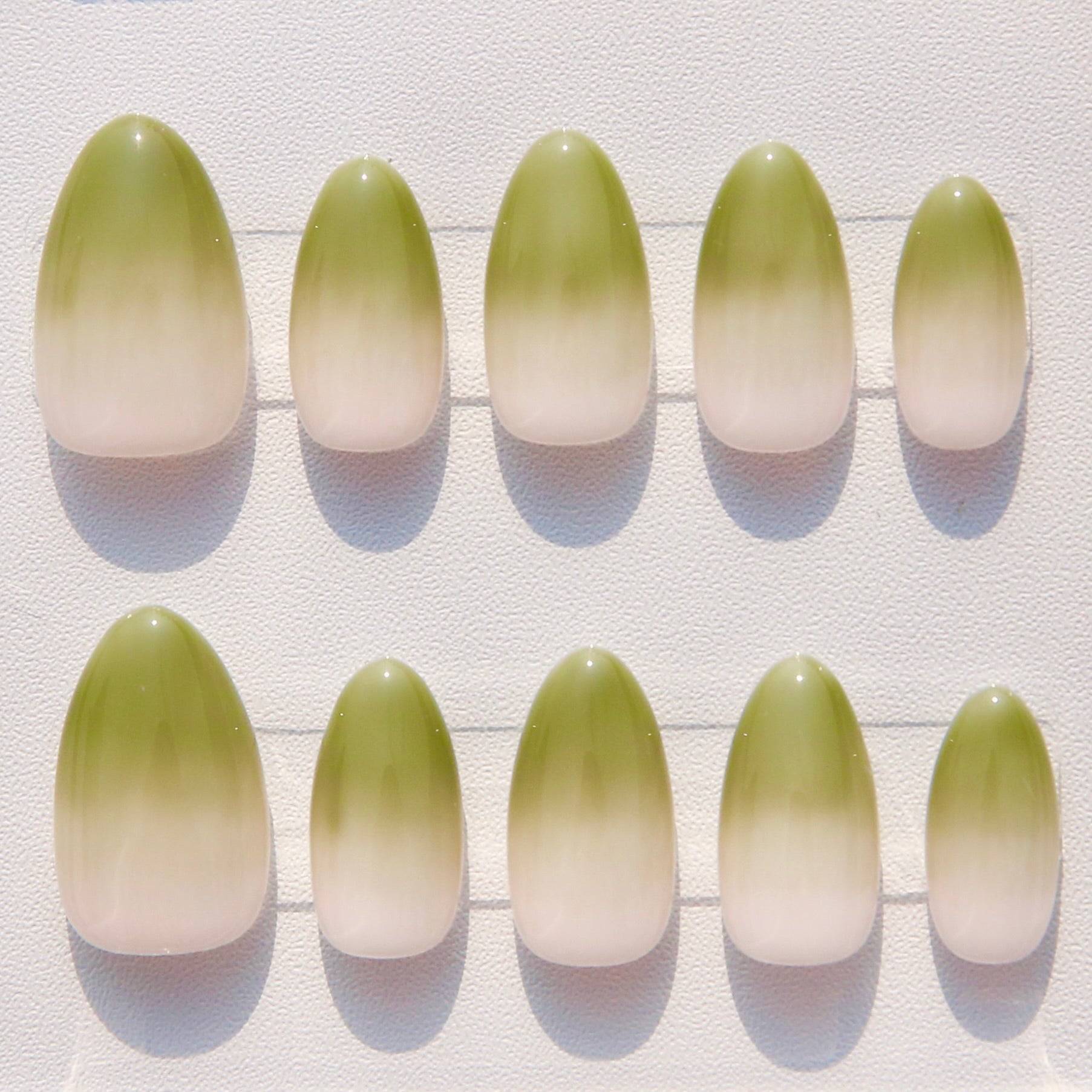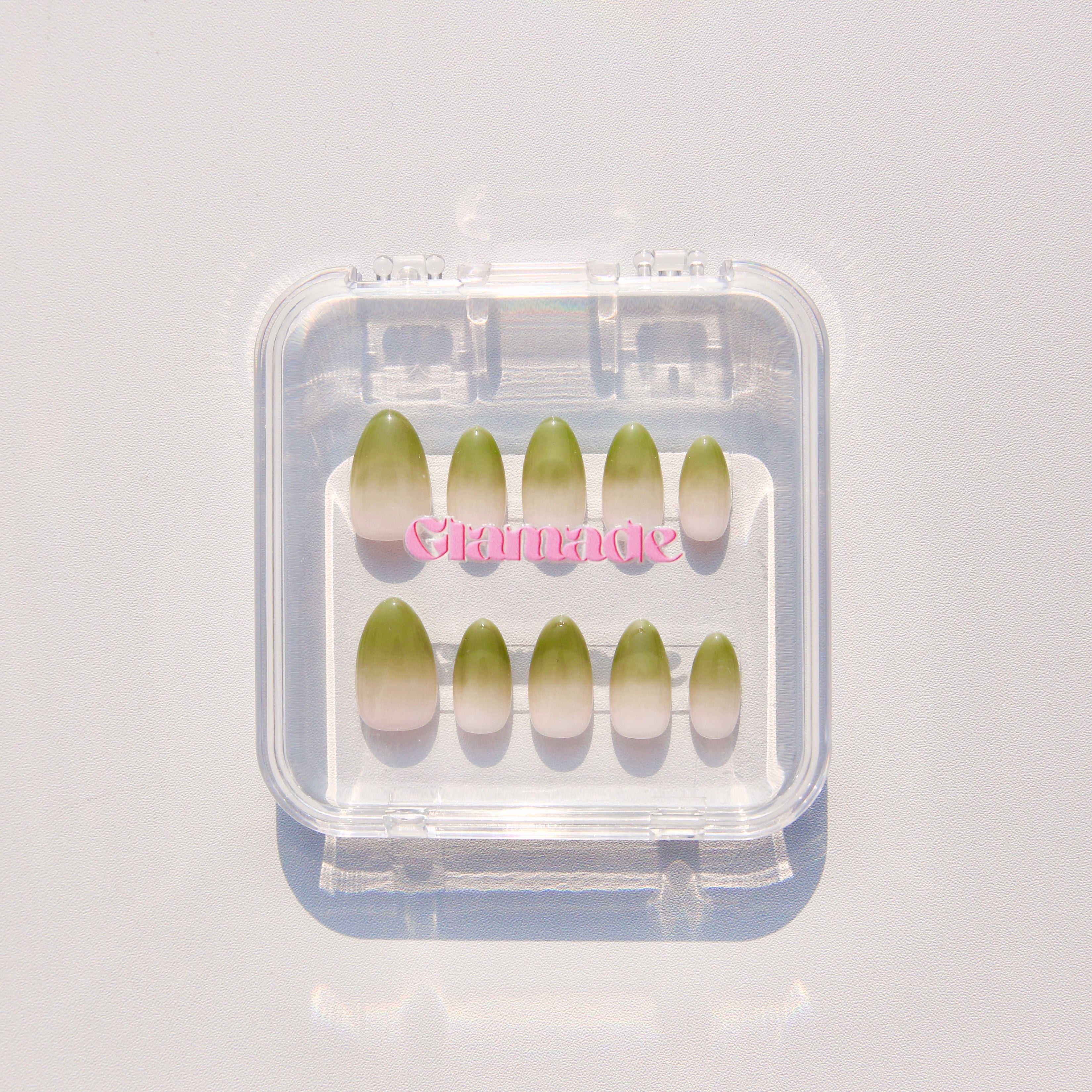 Matcha Cloud is a cool, creamy wash of color that feels like your favorite iced matcha in nail form. This almond‑shaped handmade press‑on set features a soft, sheer pink base that melts upward into a glossy matcha‑green tip, creating a modern, gradient “tea stain” effect that’s fresh, minimal, and quietly luxe.