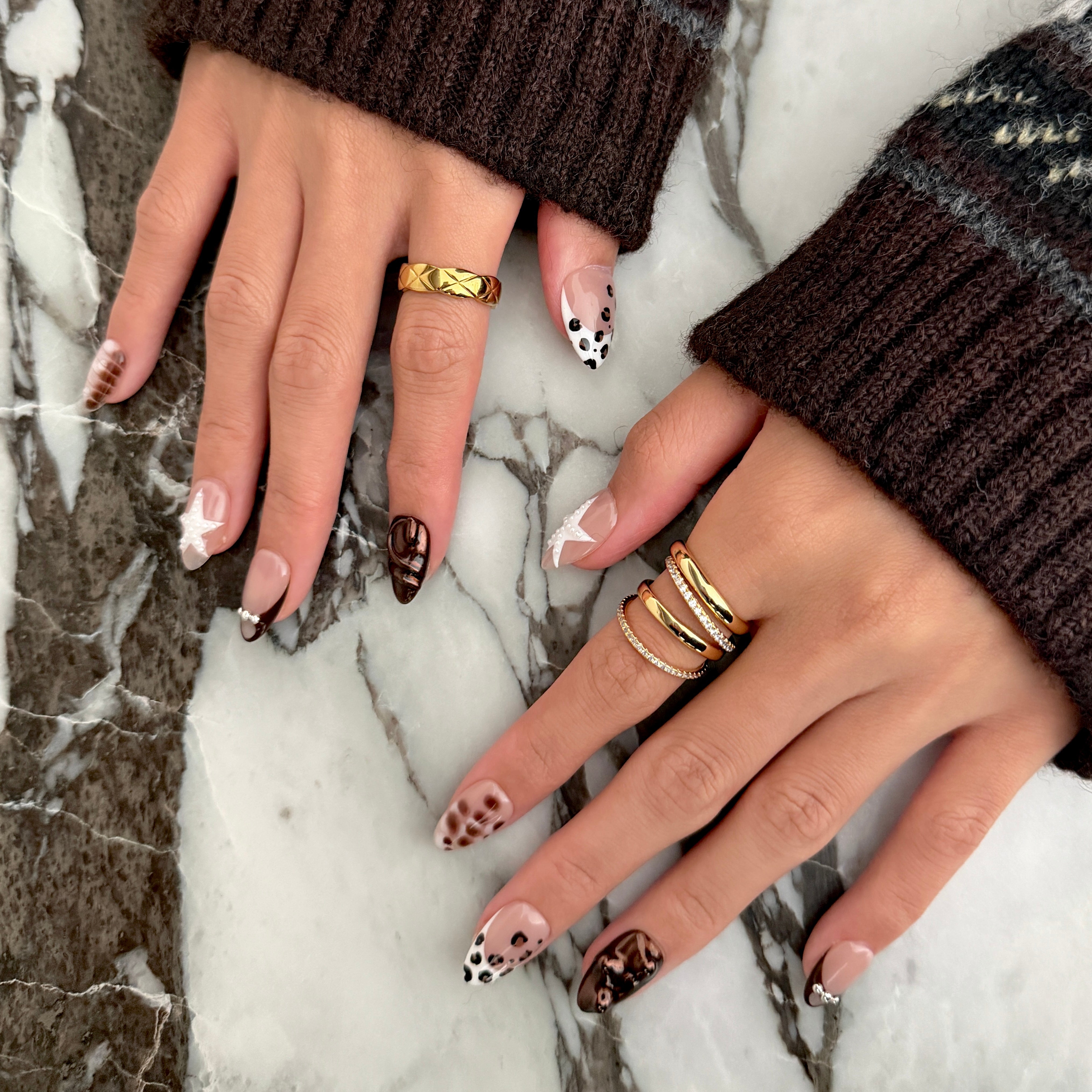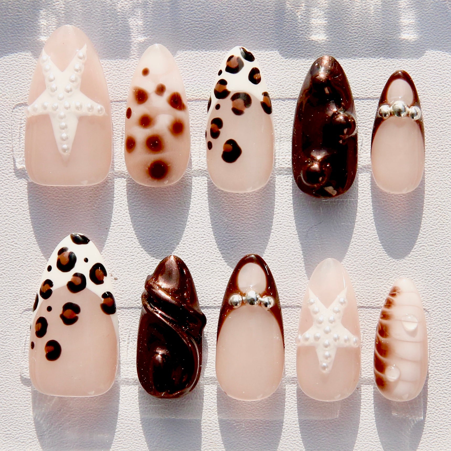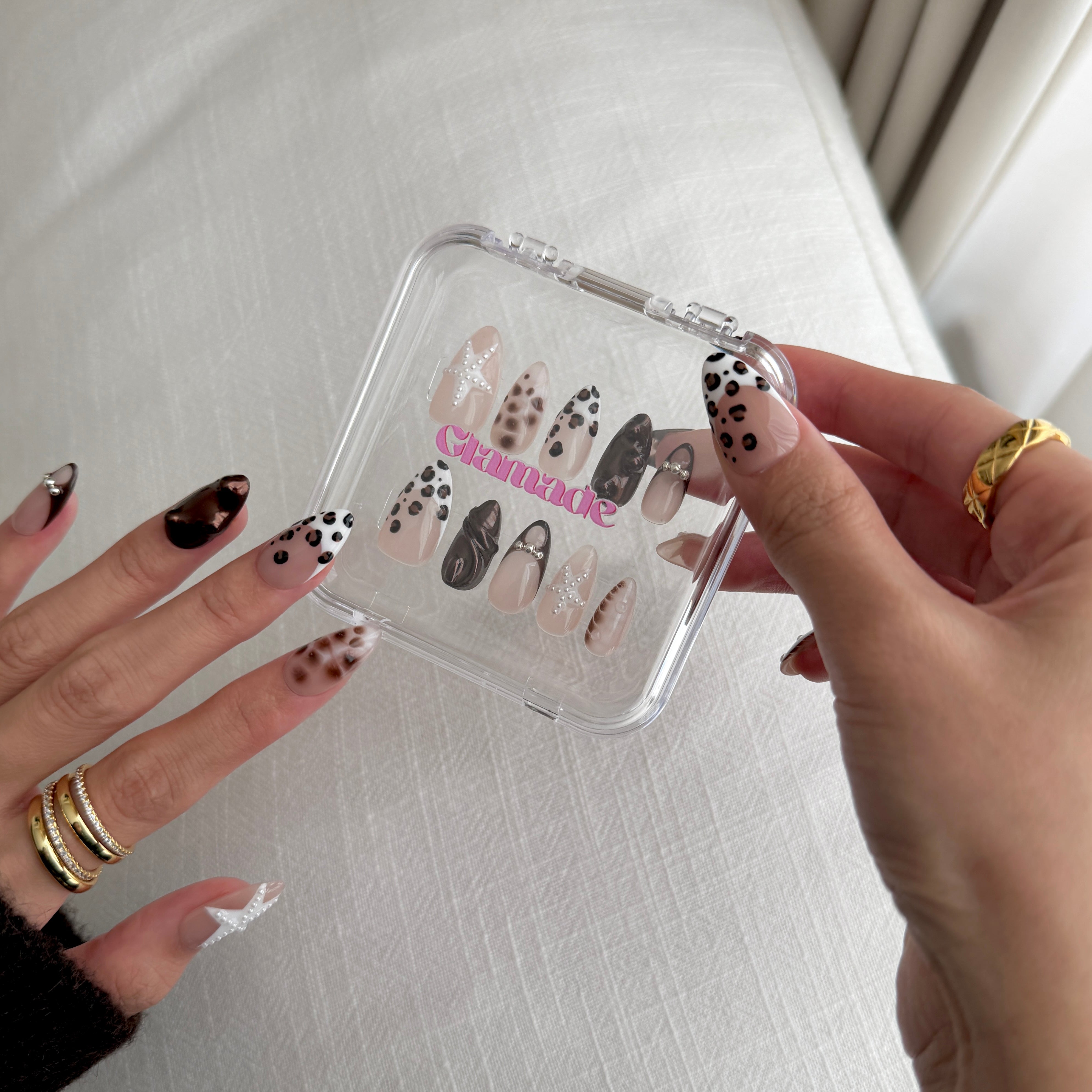 Experience the magic of a celestial night with "Under The Stars," a captivating handmade press on nail design that blends elegance with a touch of the wild. This style features a unique combination of textures and patterns, perfect for those who dare to shine.