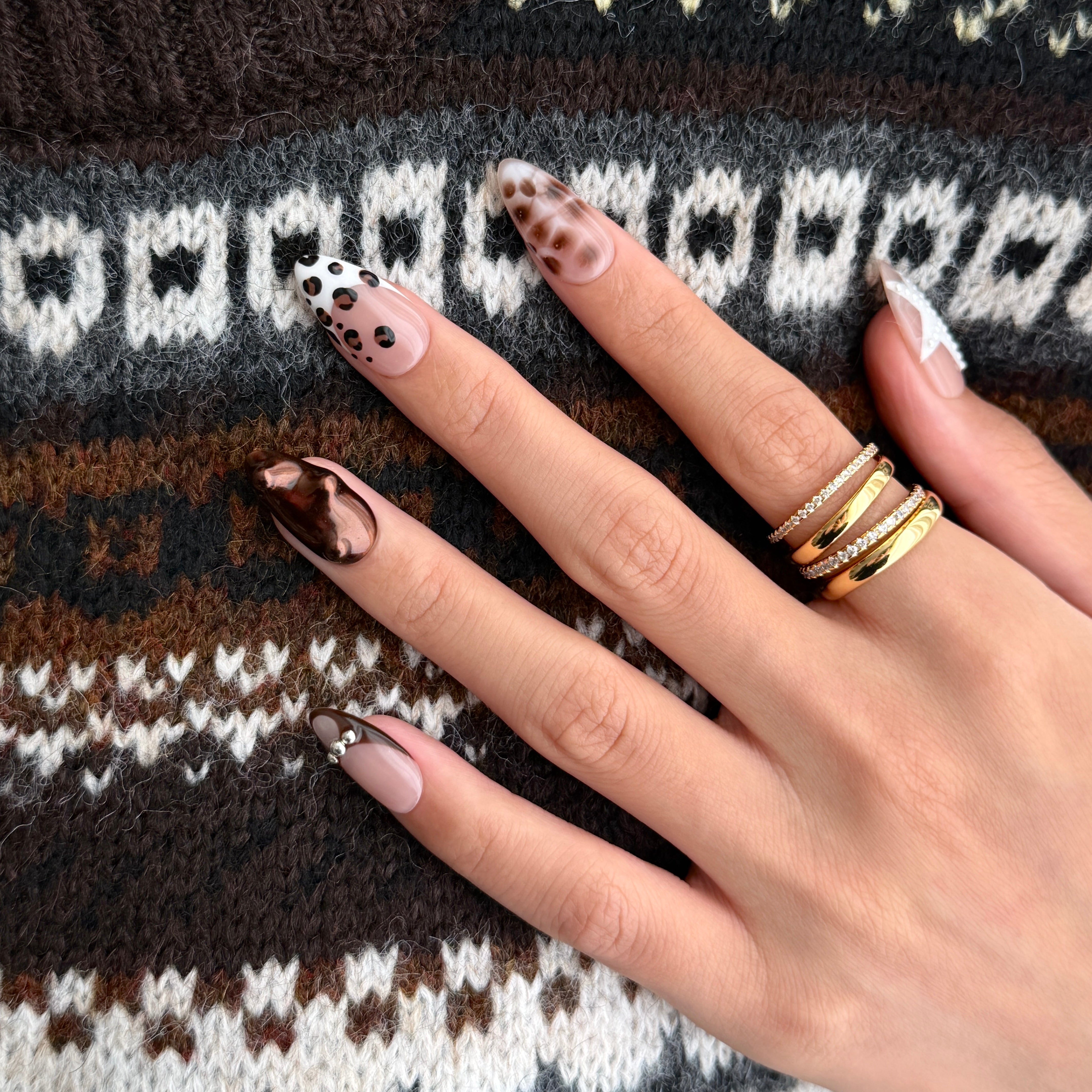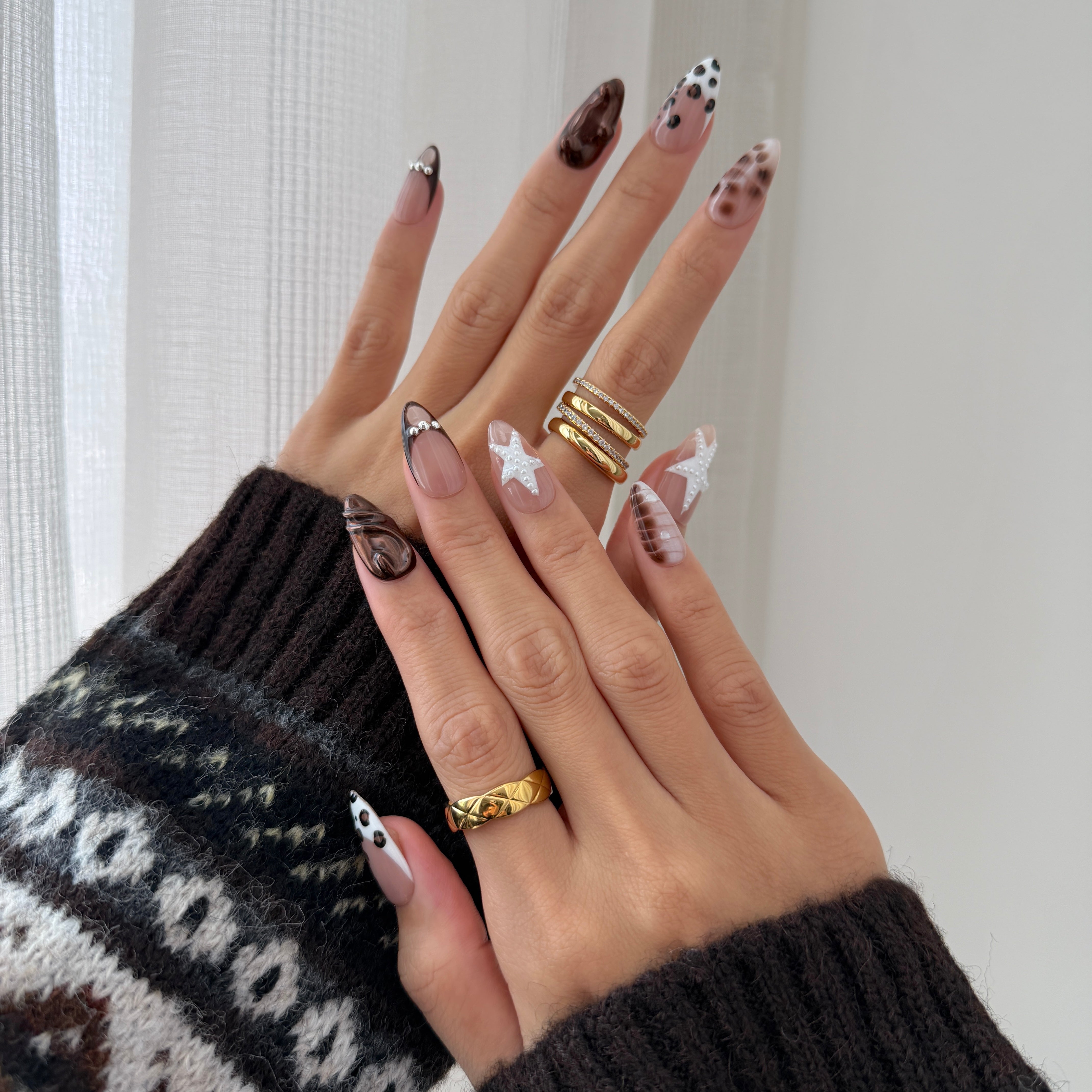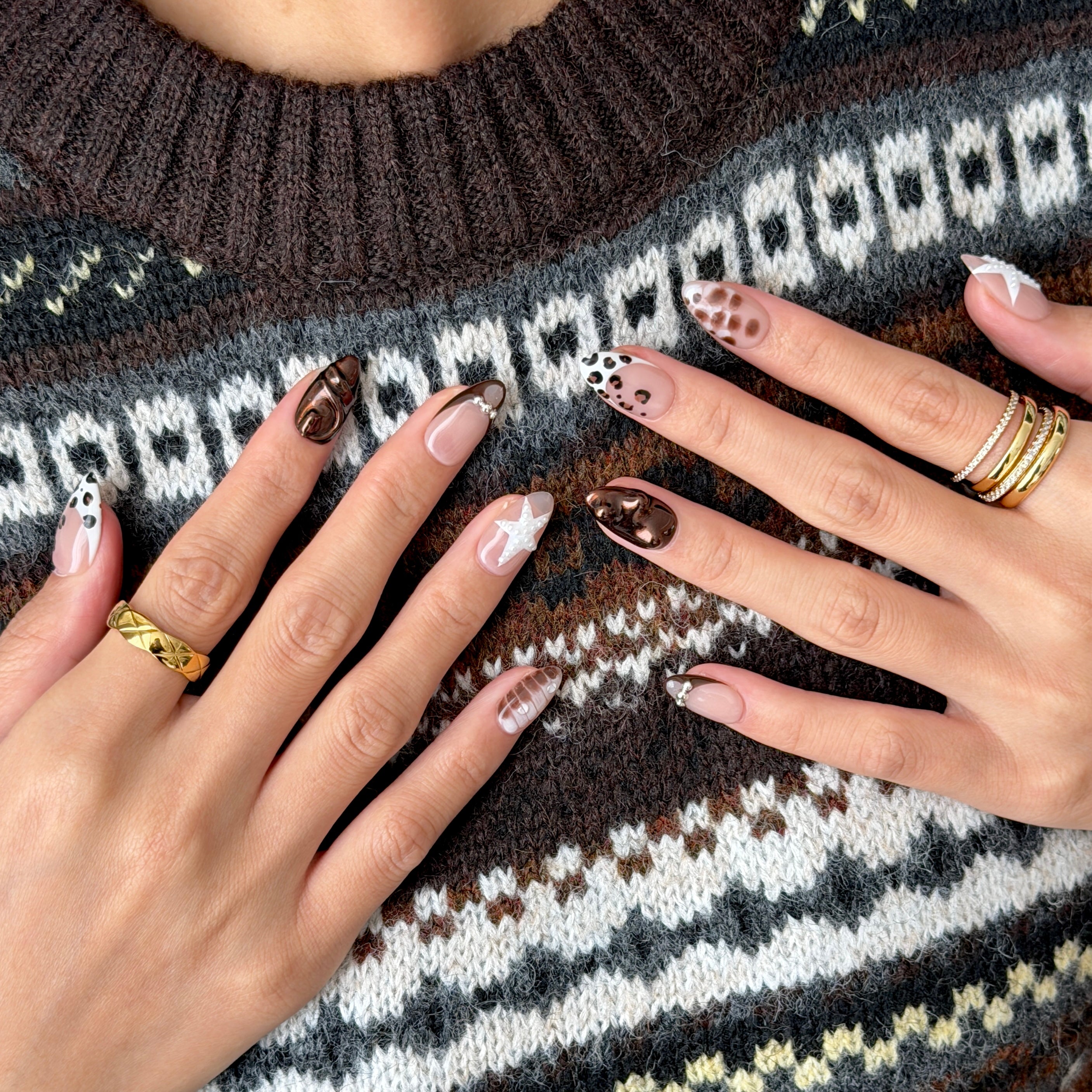 Experience the magic of a celestial night with "Under The Stars," a captivating handmade press on nail design that blends elegance with a touch of the wild. This style features a unique combination of textures and patterns, perfect for those who dare to shine.