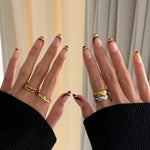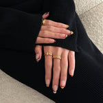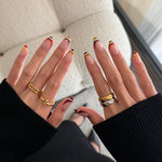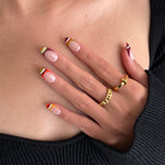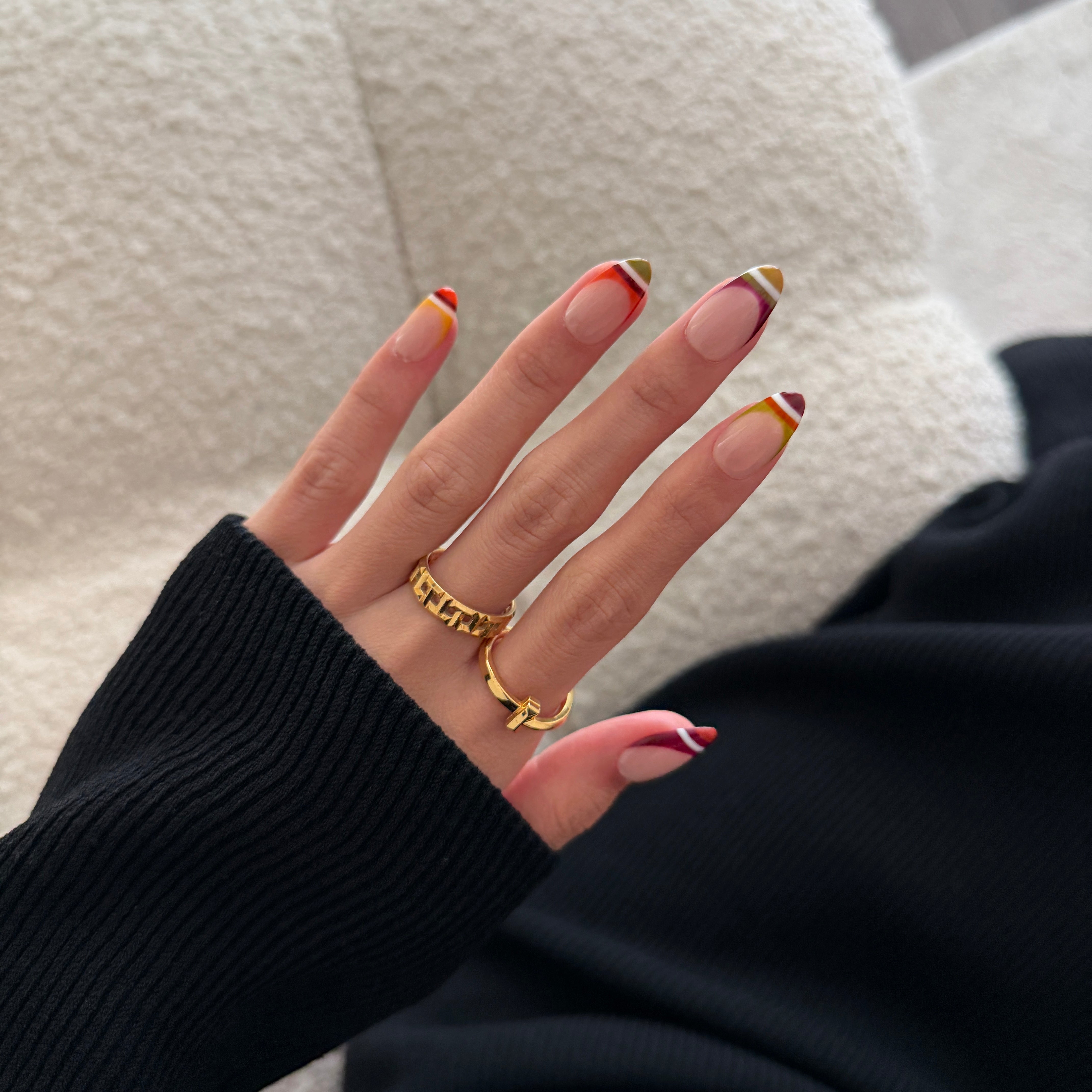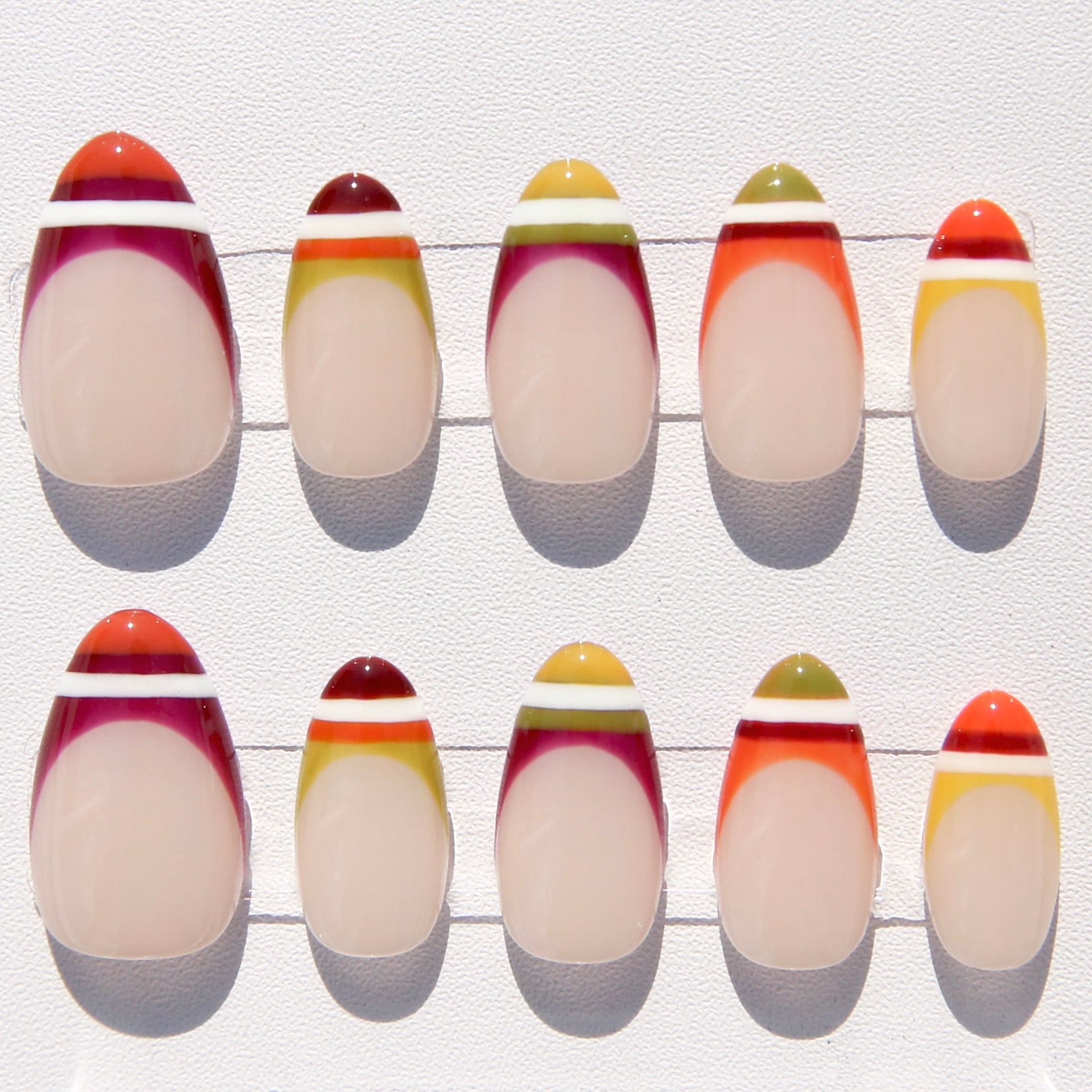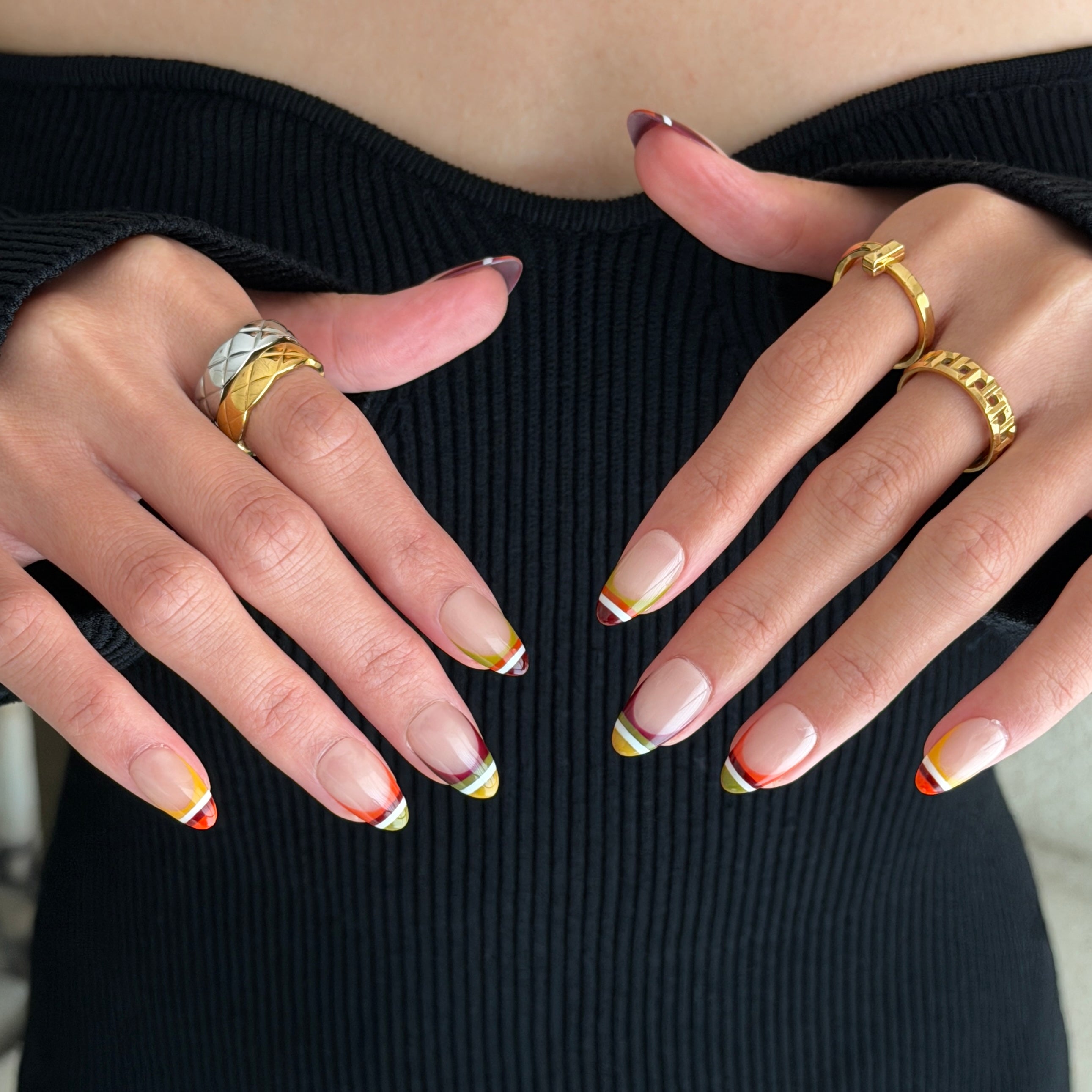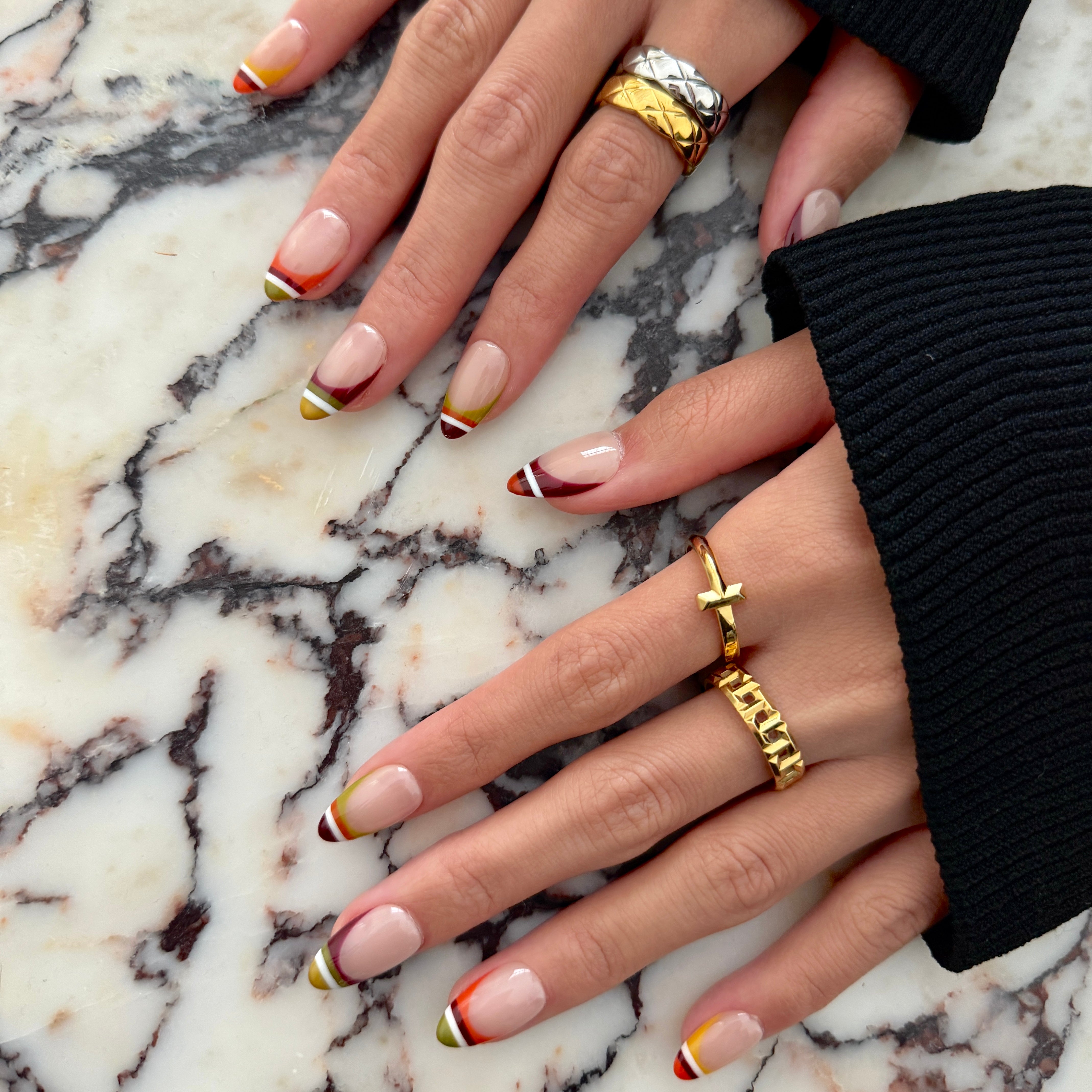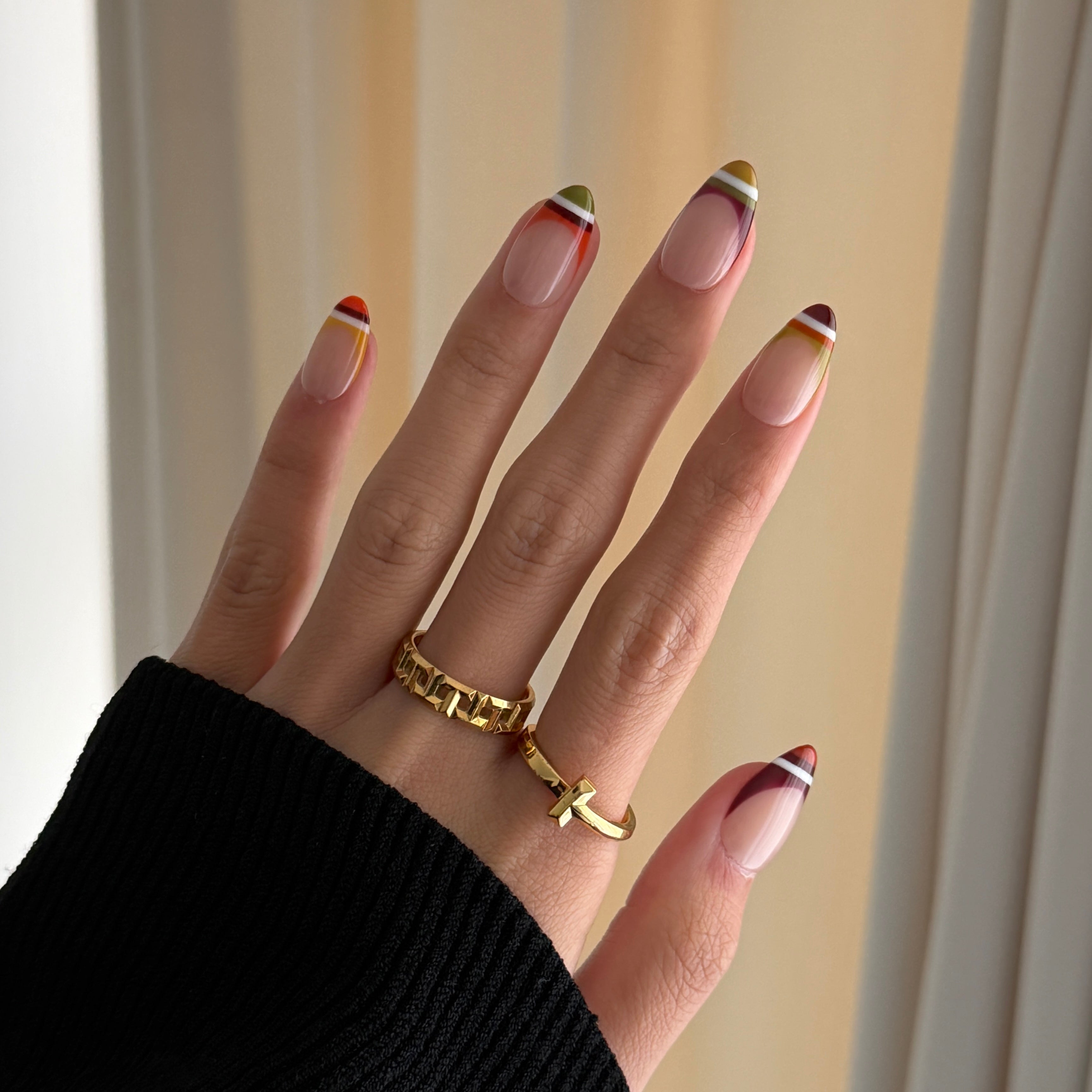- Multi‑Tone Tipped Stripes: Each nail features stacked, horizontal bands in warm, autumnal hues that create a refined, color‑blocked edge without feeling loud or seasonal.