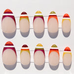 Vintage Stripes is a warm, retro‑inspired take on modern color blocking. This handcrafted press‑on set pairs a soft, milky nude base with slim, multi‑color bands that wrap the tips in rich berry, saffron, moss, plum, and cream. The result is a polished yet playful look—like a curated row of vintage knitwear translated onto each fingertip.