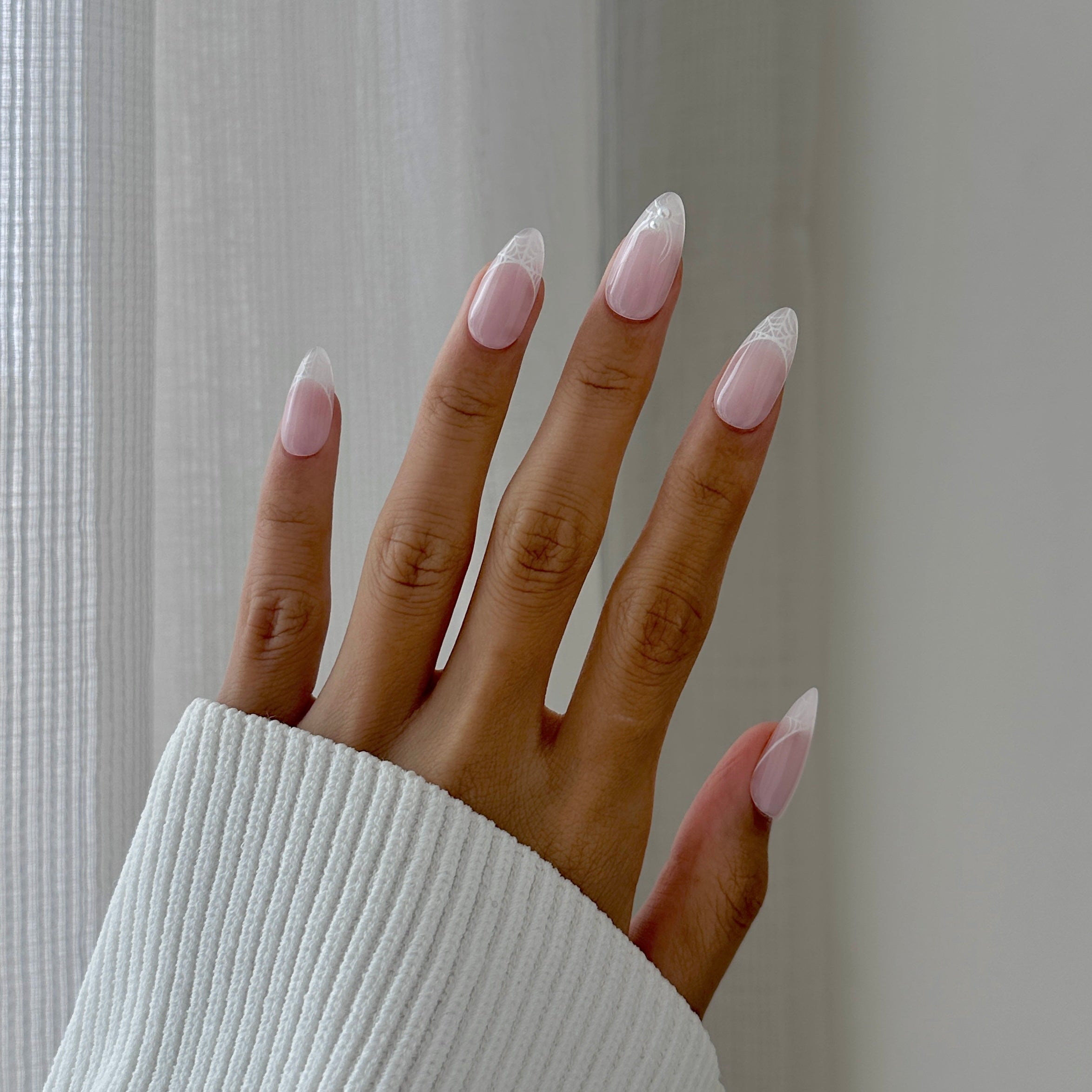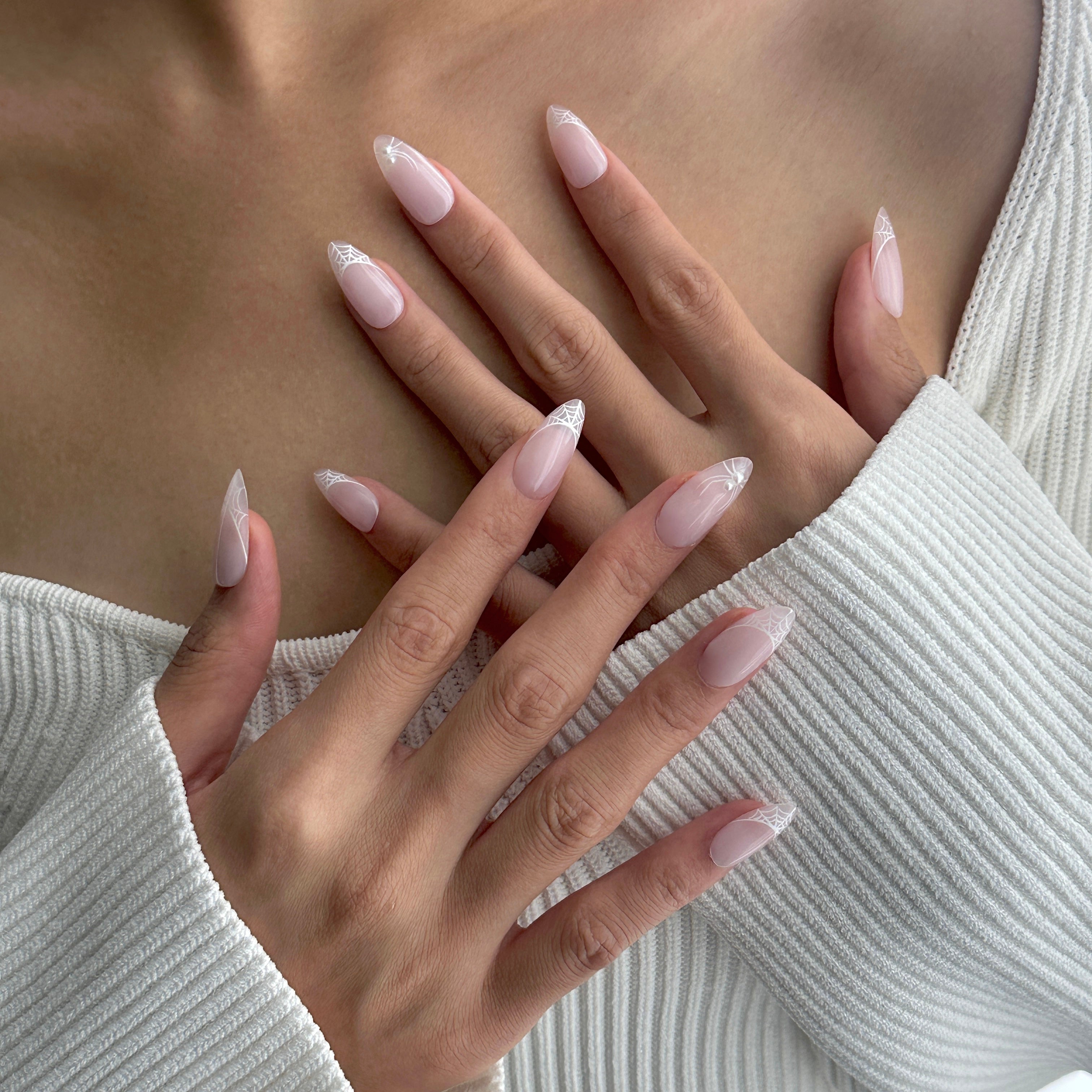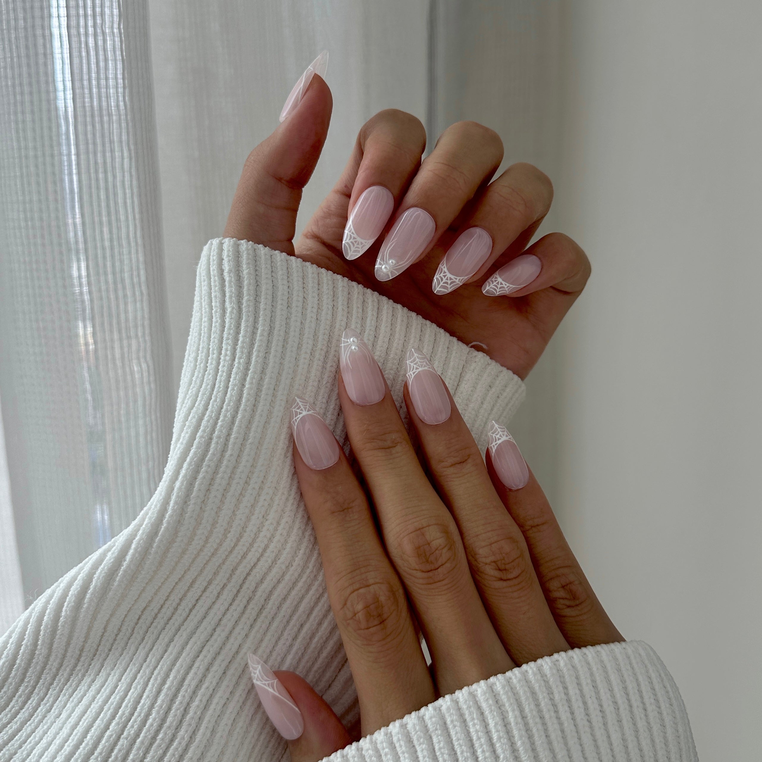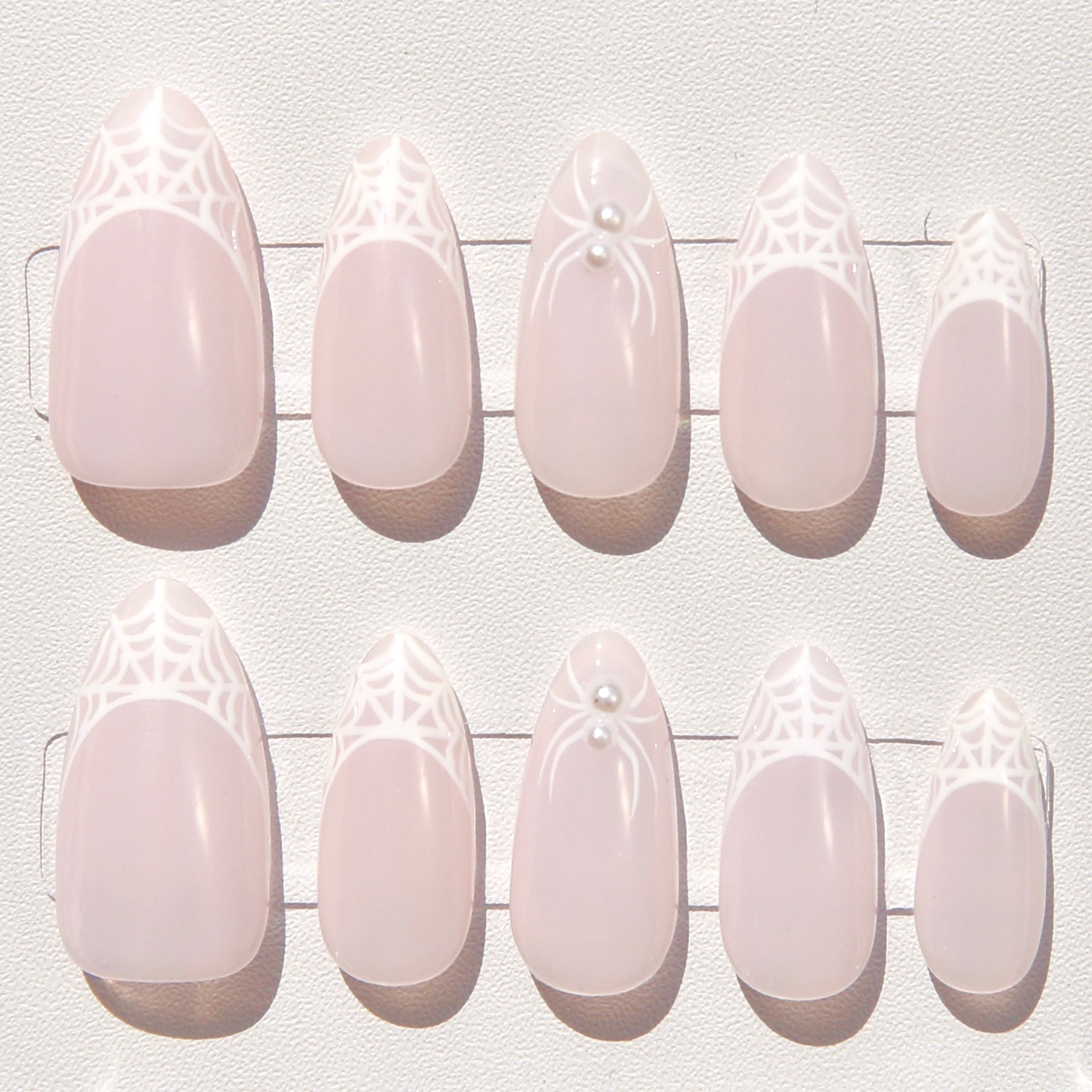 Introducing Madame Web: an exquisite blend of elegance and intrigue, perfect for the season. These handmade press-on nails feature delicate white spider web designs on a soft nude base, capturing a sophisticated yet mysterious allure. The long almond shape adds a touch of femininity, making them ideal for those who seek a refined Halloween look.