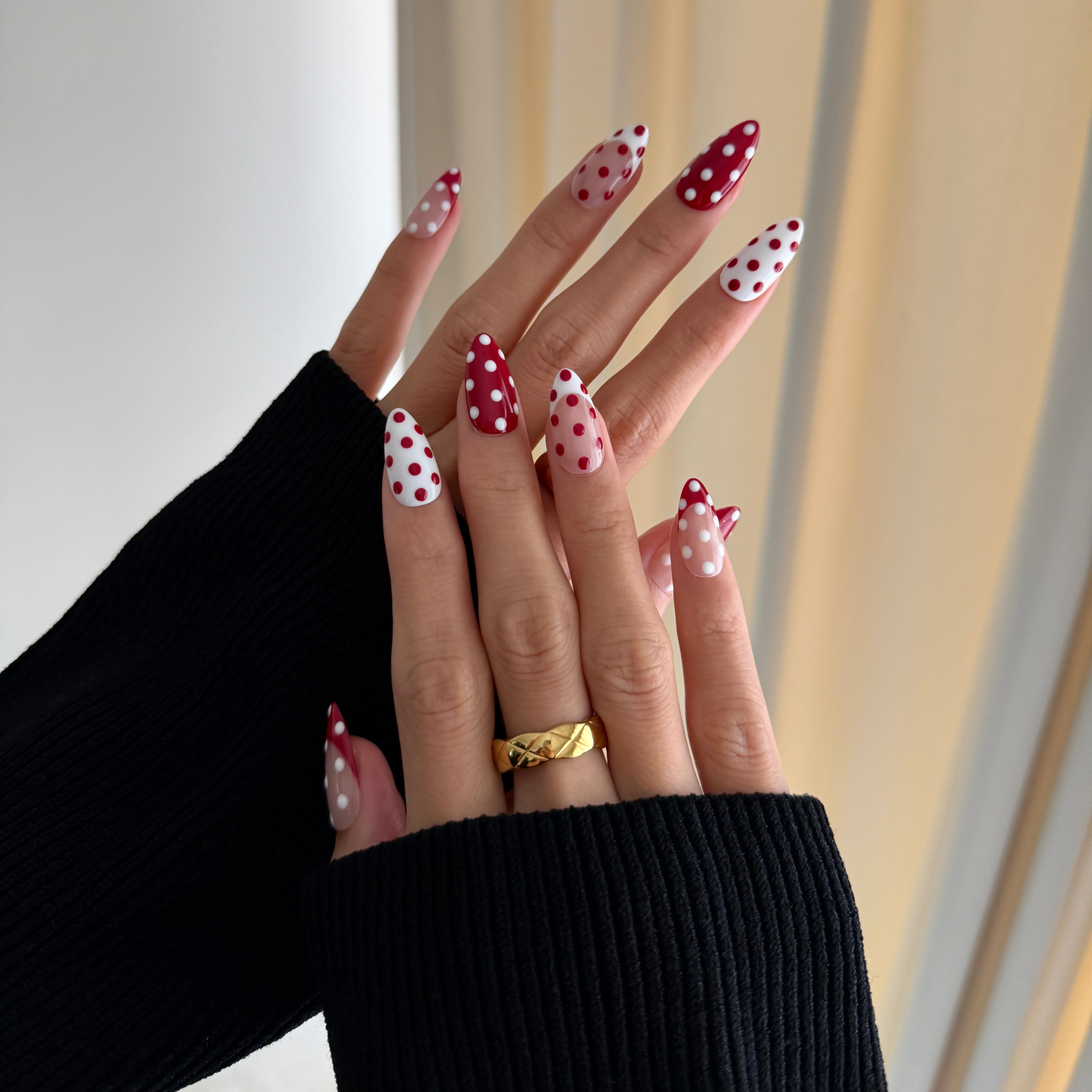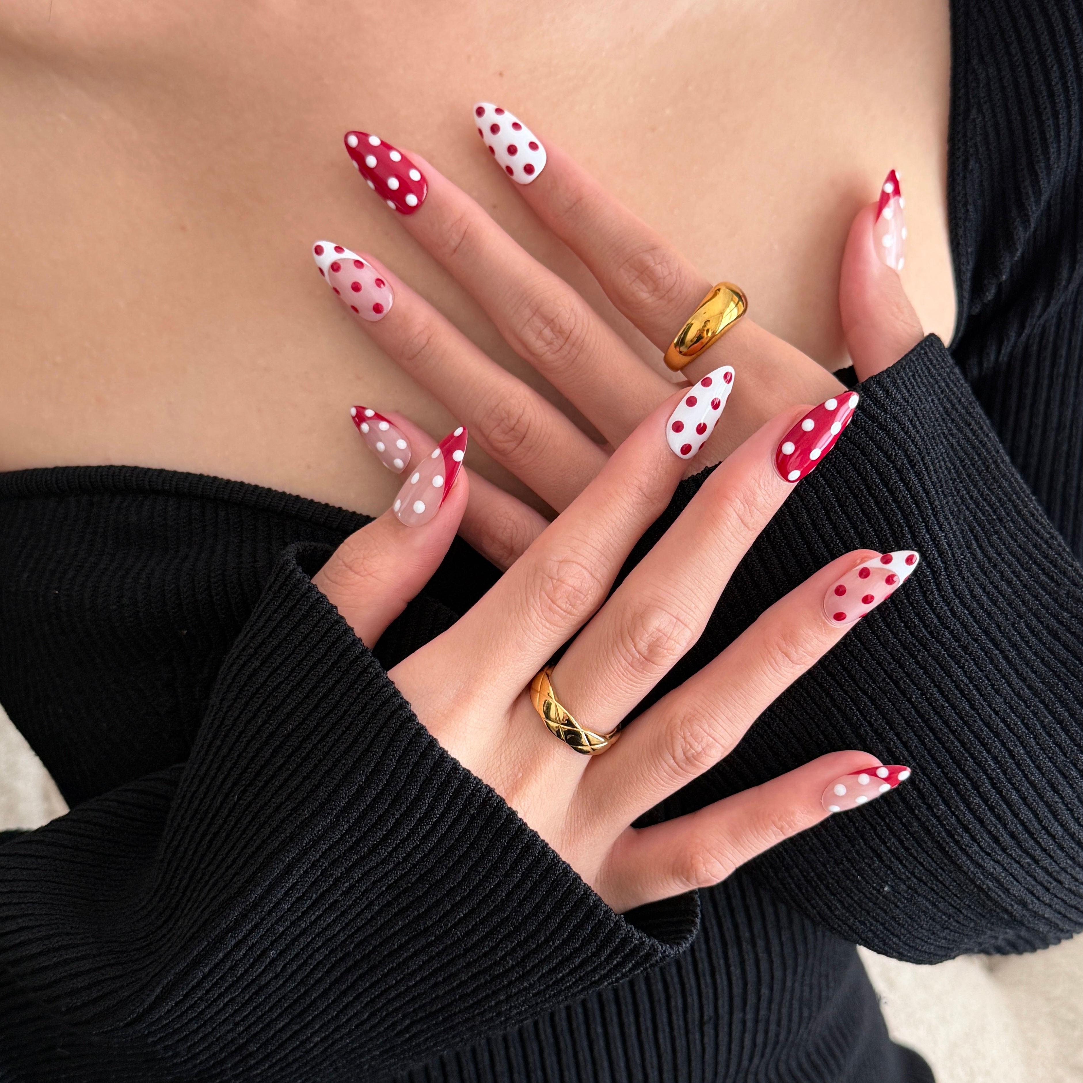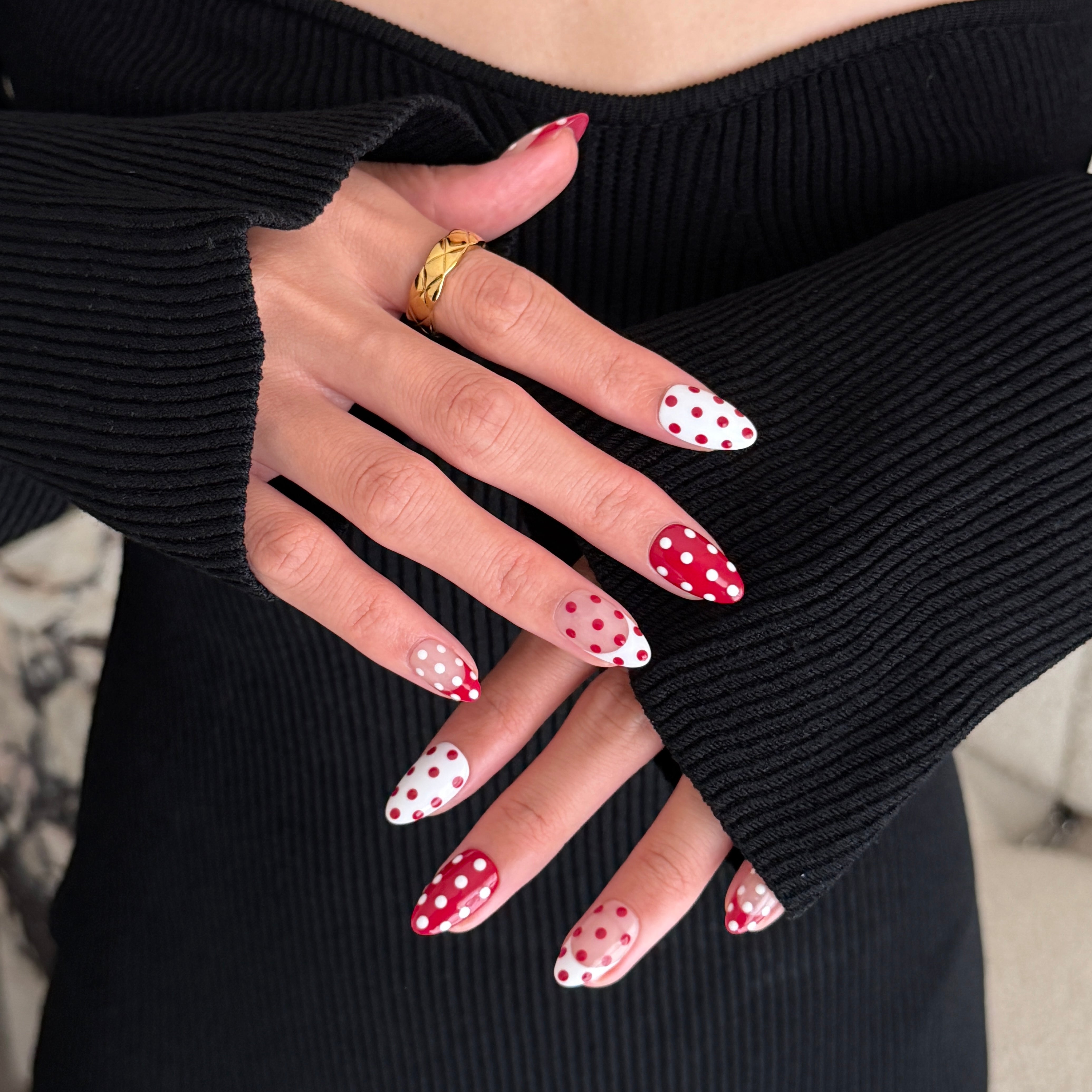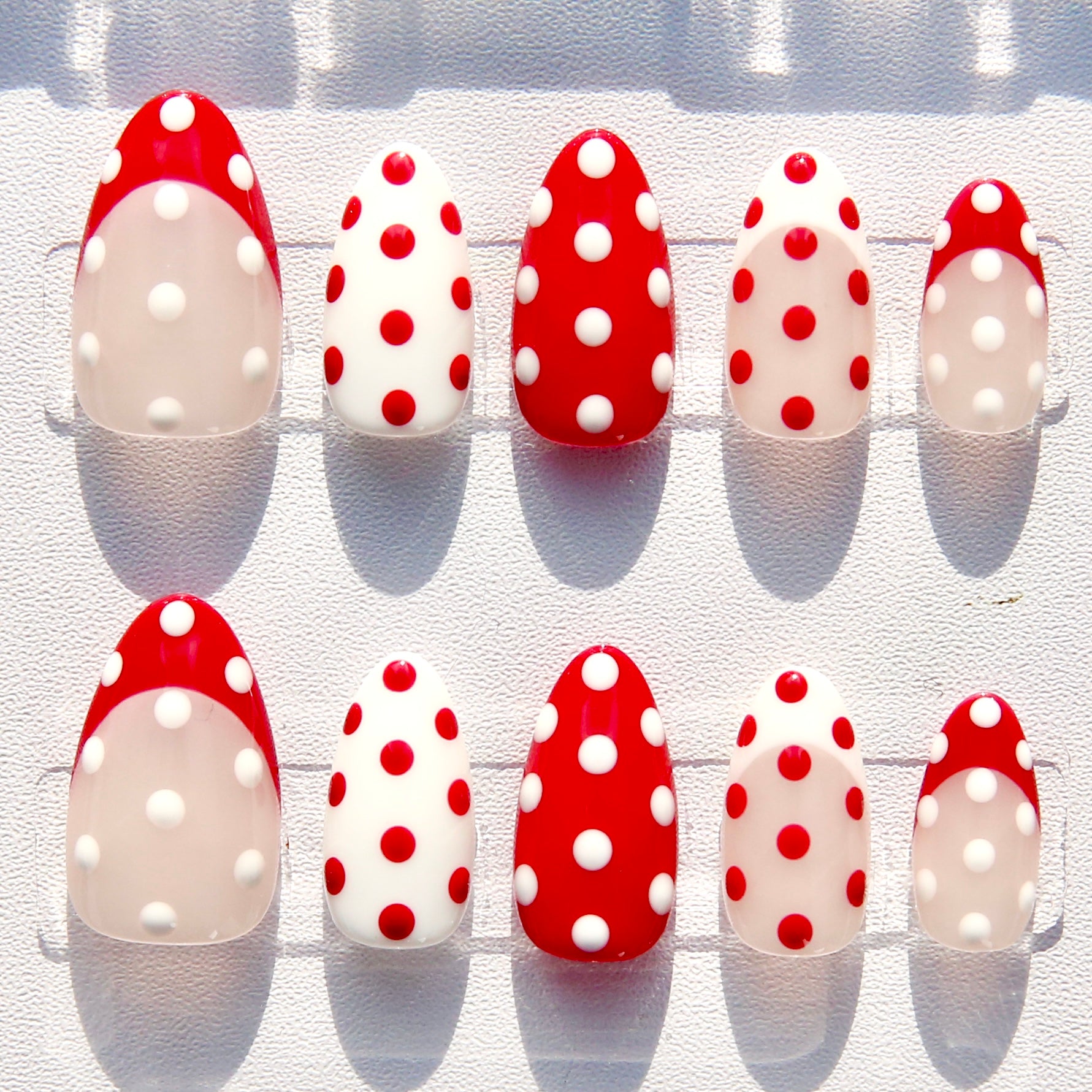 Celebrate the season with the playful charm of "Merry Mixers." This vibrant press-on nail set features a delightful mix of red and white polka dots, capturing the festive spirit in every detail. Perfect for holiday gatherings and joyful occasions, these nails add a fun and whimsical touch to your look.