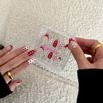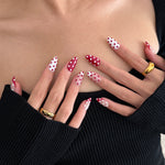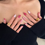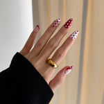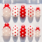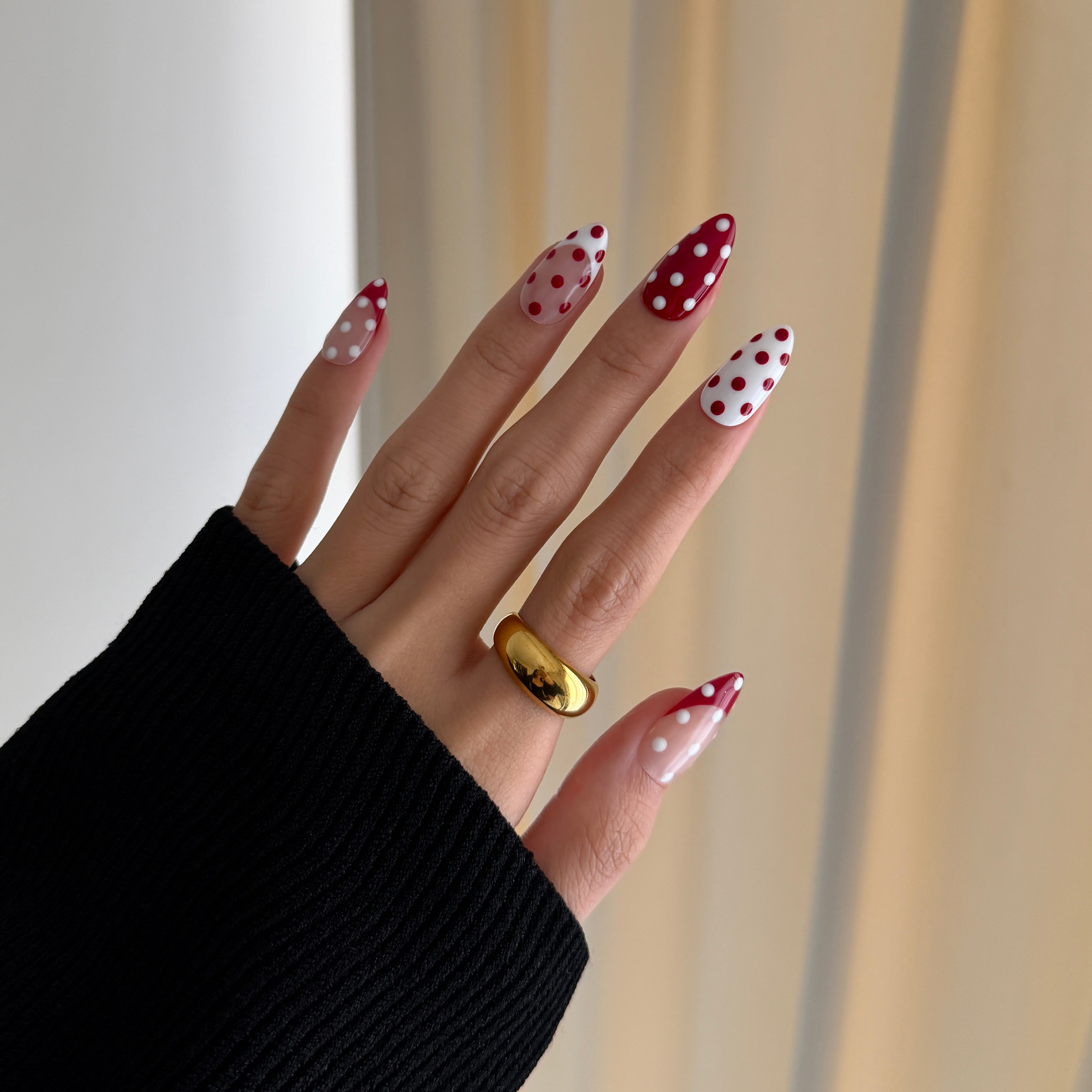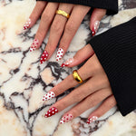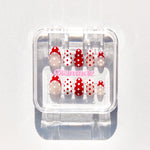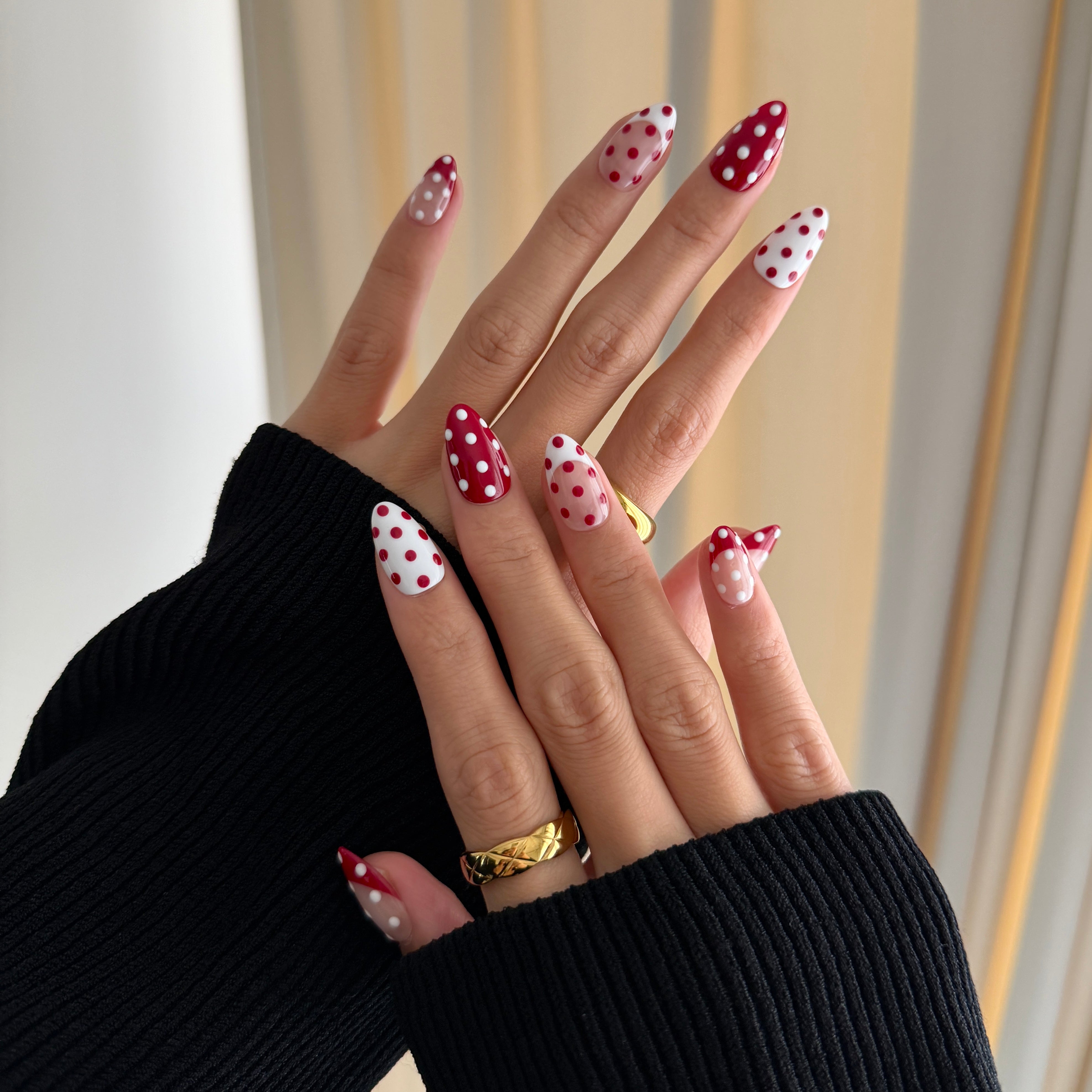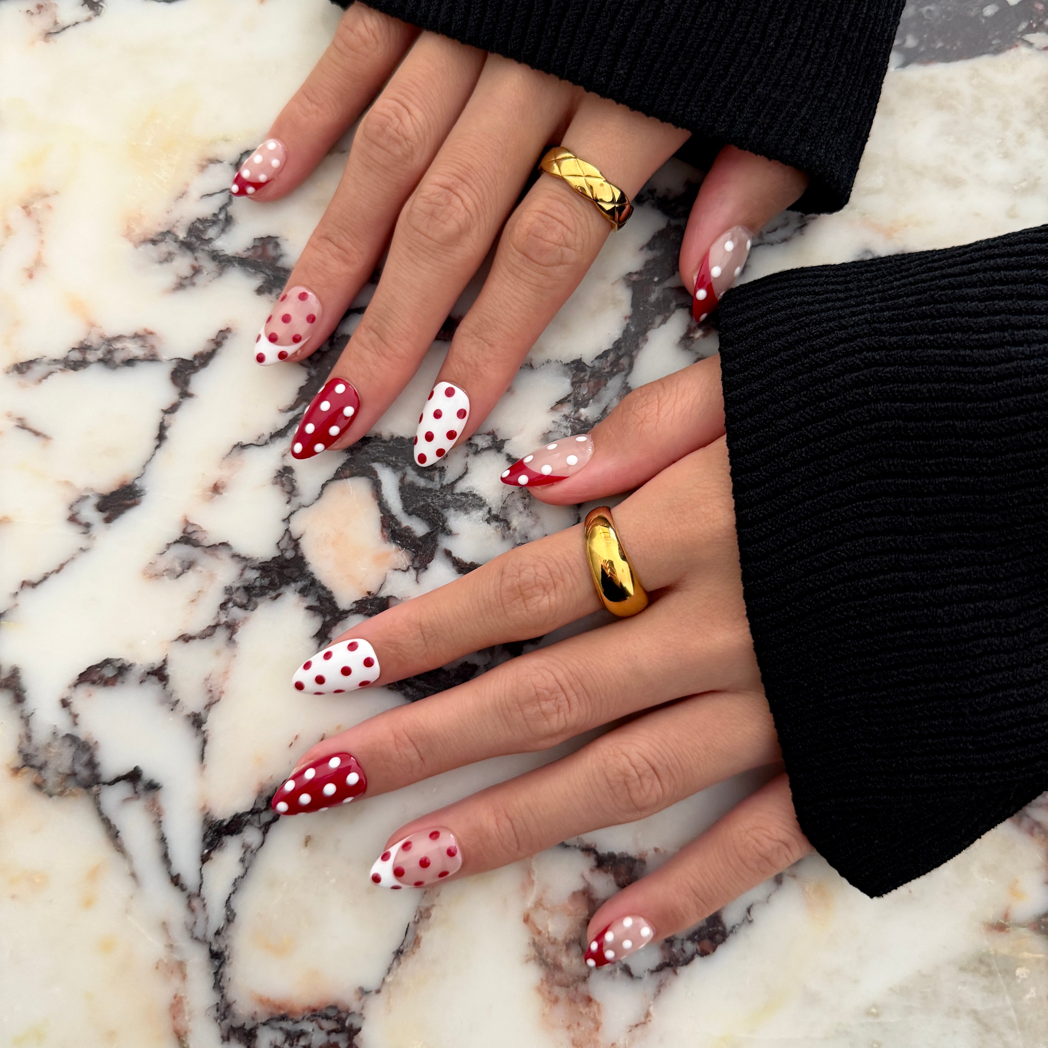 Celebrate the season with the playful charm of "Merry Mixers." This vibrant press-on nail set features a delightful mix of red and white polka dots, capturing the festive spirit in every detail. Perfect for holiday gatherings and joyful occasions, these nails add a fun and whimsical touch to your look.