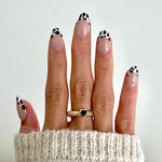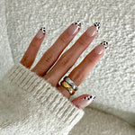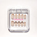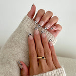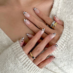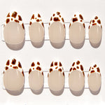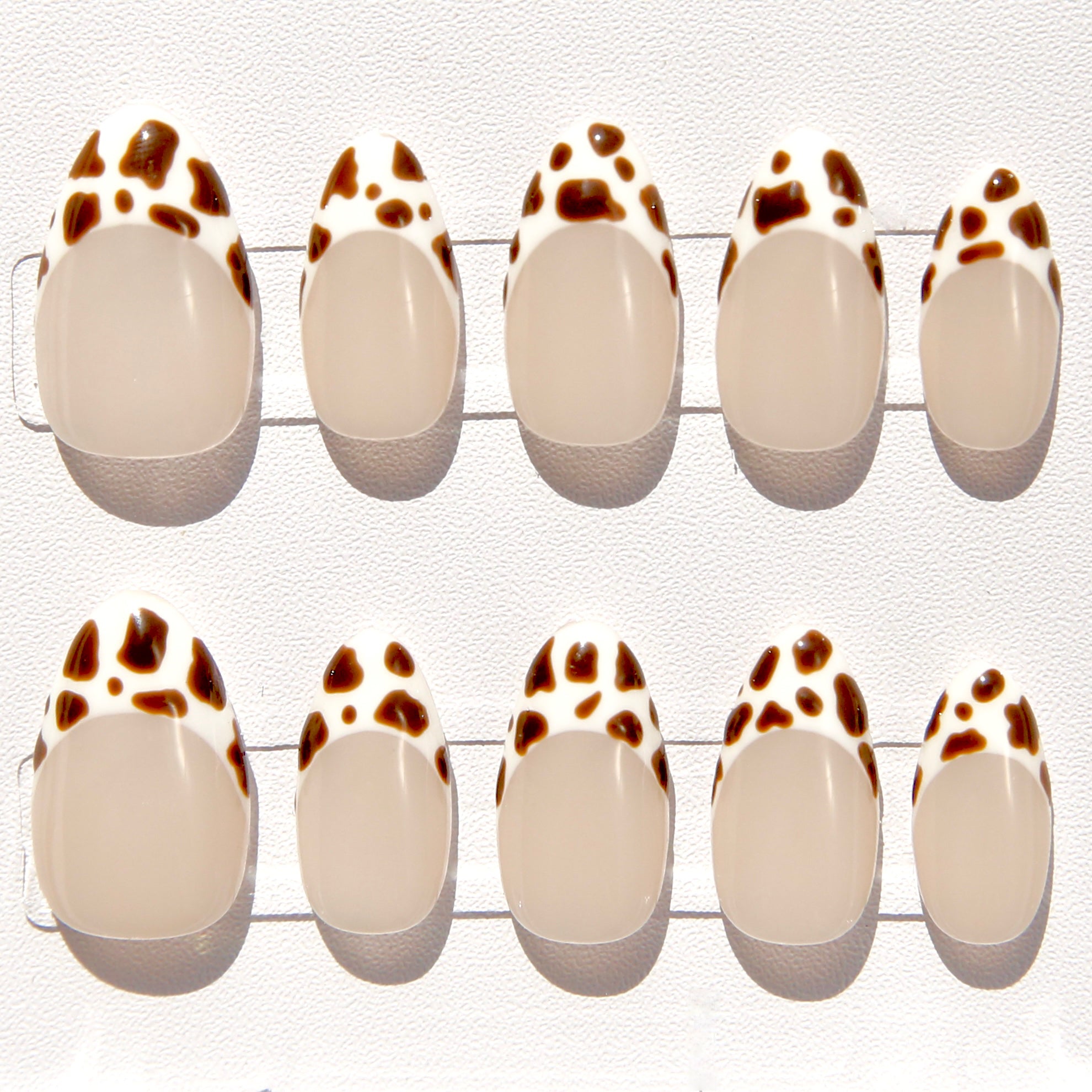A delightful handemade press-on nail set featuring a chic cow print French tip design. This playful yet sophisticated style captures the cozy essence of fall with its warm, earthy tones.