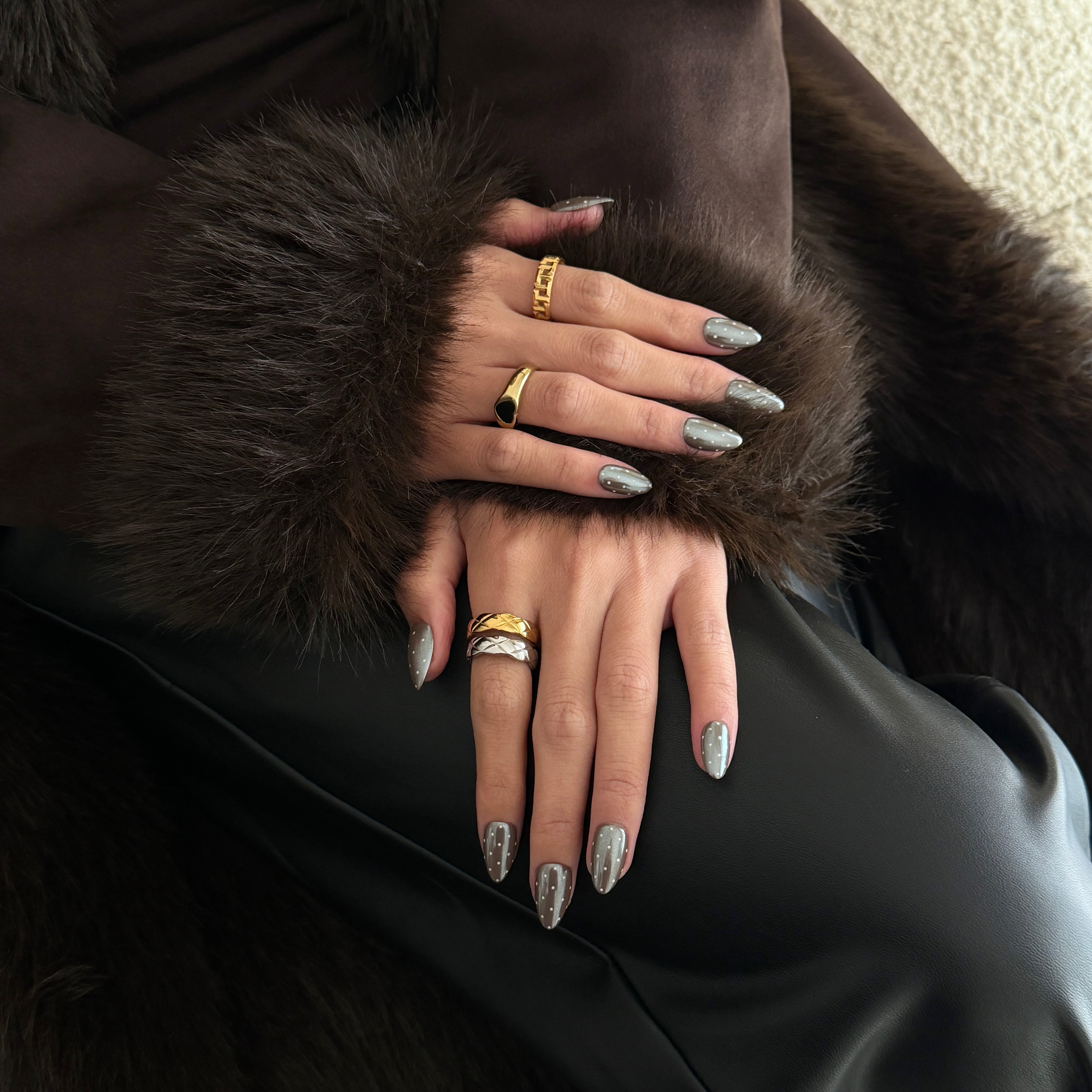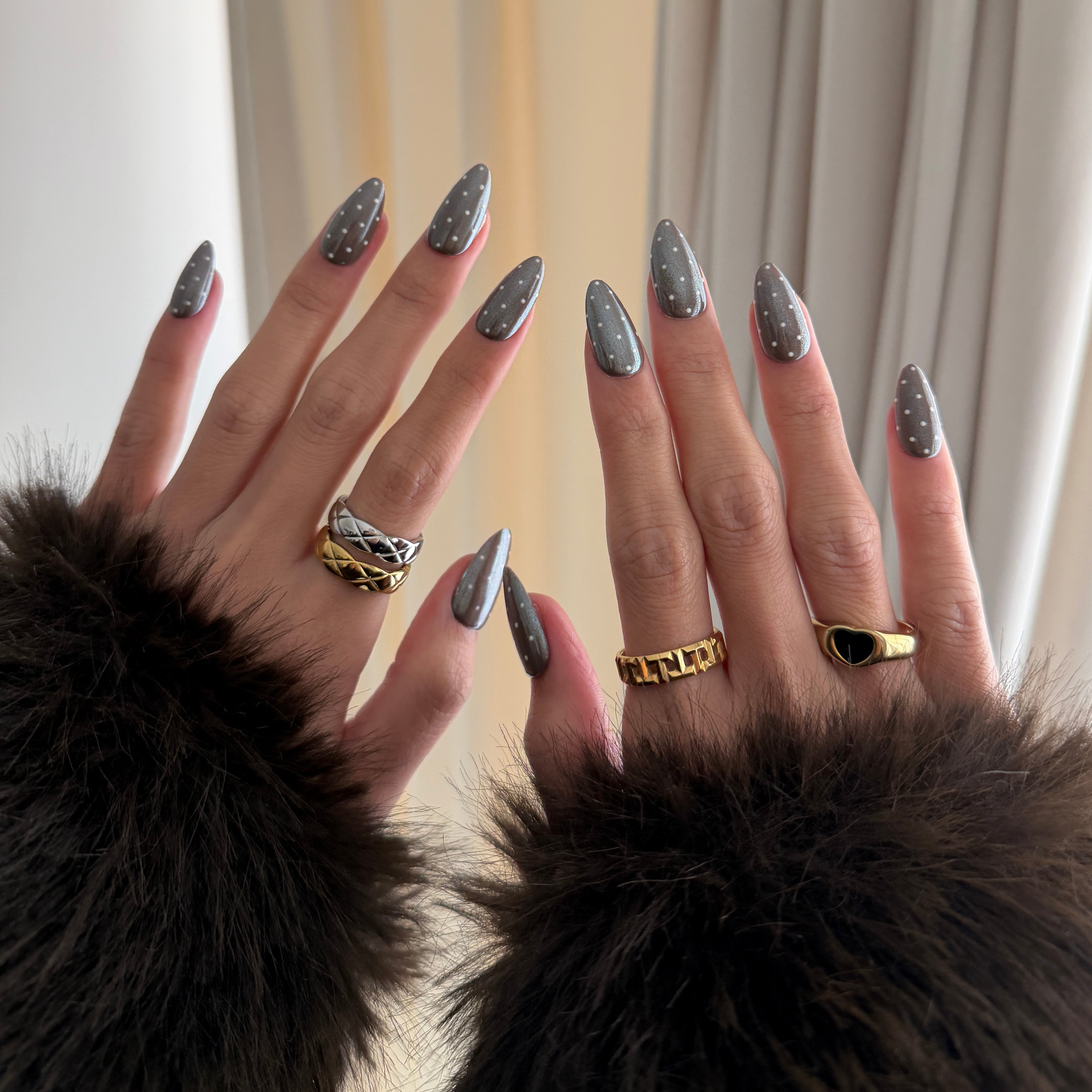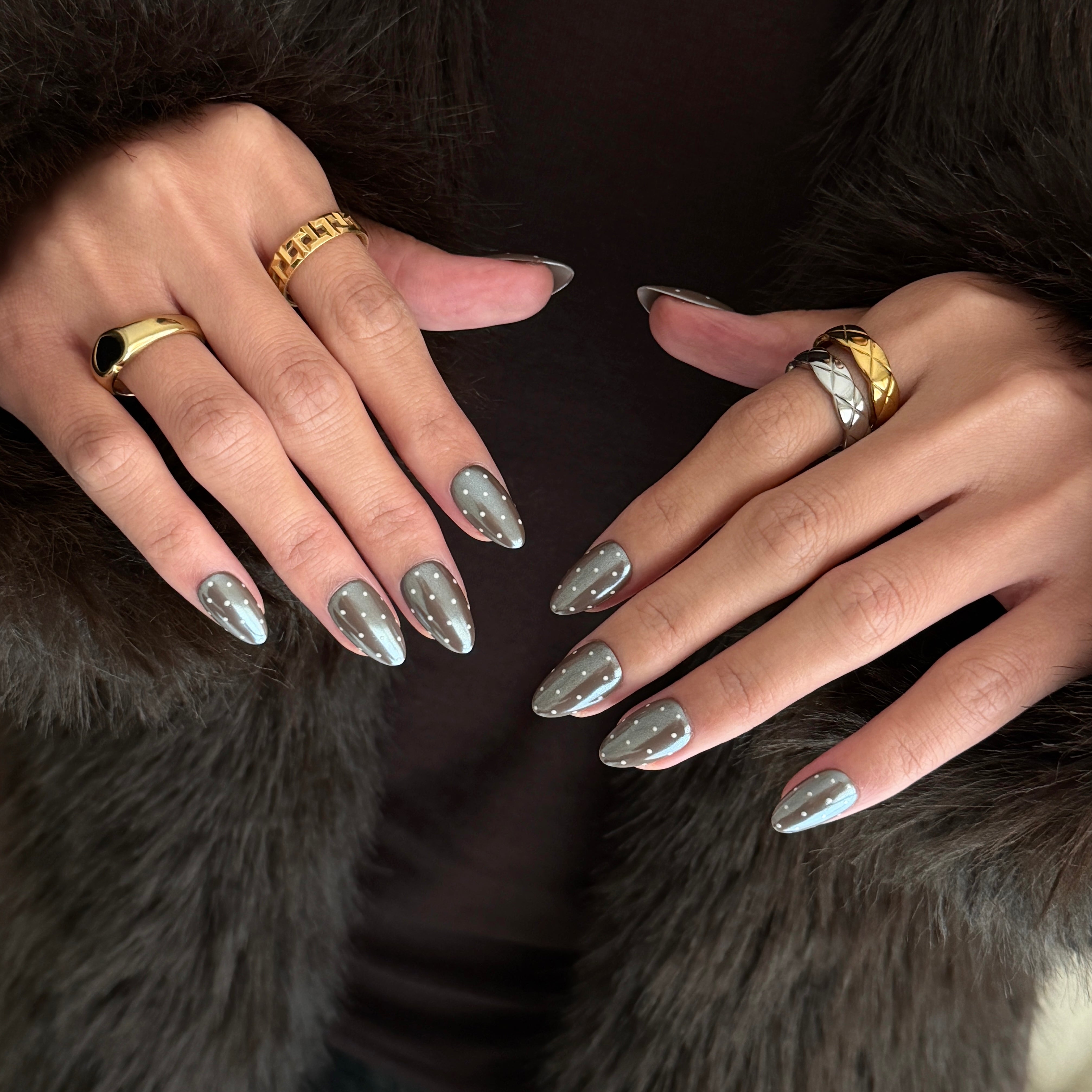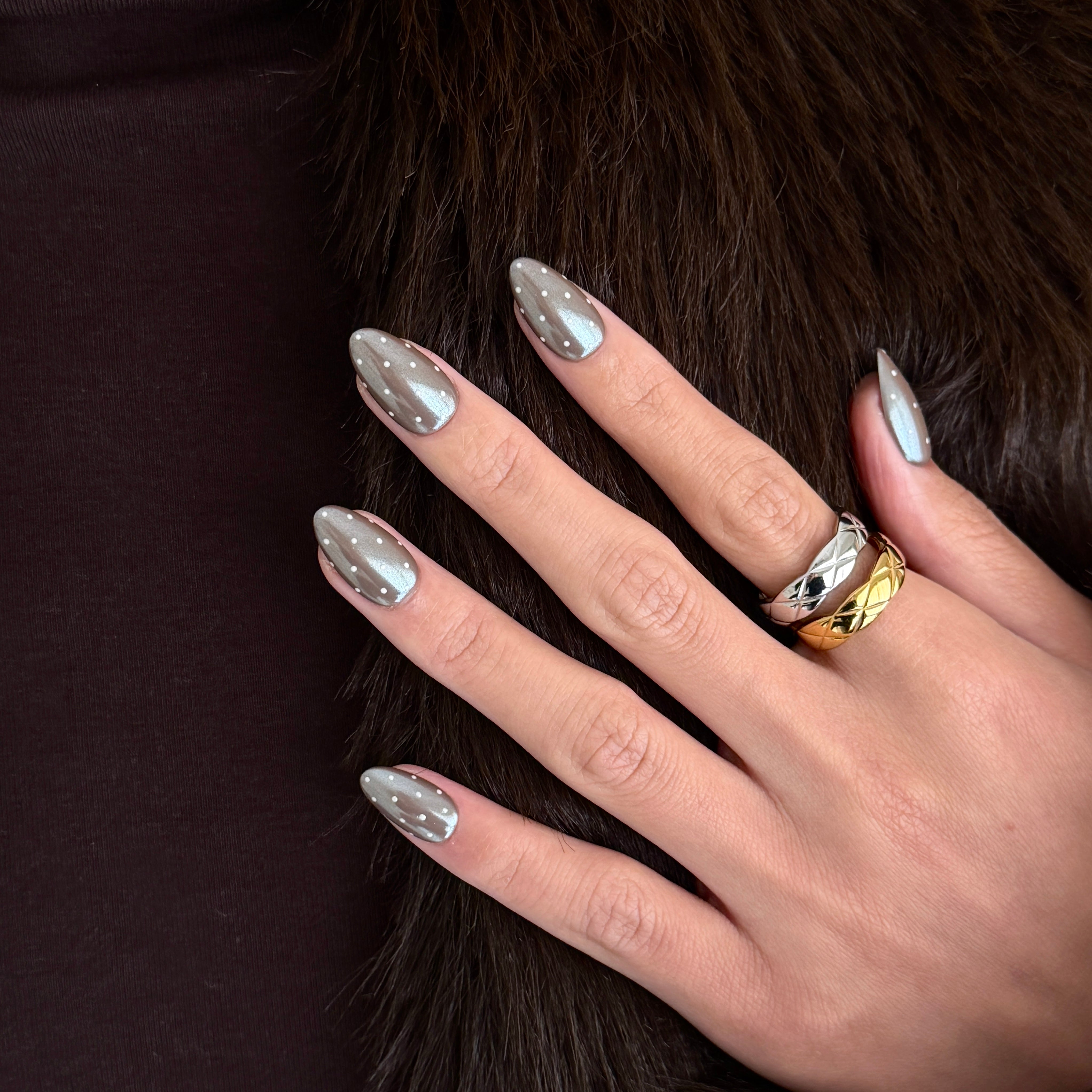 • Polka Detailing: Tiny, hand‑painted ivory dots float over the chrome, adding a subtle, graphic charm that keeps the look fun yet elevated.