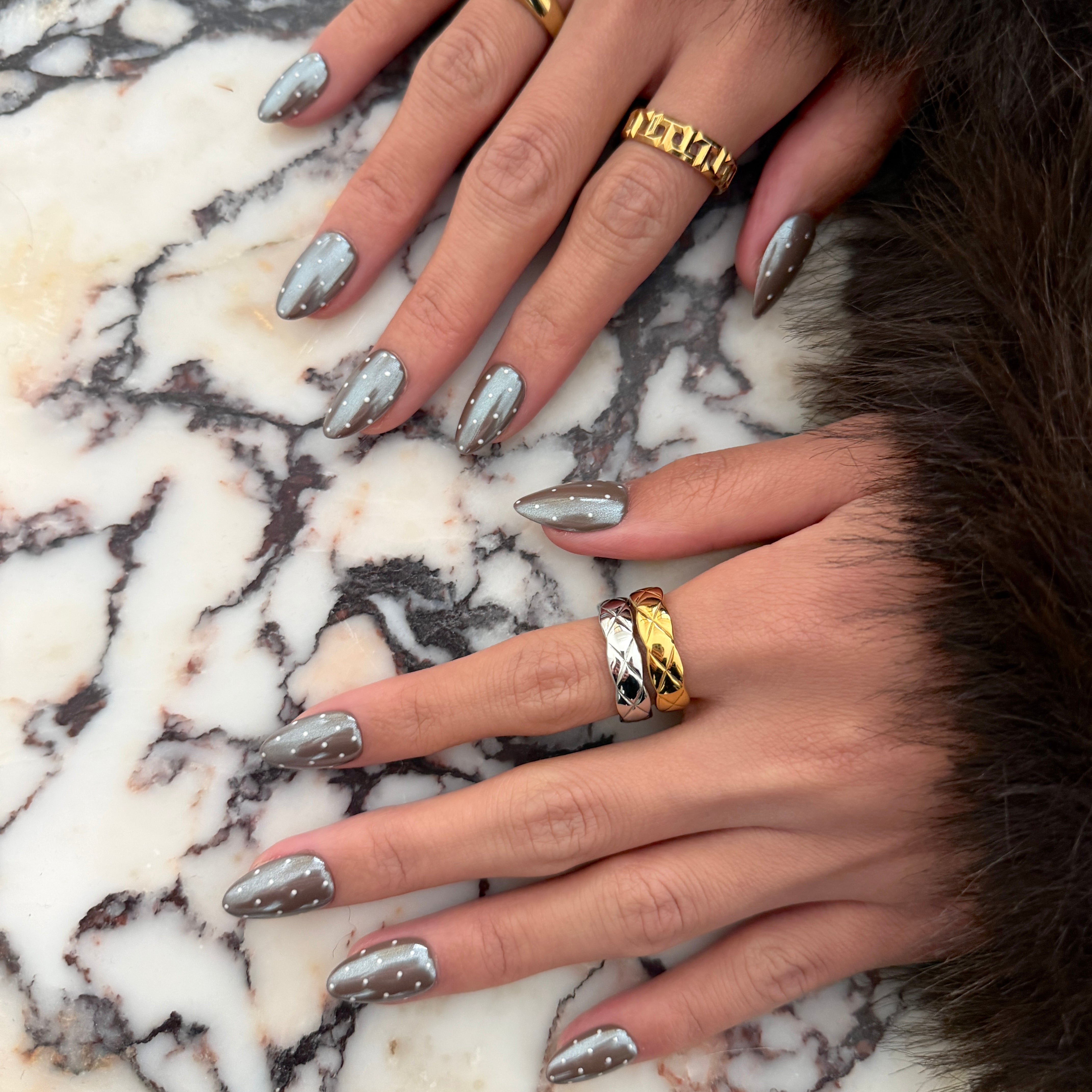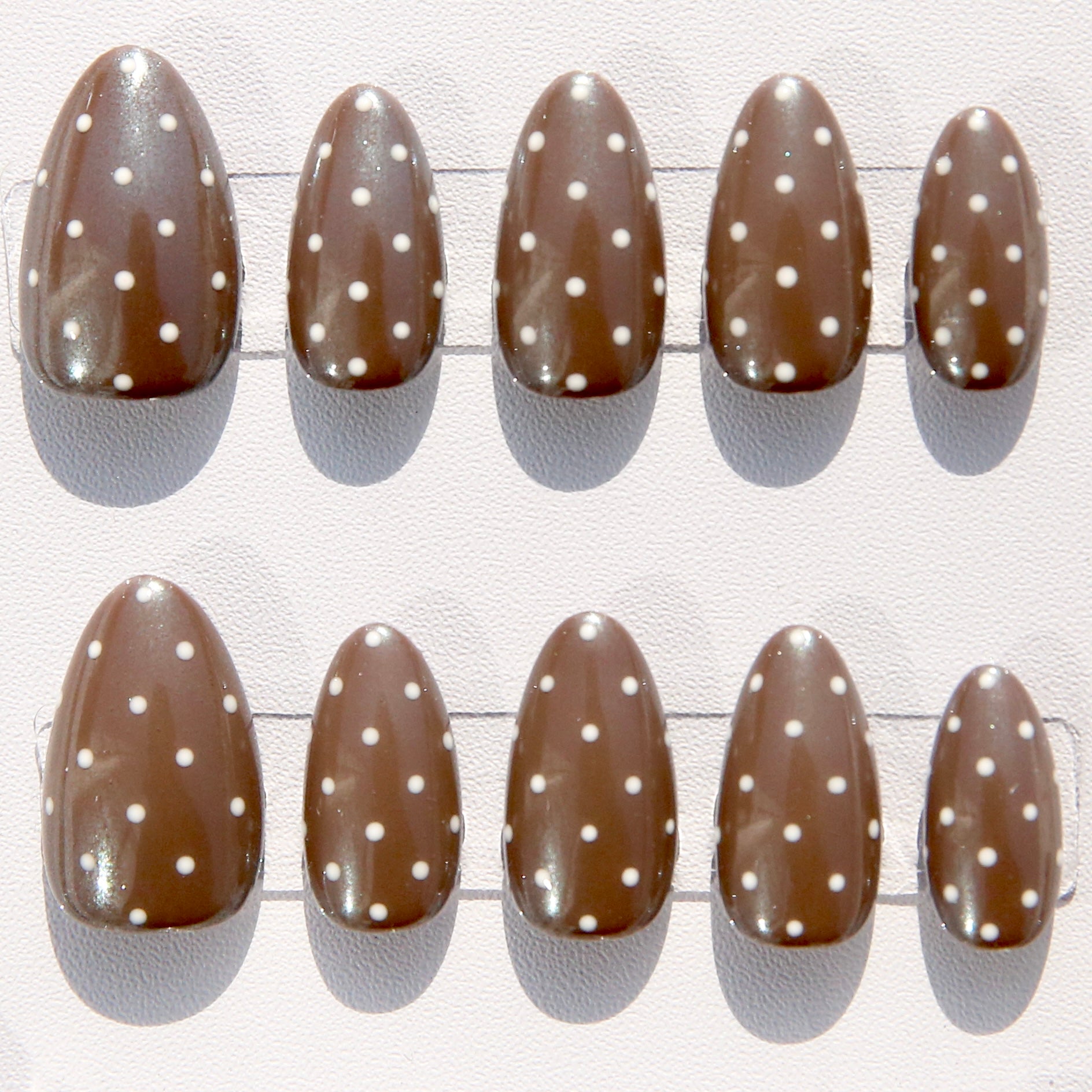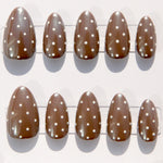 Espresso Polka is a playful, café‑chic twist on the viral chrome manicure. Inspired by Hailey Bieber’s signature glazed look, this handcrafted press‑on set pairs a reflective espresso chrome base with delicate ivory polka dots for a softly retro, ultra‑modern finish.