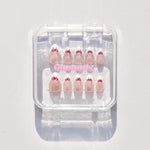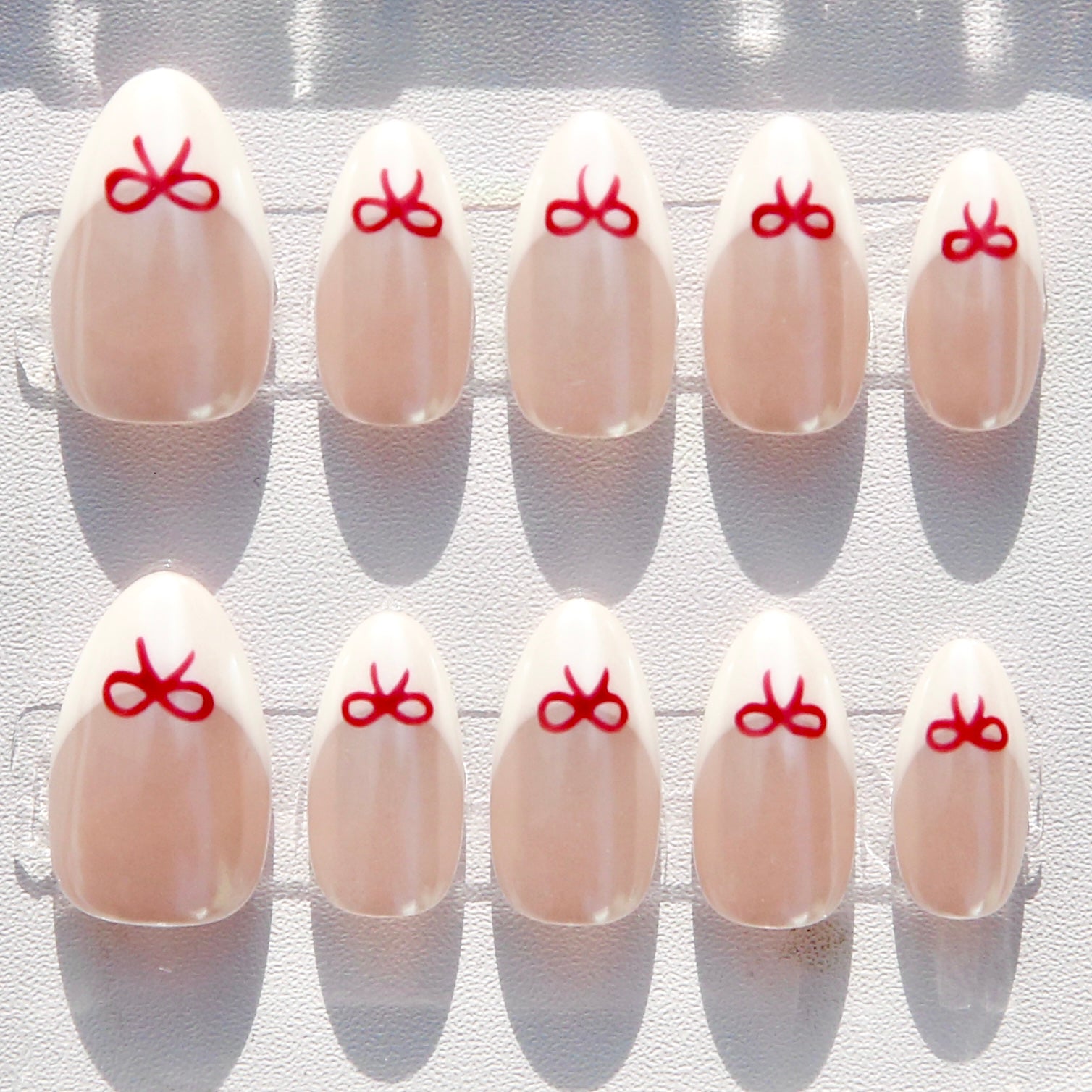 The perfect holiday glazed nail style! This set features a sleek French glazed design, offering a chic, glossy finish. Delicate bows add a touch of whimsy, perfect for celebrating the season in style. Whether at a holiday gala or a cozy gathering, this design is sure to captivate.