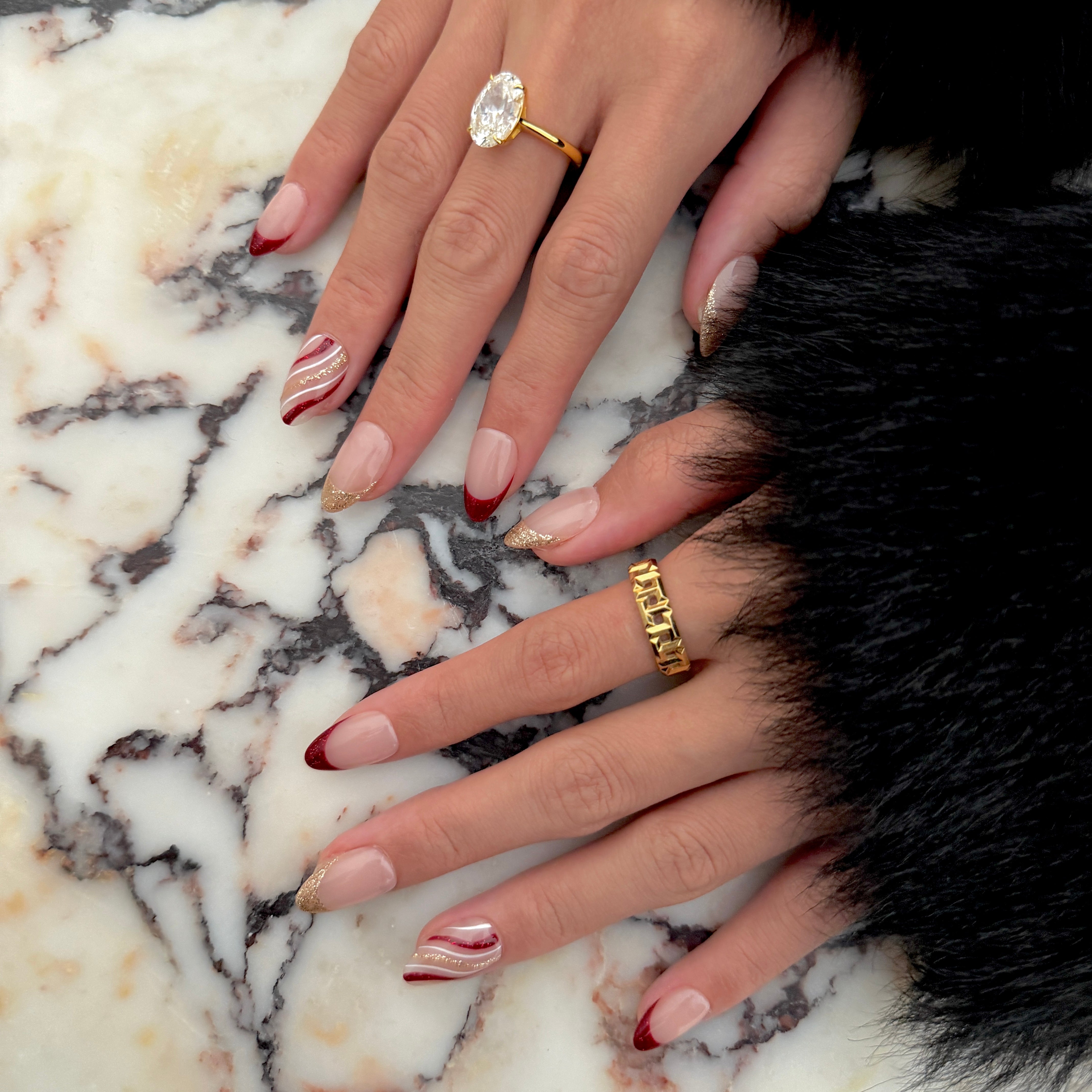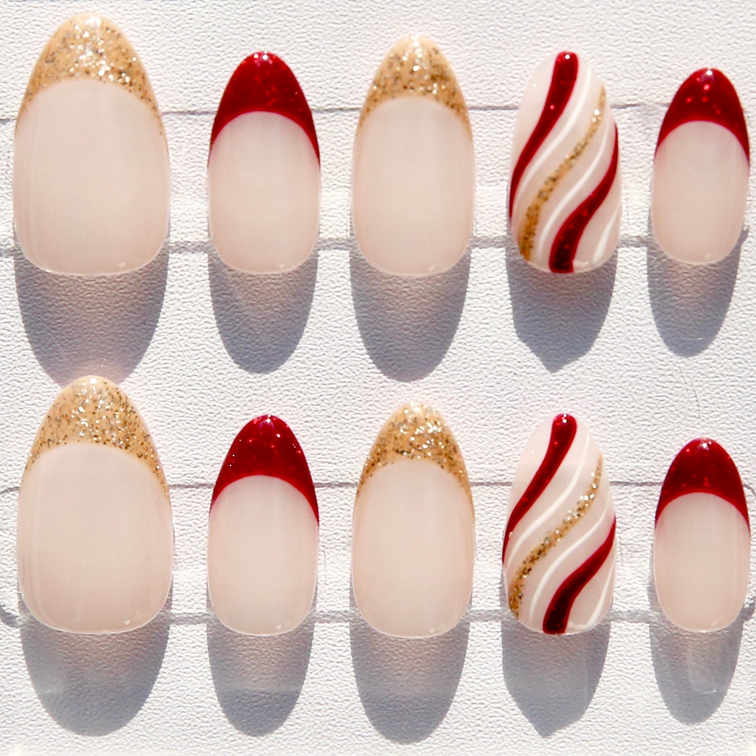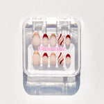 A dazzling press-on nail set designed to elevate your holiday festivities. Featuring shimmering glitter tips and elegant candy cane swirls, this style captures the essence of seasonal celebrations. Perfect for any party, these nails ensure you’re ready to jingle all the way.