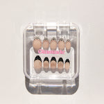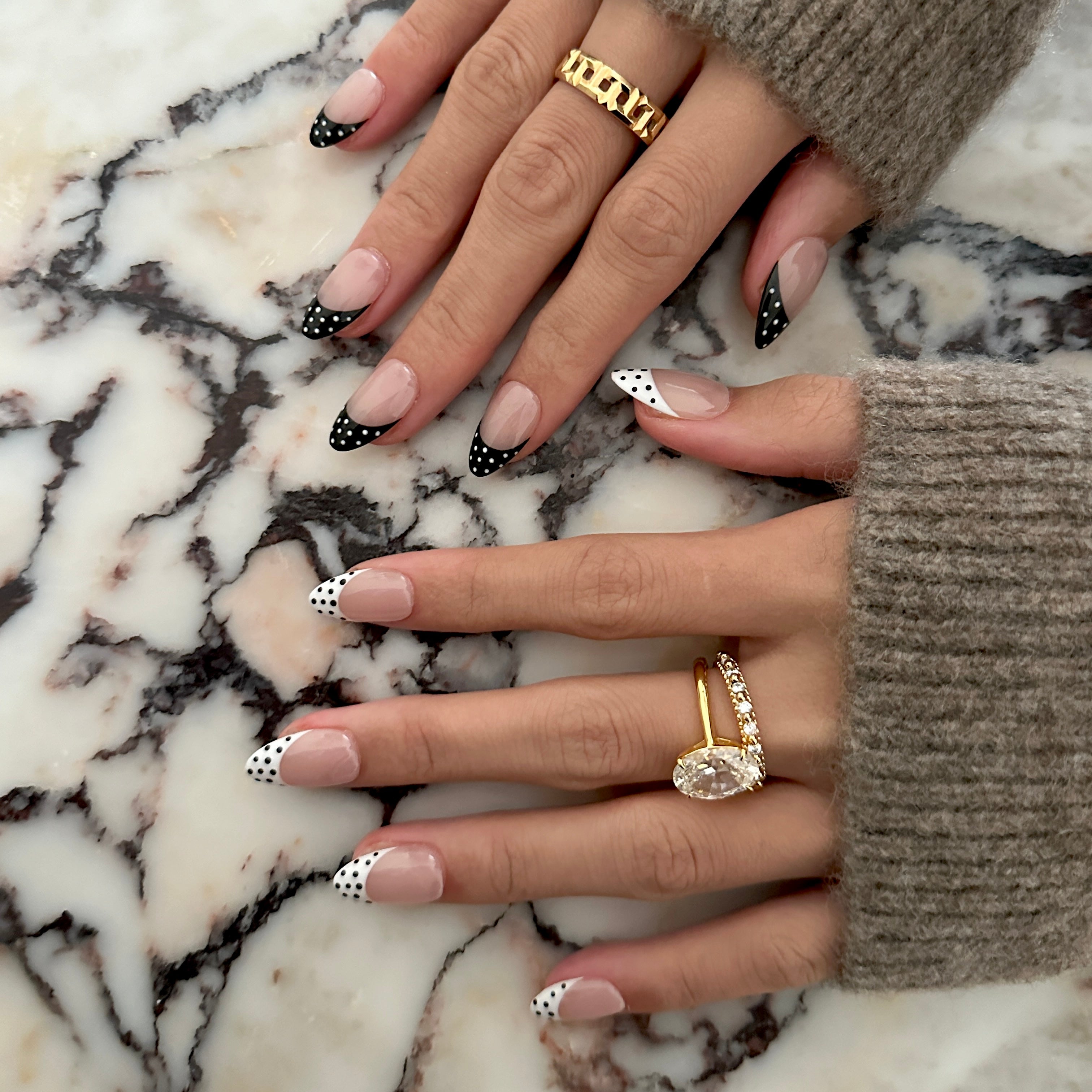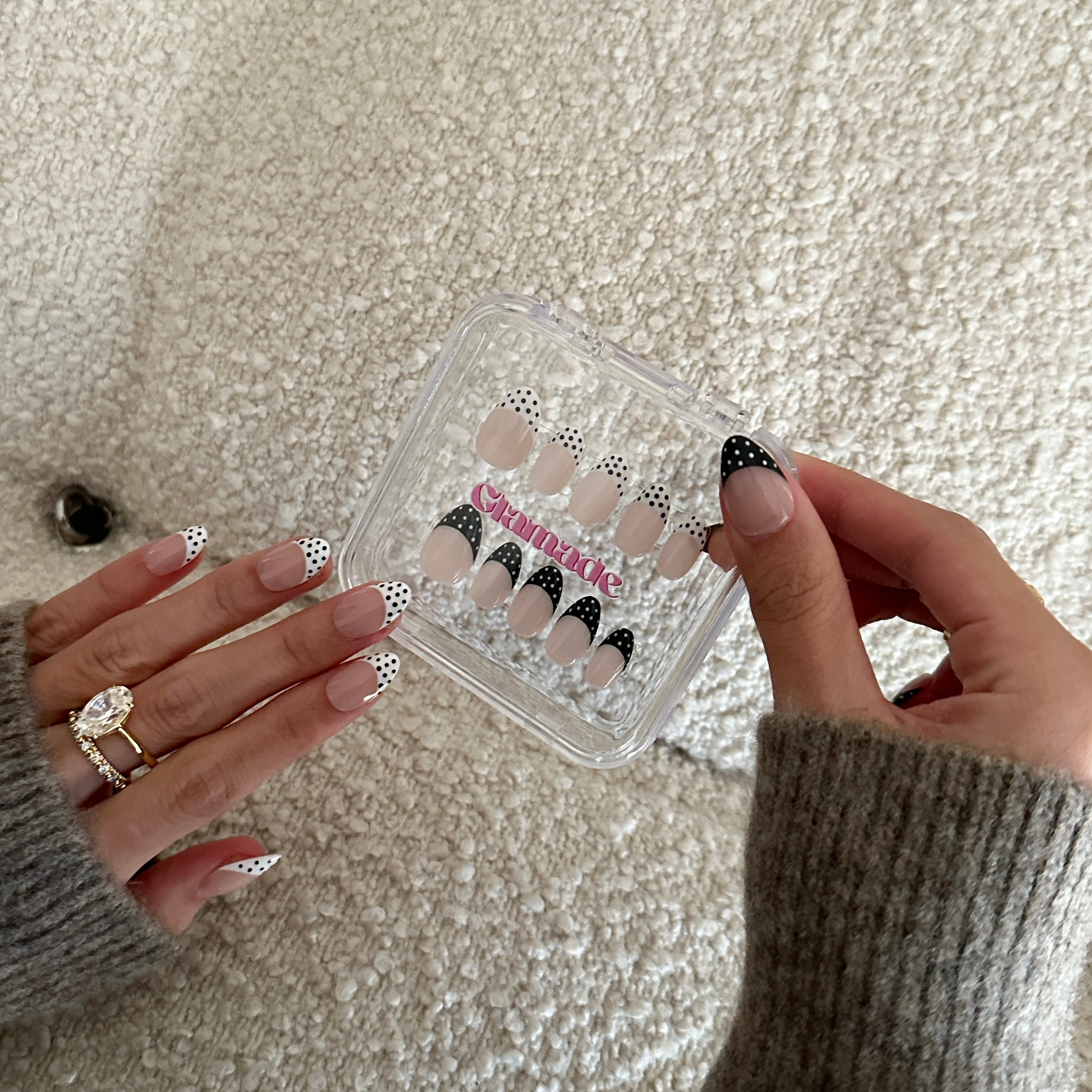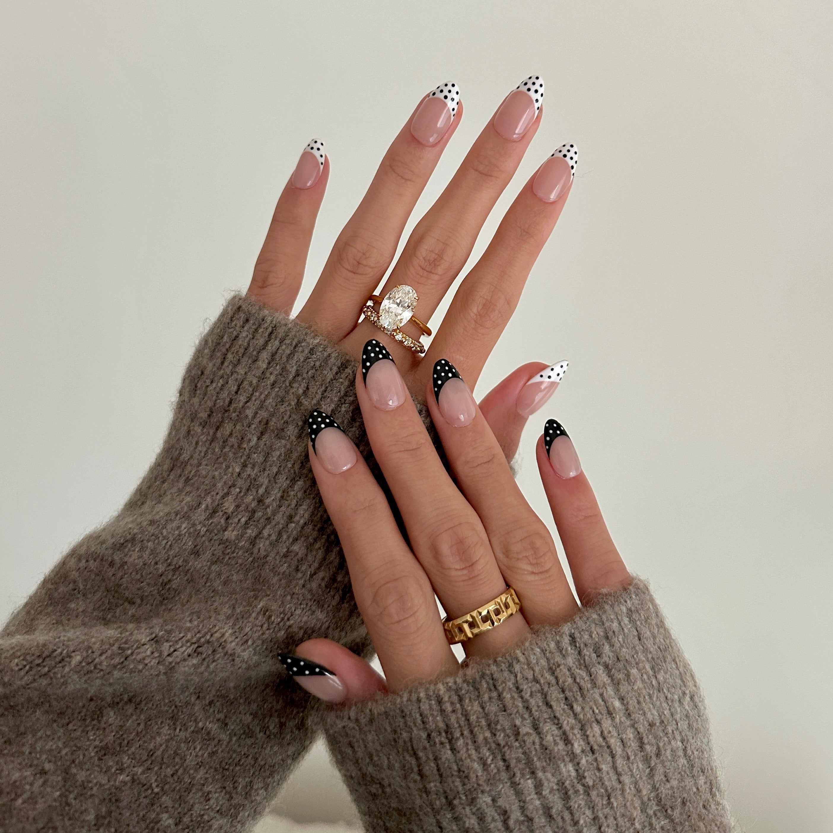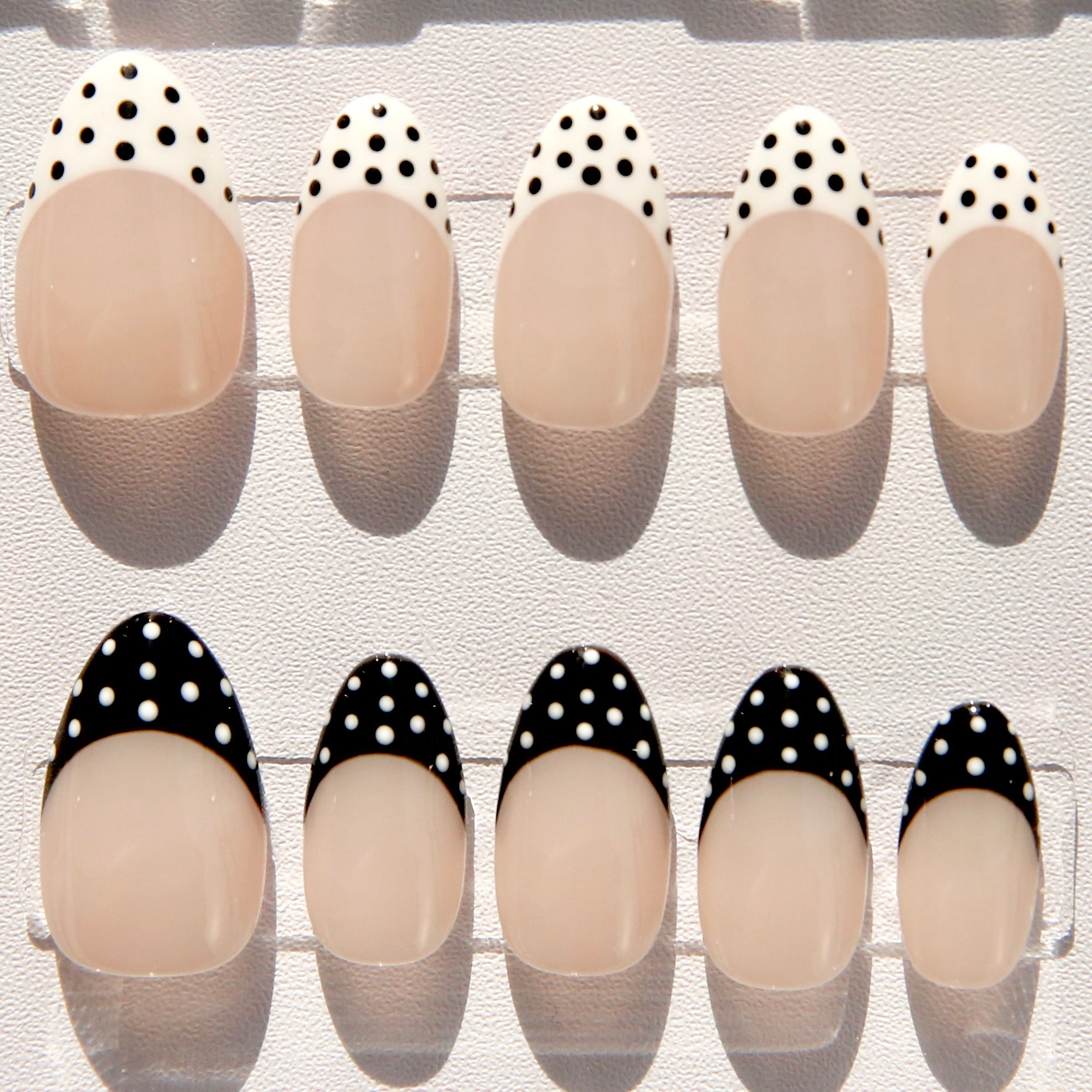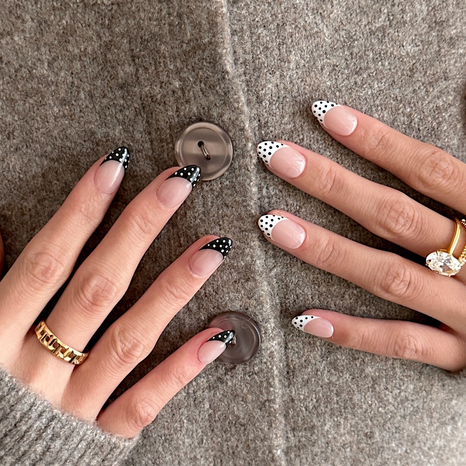 Introducing Madame Polka, a sophisticated and playful addition to your nail collection. This press-on nail design features elegant black and white polka dots with modern French tips, blending timeless charm with contemporary style. Perfect for any occasion, these nails offer a chic and polished look that stands out.