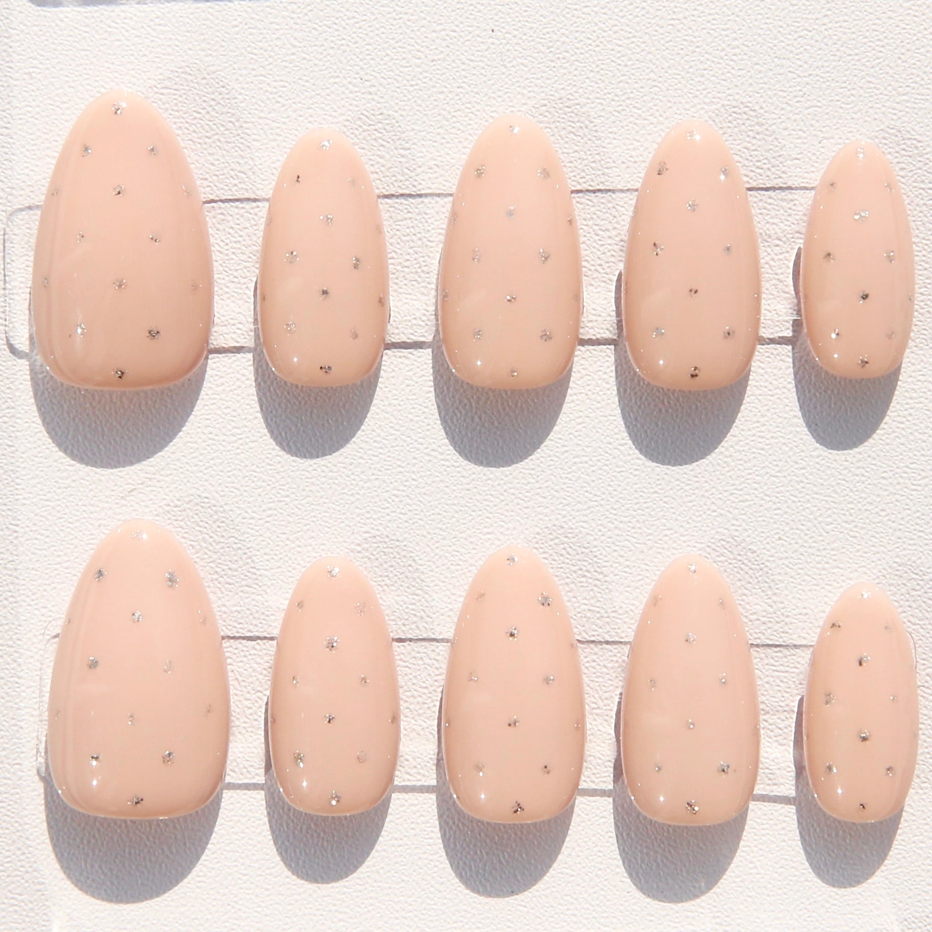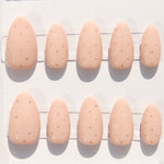 A soft, milky take on the polka‑dot manicure—delicate, luminous, and quietly playful. This handcrafted press‑on set features a sheer oatmilk nude base, scattered with tiny silver dots that glint like dew in the light for an understated, everyday sparkle.