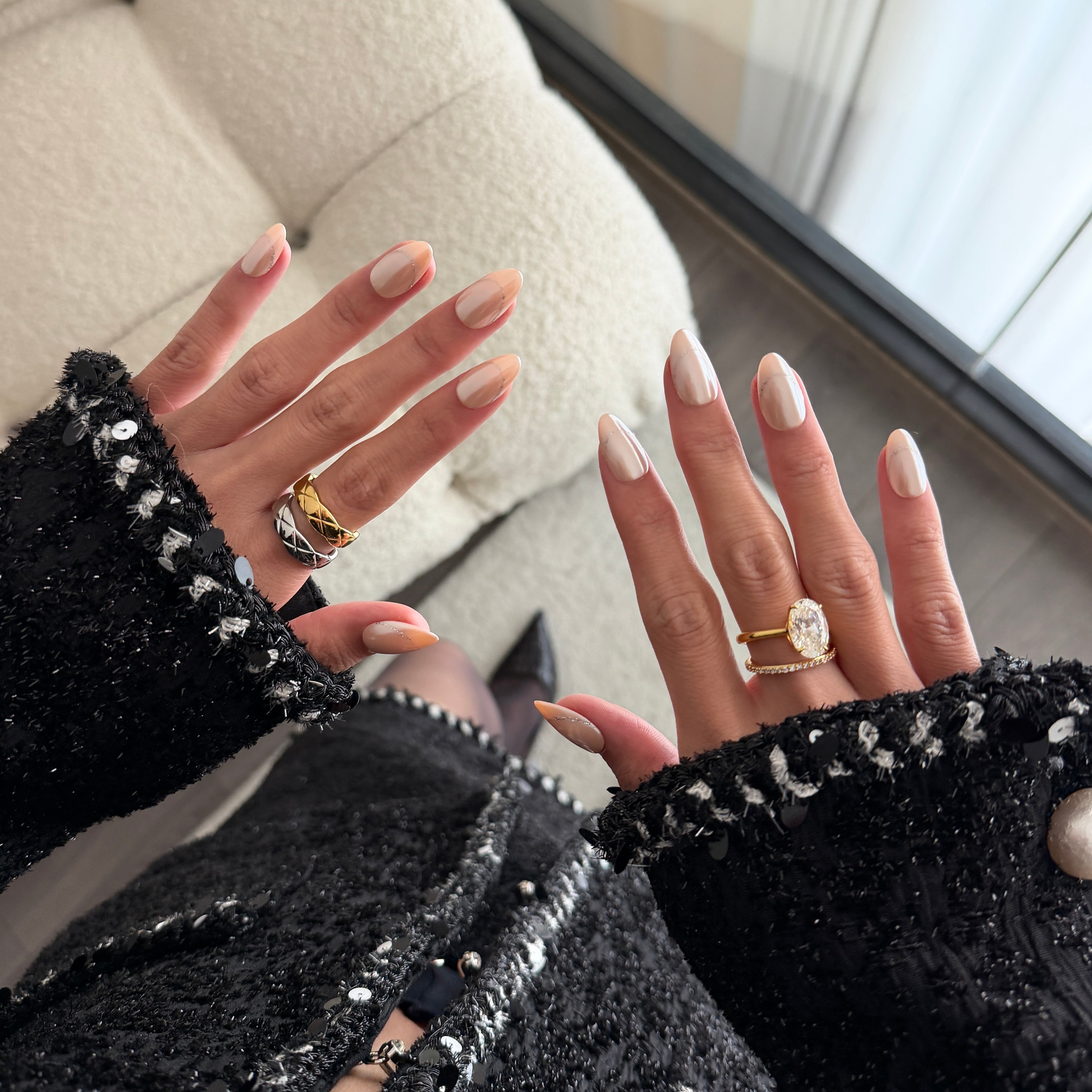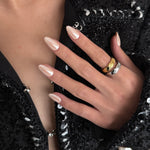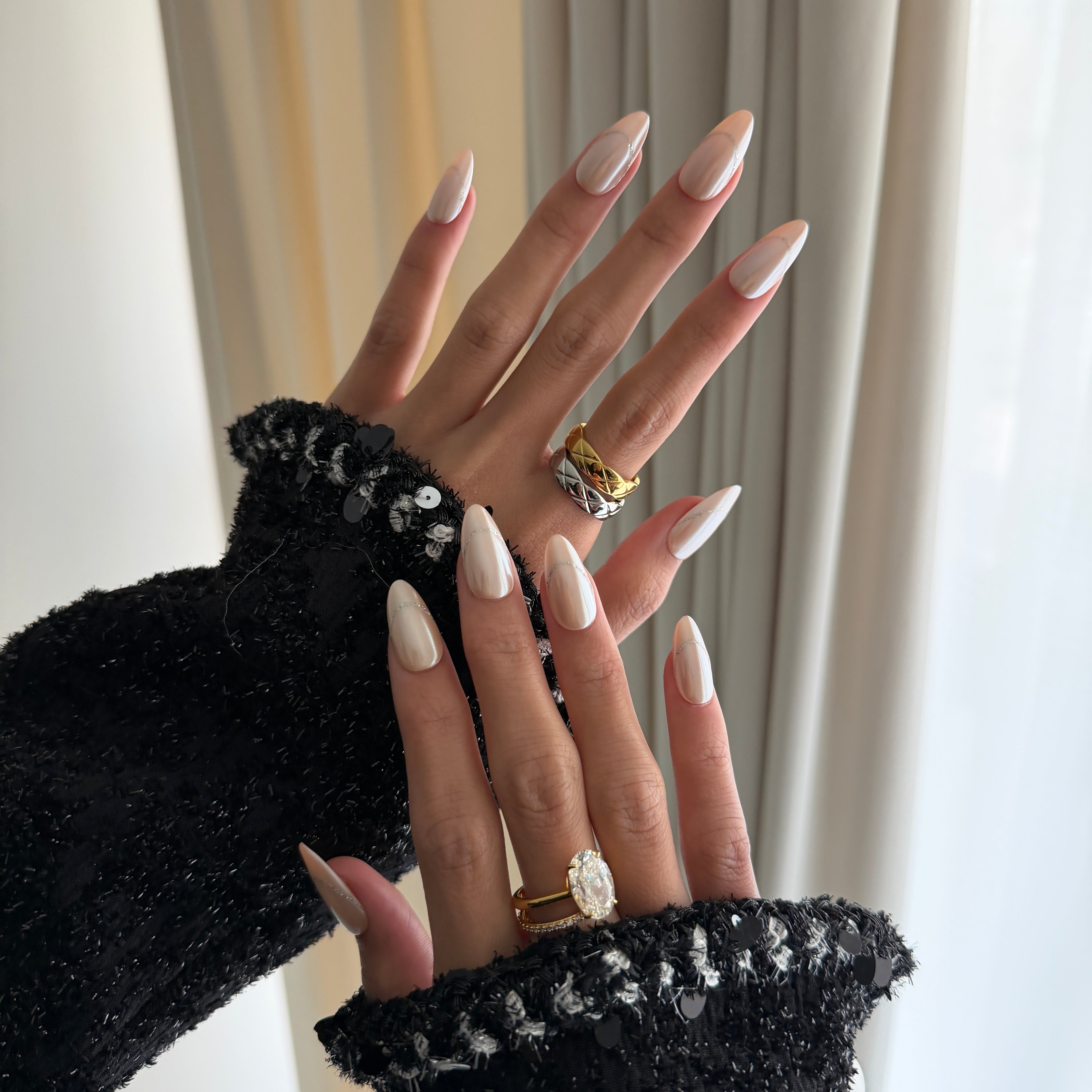 • Shape & silhouette: Elegant, elongated almond tips that visually slim the fingers and mirror the curve of a solitaire stone. The length is luxe but wearable, perfect for bridal, black-tie evenings, or everyday “quiet luxury.”