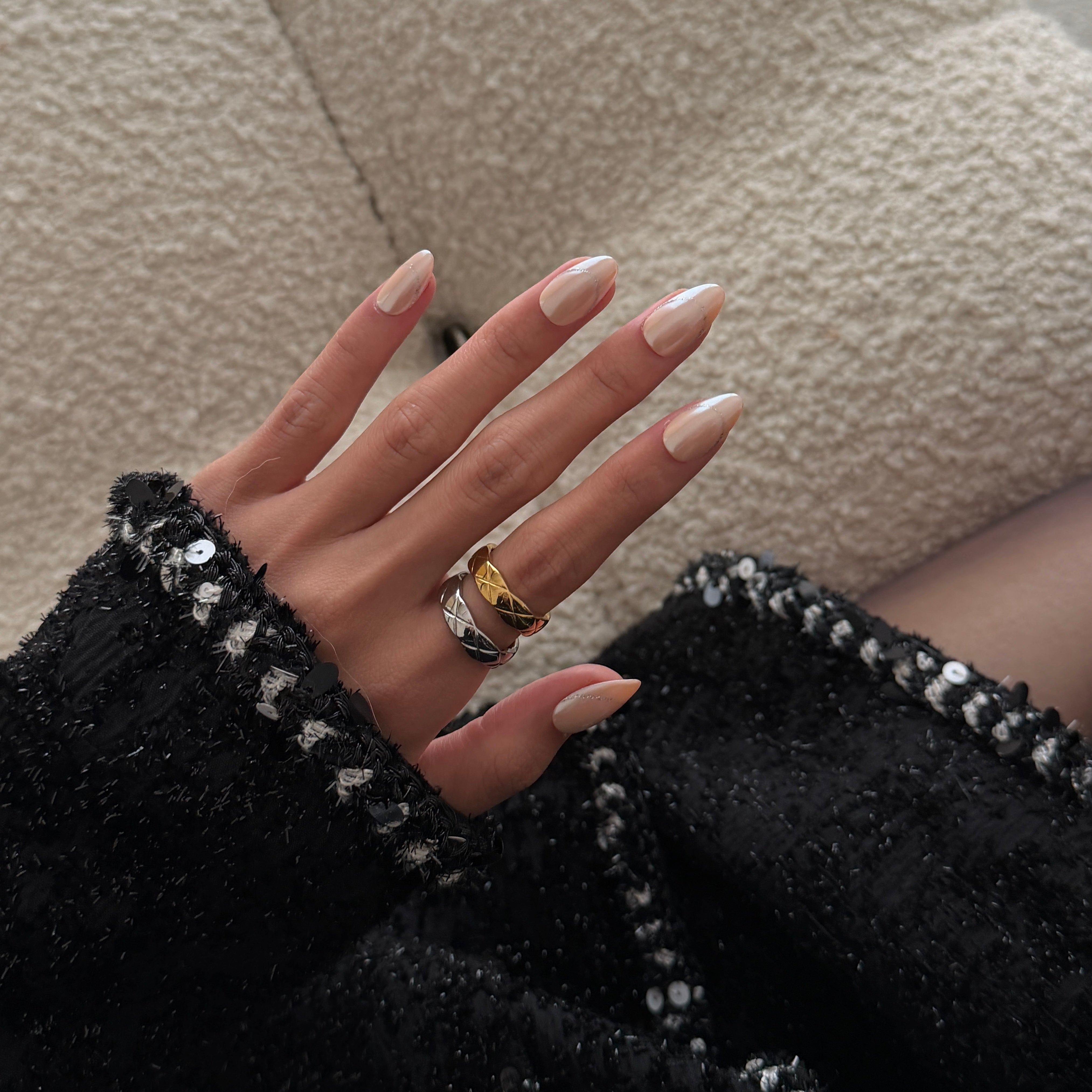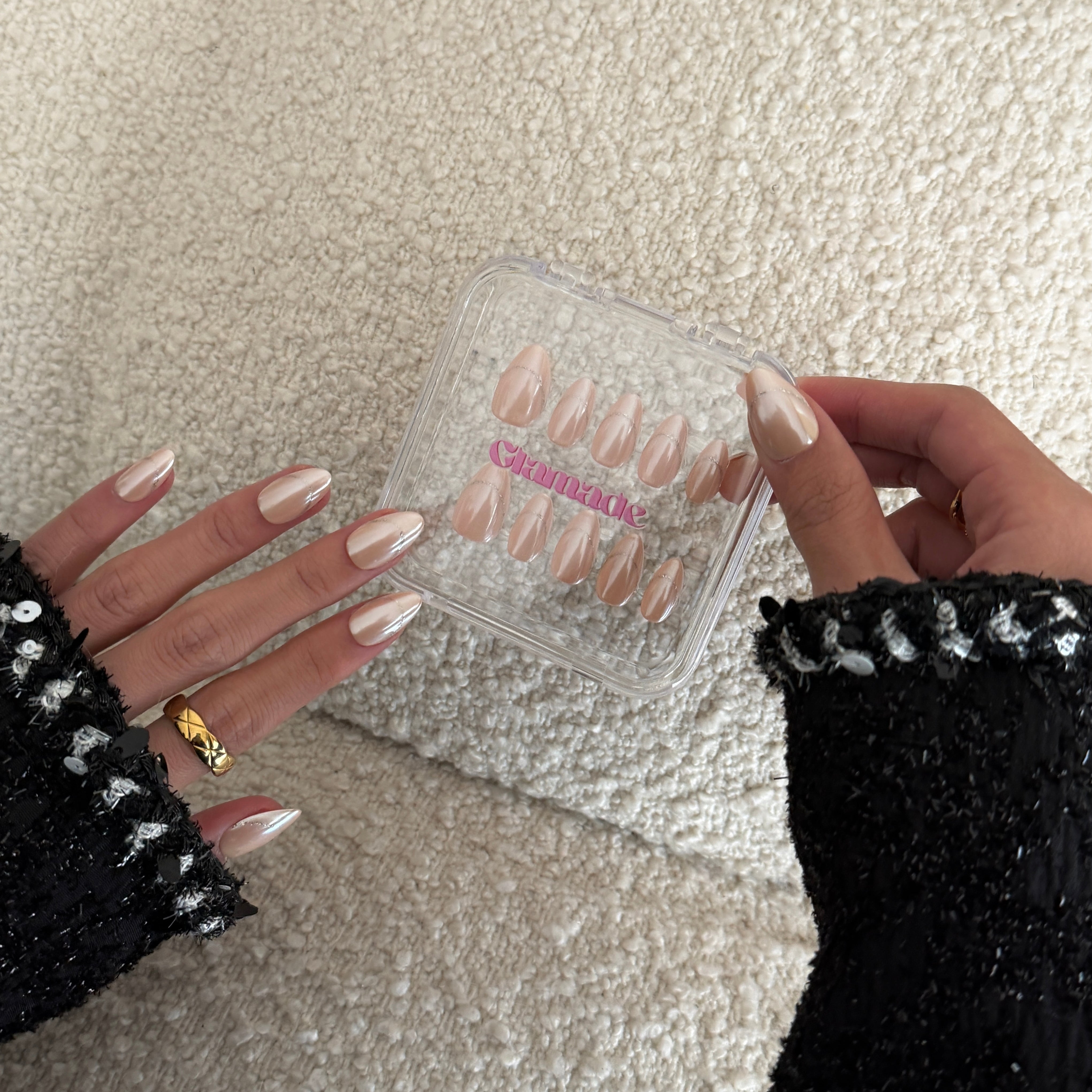A whisper of chrome for the woman who prefers her shine refined. Soft Opulence pairs a nude chrome base with a razor-thin silver French tip, creating a luminous, jewelry-like manicure that feels polished yet understated.