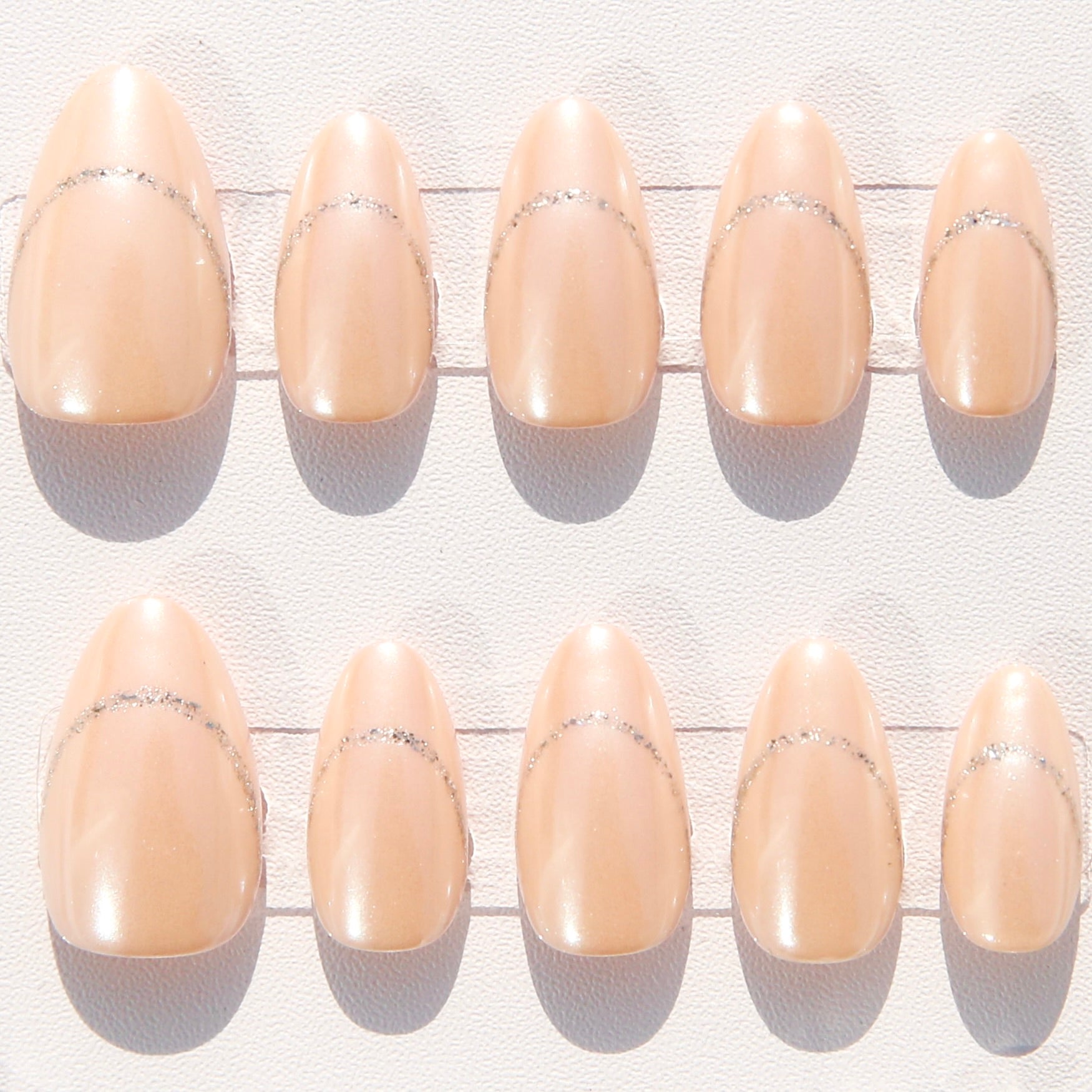 • Color palette: A soft, neutral nude chrome that reflects light with a subtle, mirror-like sheen—never harsh, always diffused. Each tip is finished with a precise silver French line, catching the light like a fine band of white gold.