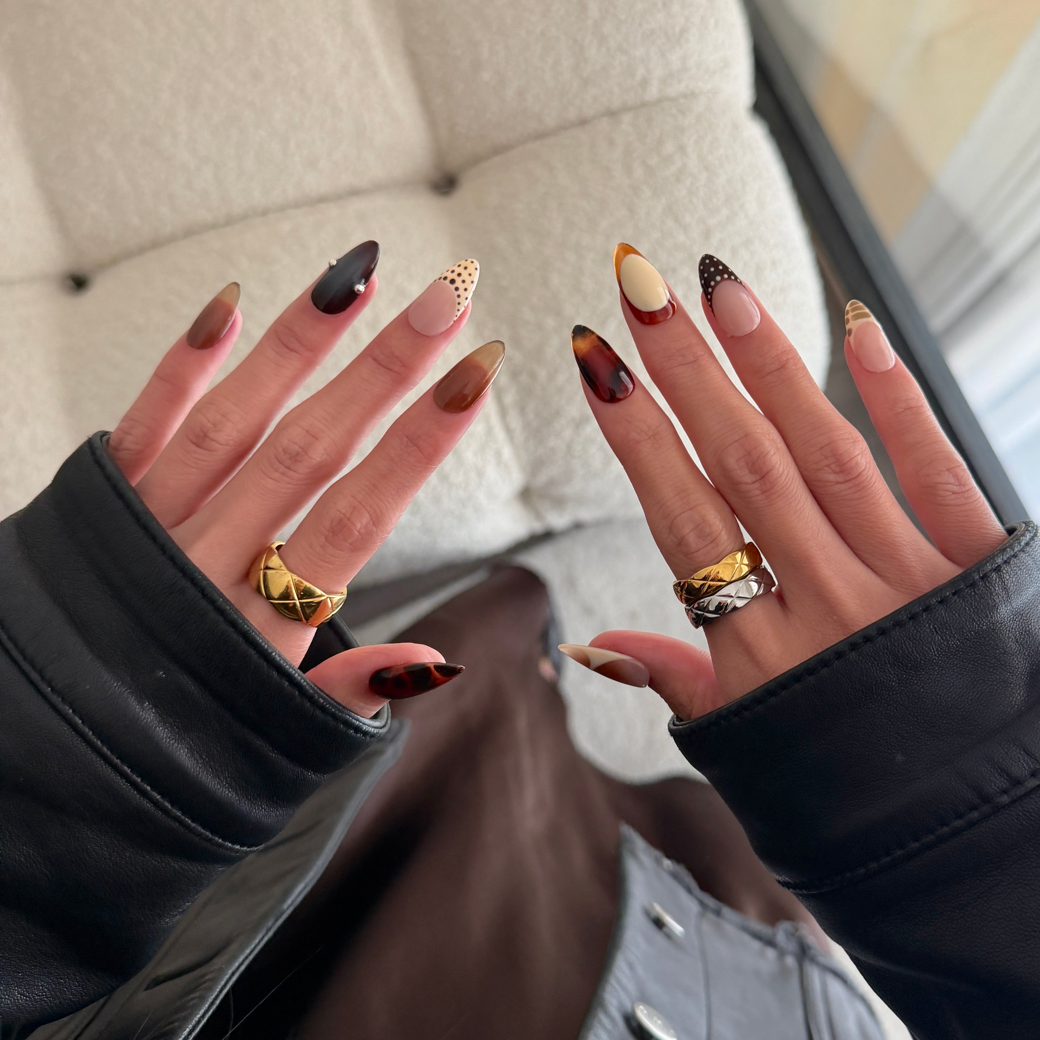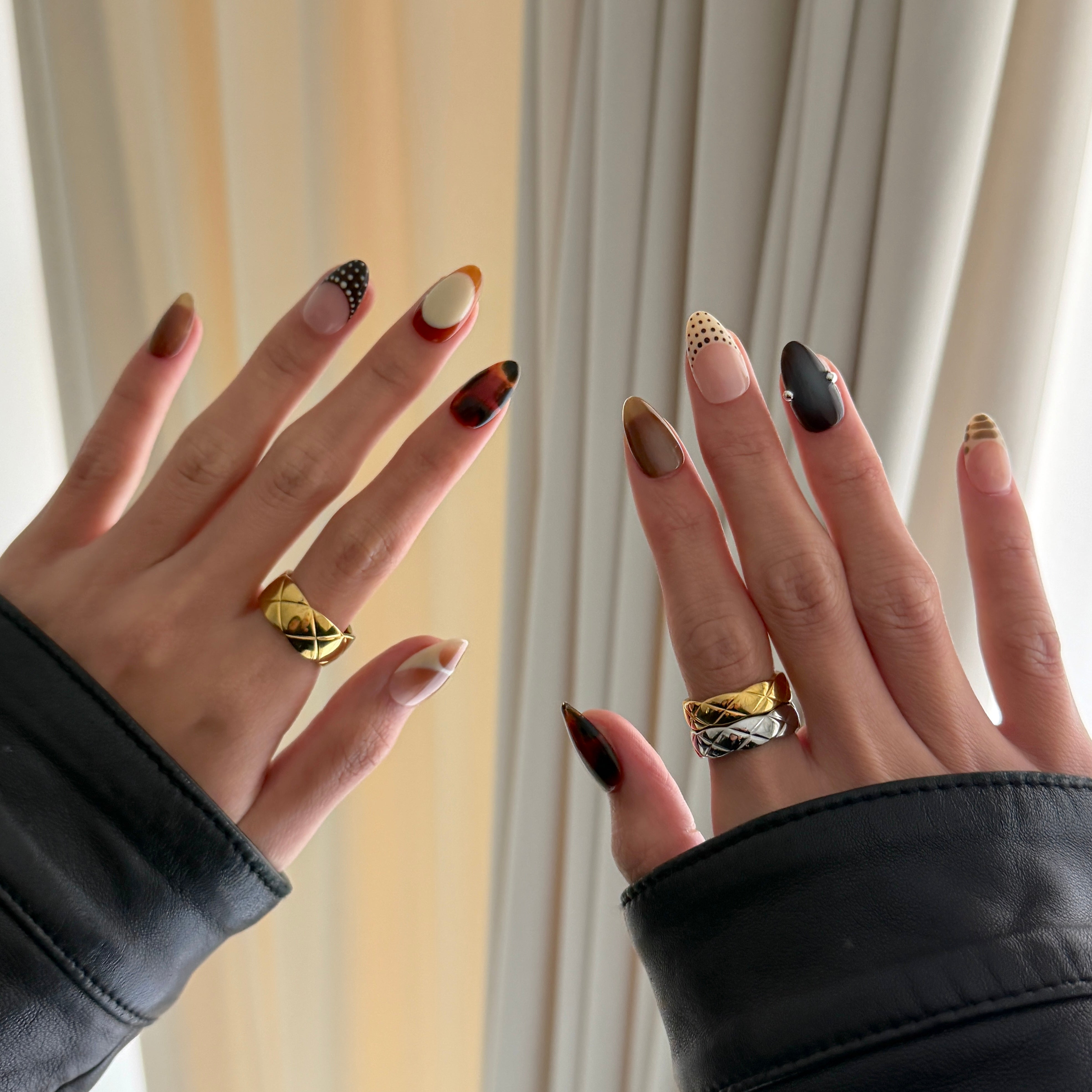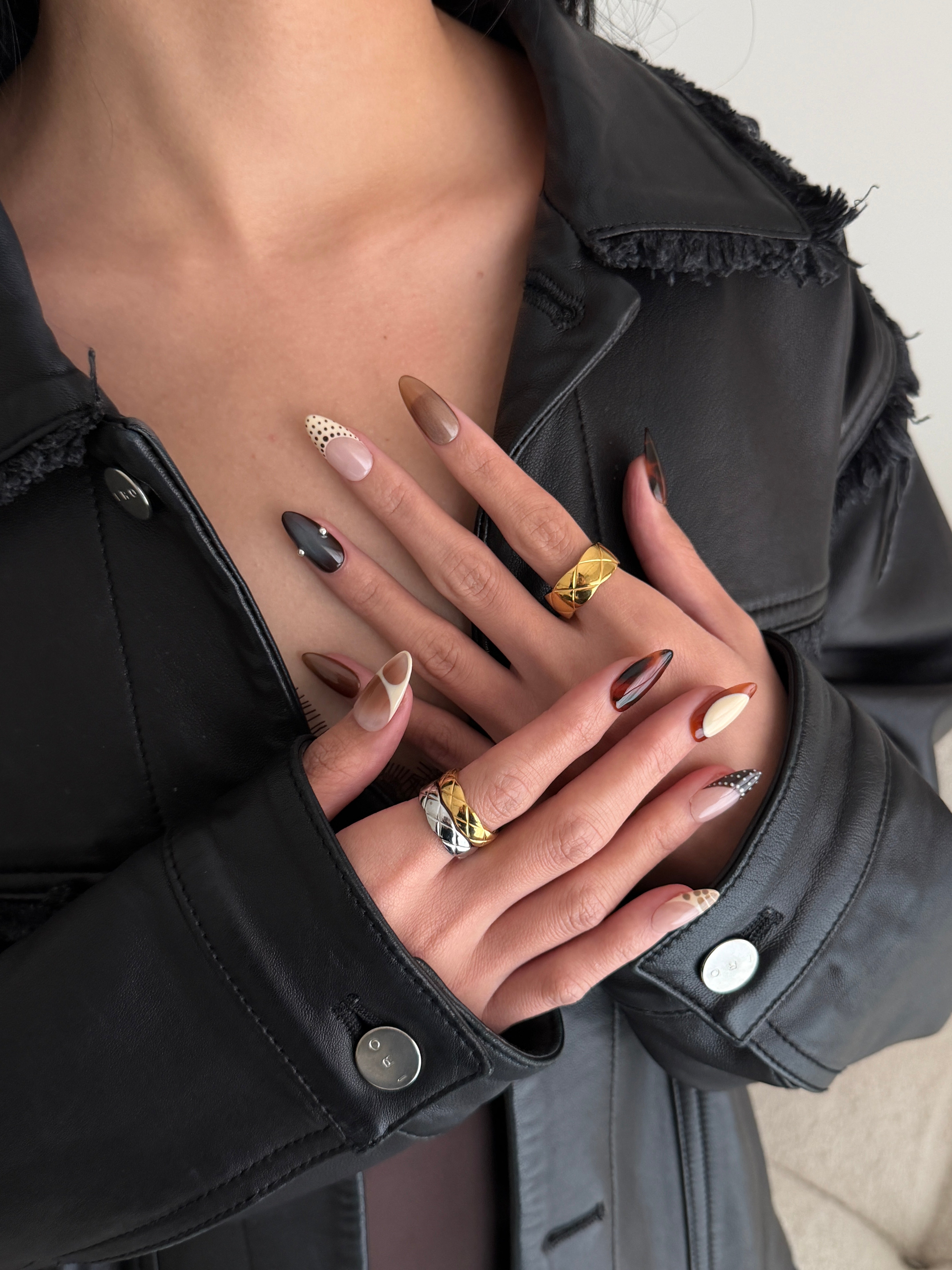 Caramel Biscotti is a café‑chic blend of cozy textures and neutral tones. This handcrafted press‑on set layers tortoiseshell warmth, soft aura fades, plush velvet browns, croc‑embossed detail, and playful biscotti‑dot polka for a manicure that feels like your favorite caramel latte and dessert in nail form.