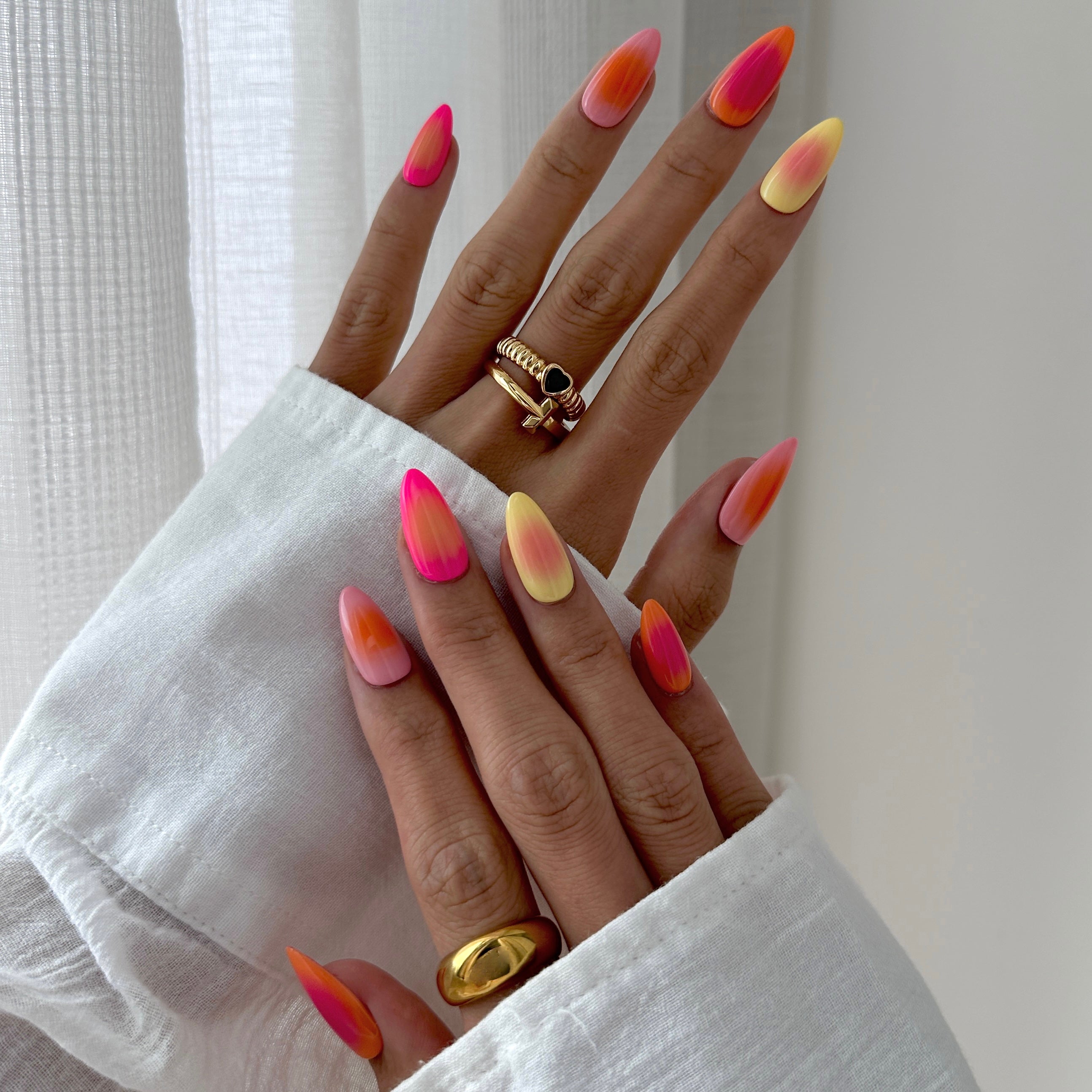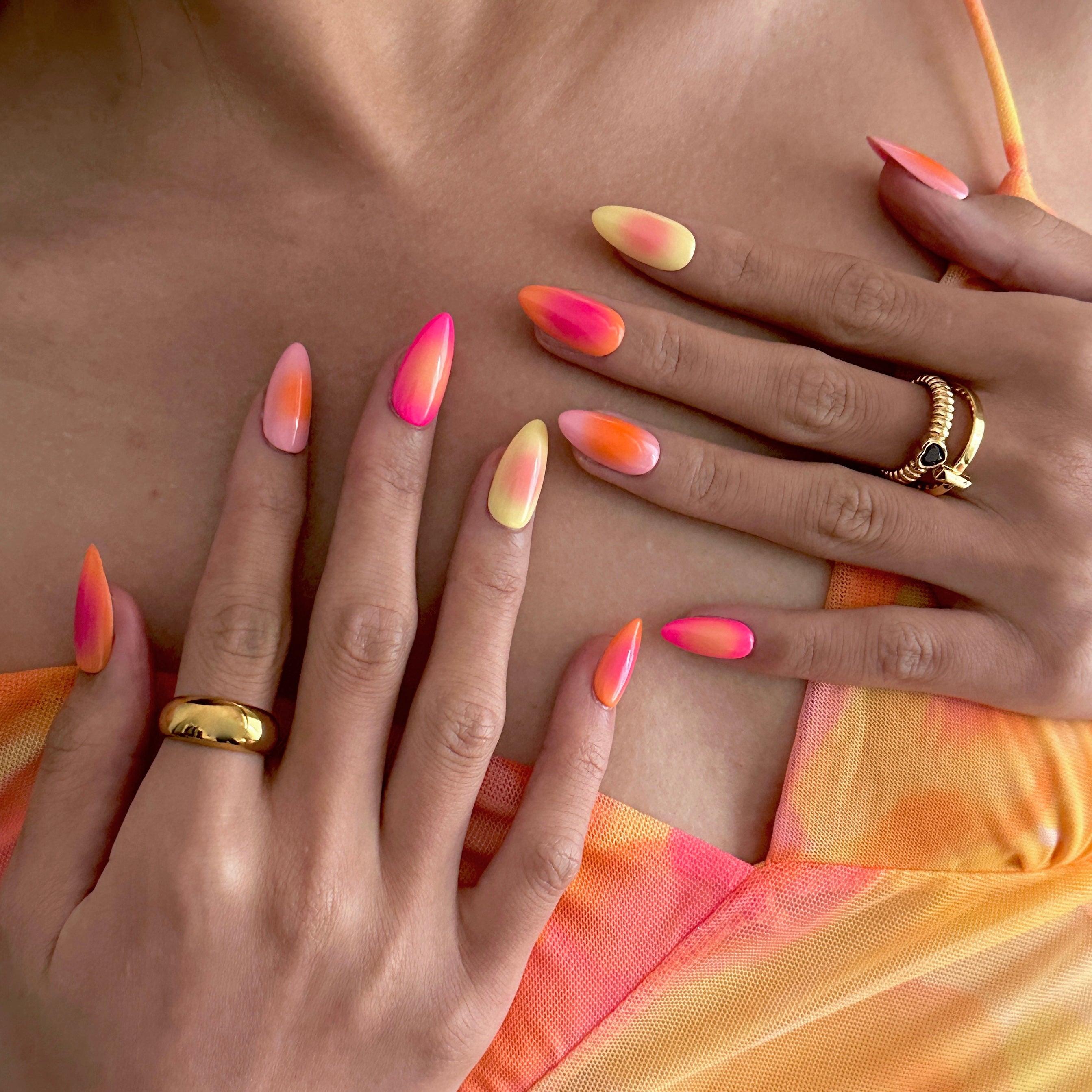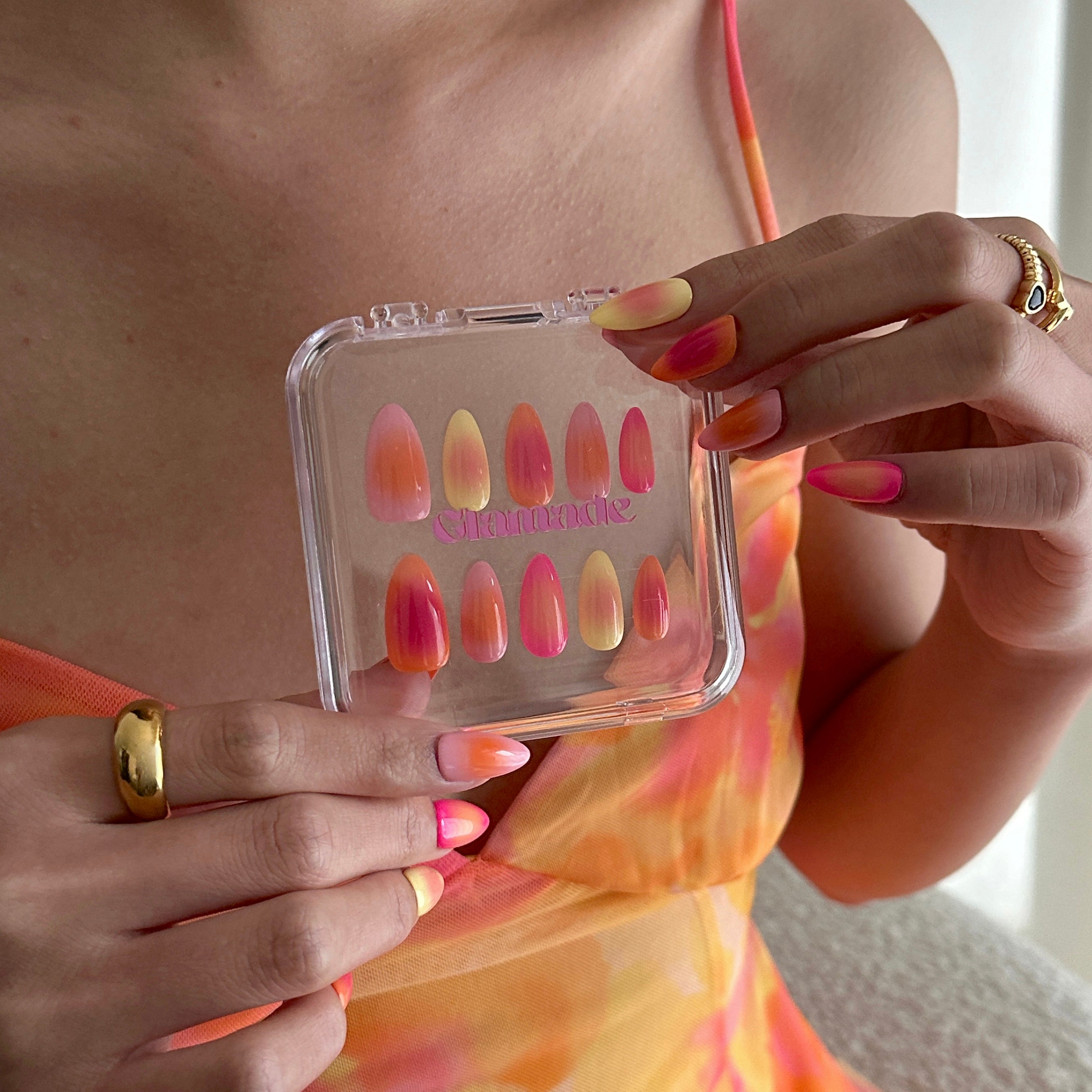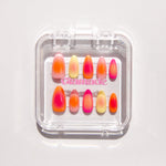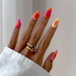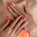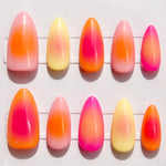 Raise a glass to summer with Aperol Spritz—a handmade press-on nail set that captures the effervescent glow and playful spirit of the season’s most iconic cocktail. Each nail is a celebration of color, blending zesty orange, golden yellow, and blushing pink in a sunlit ombré that mirrors the vibrant layers of your favorite spritz. The look is finished with a glossy, high-shine glaze and a chic almond silhouette, ready to toast every golden hour.