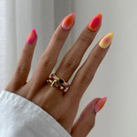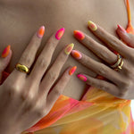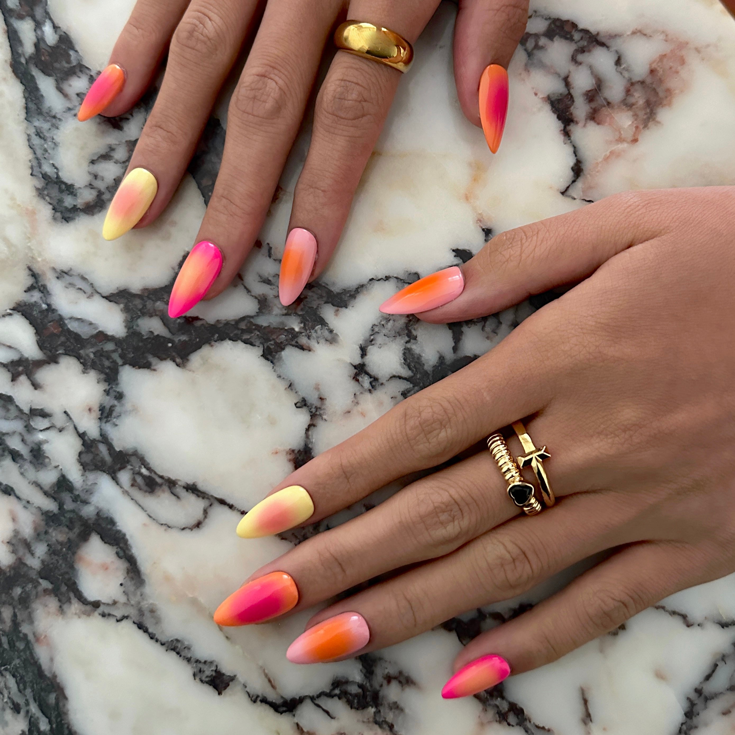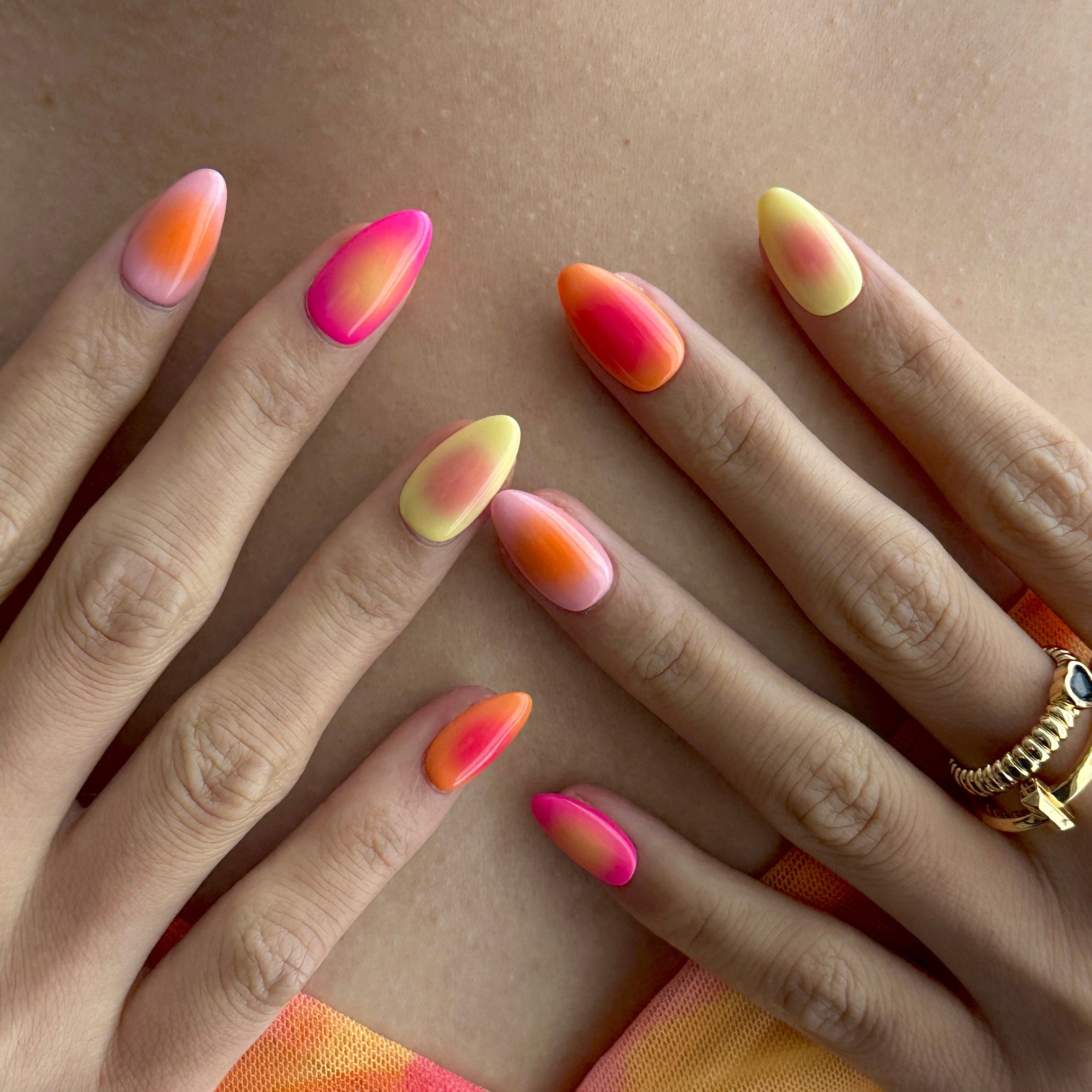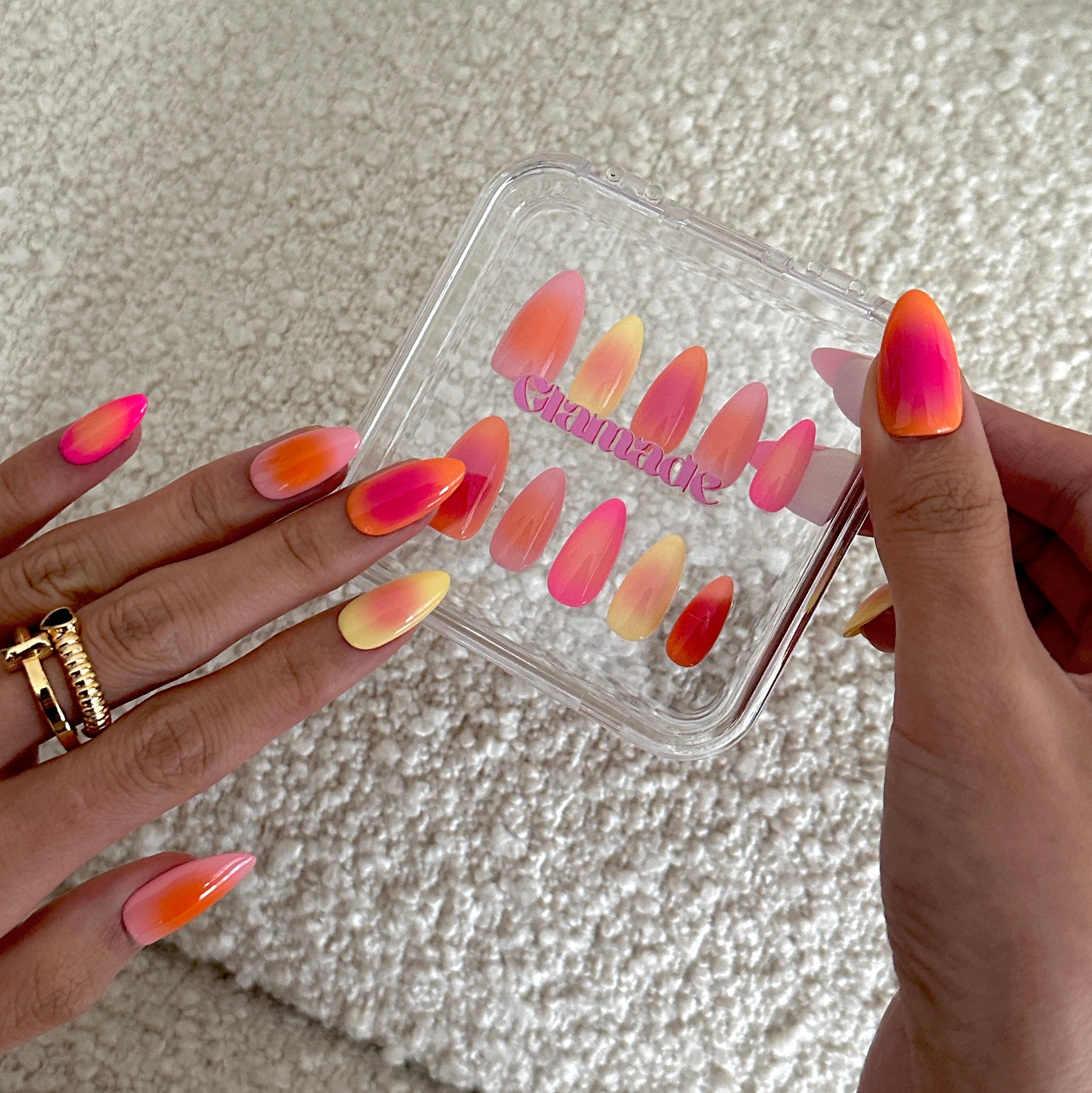 Raise a glass to summer with Aperol Spritz—a handmade press-on nail set that captures the effervescent glow and playful spirit of the season’s most iconic cocktail. Each nail is a celebration of color, blending zesty orange, golden yellow, and blushing pink in a sunlit ombré that mirrors the vibrant layers of your favorite spritz. The look is finished with a glossy, high-shine glaze and a chic almond silhouette, ready to toast every golden hour.