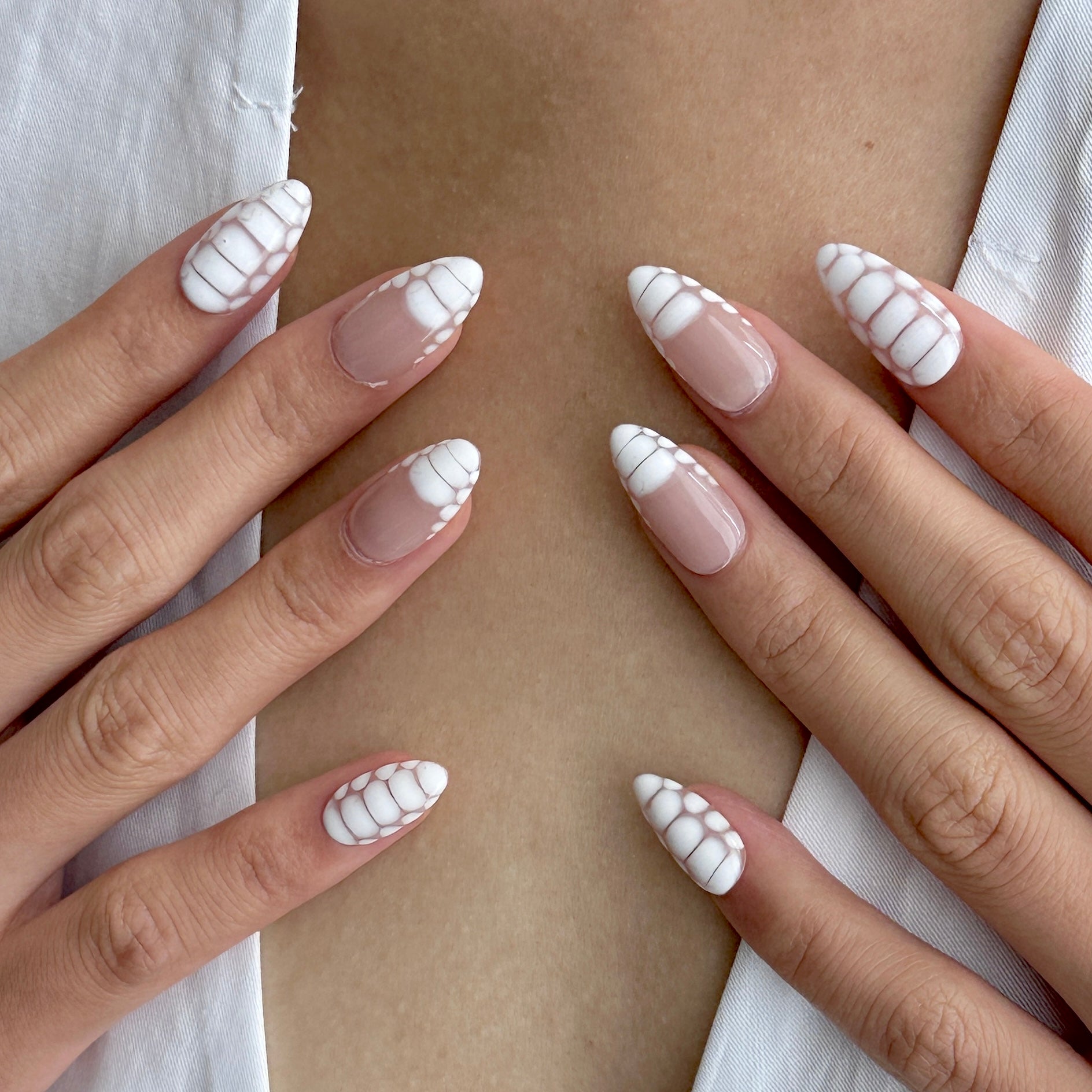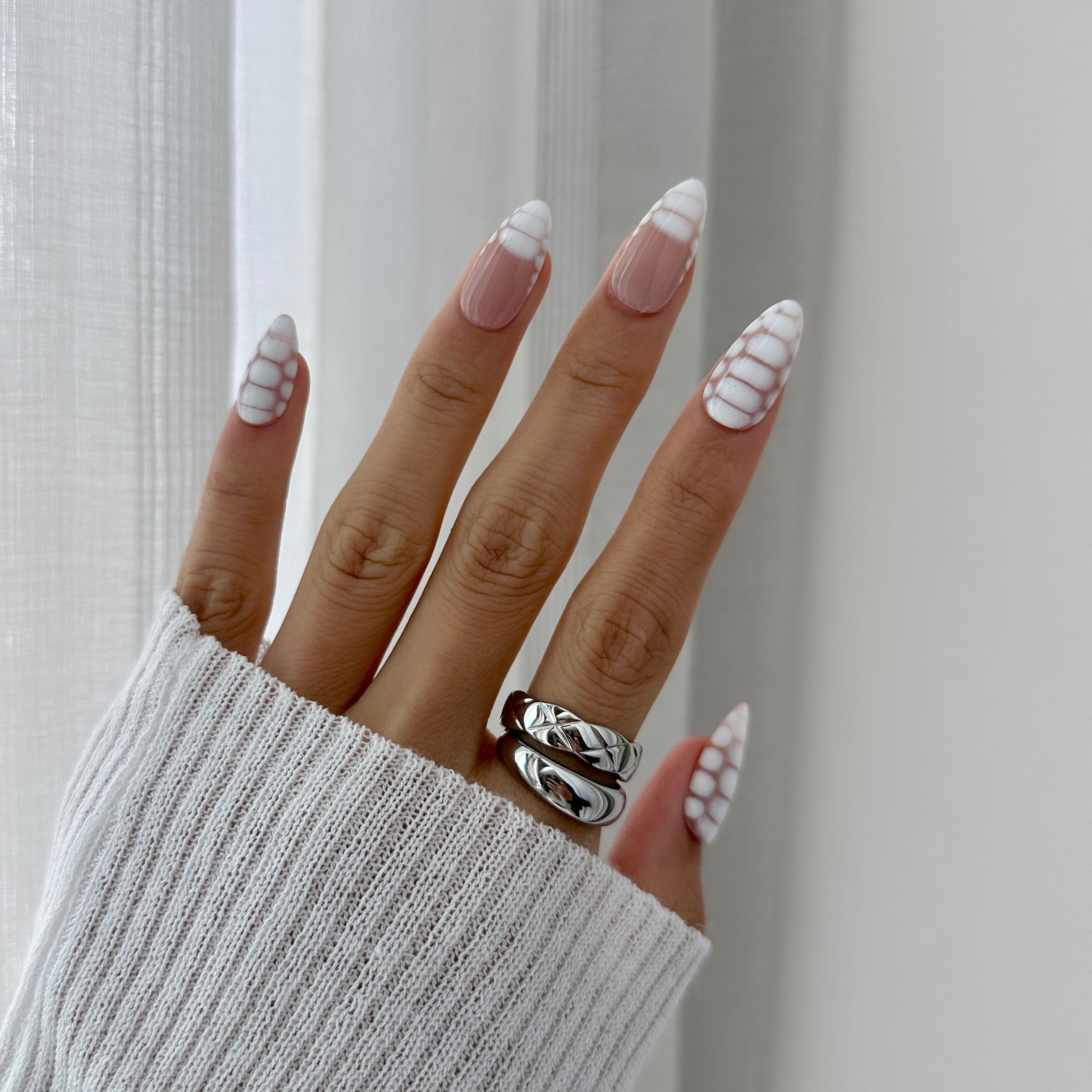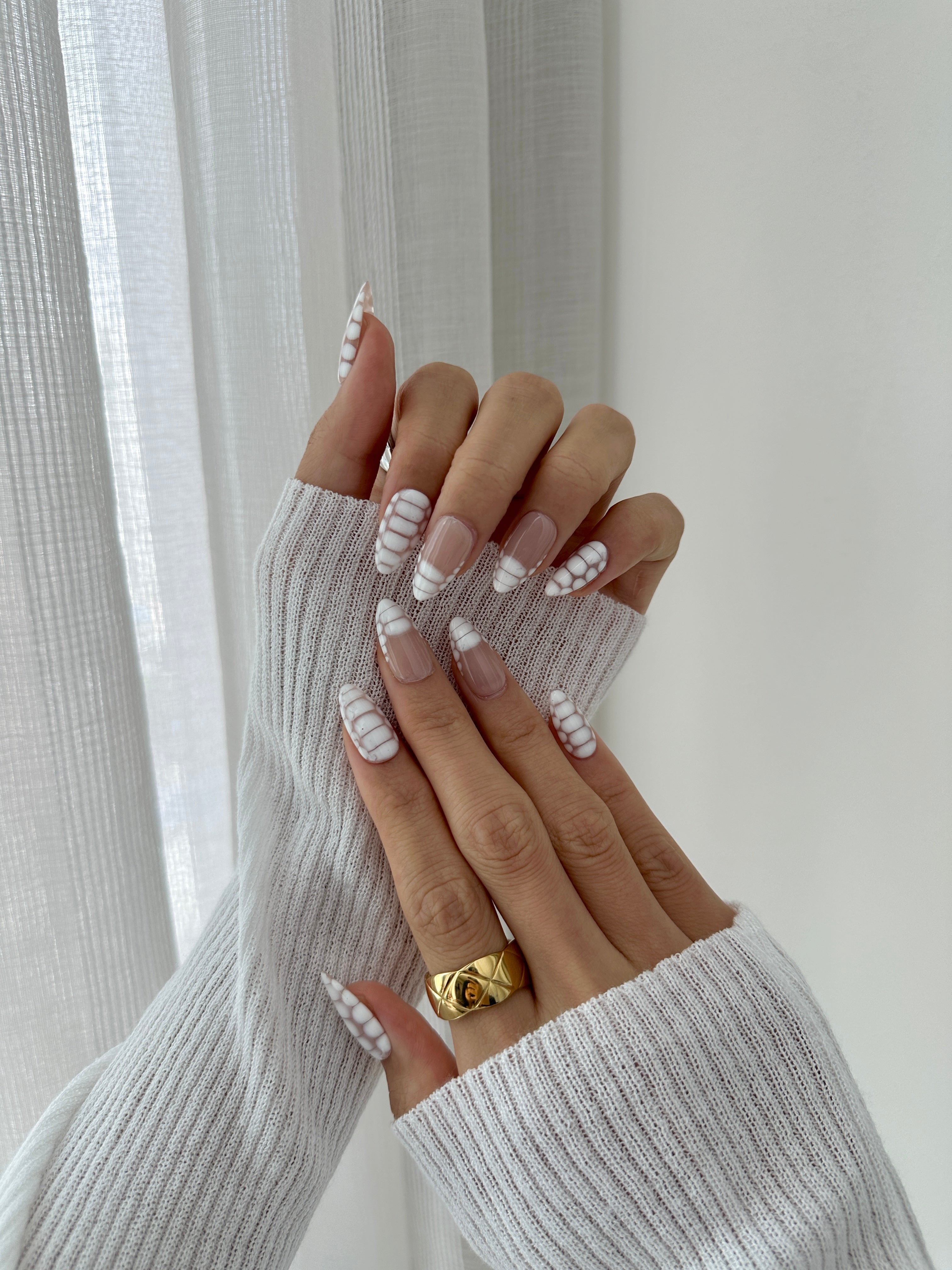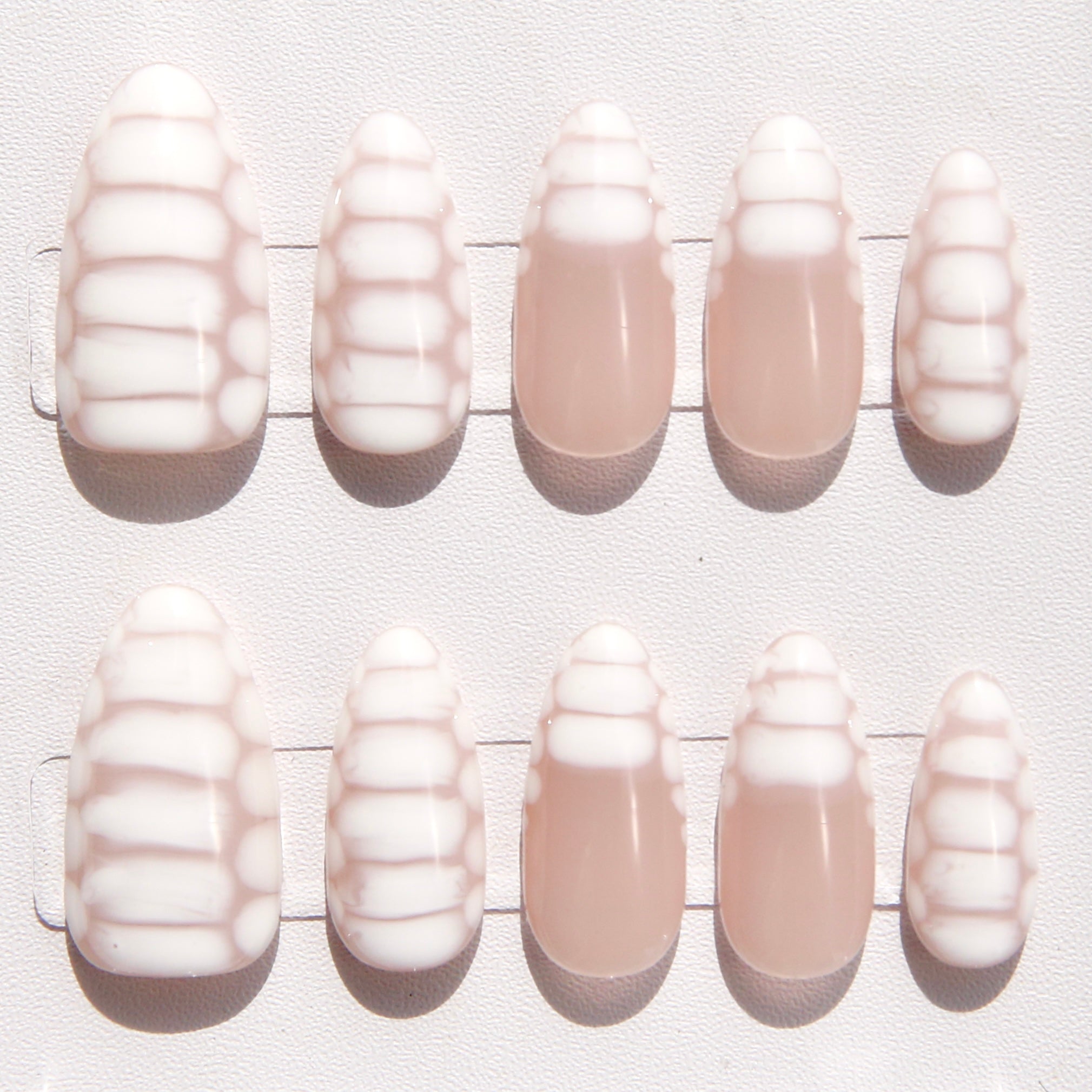 Escape to paradise with Coconut Sorbet, a refreshing white handmade press-on nail set inspired by the creamy sweetness of a tropical sorbet. This elegant summer style features a milky sheer base with subtle white swirl and plaid accents, capturing the breezy, laid-back vibes of your dream vacation. Whether you're lounging poolside or heading to a beachside brunch, Coconut Sorbet brings a cool, minimalist charm to every sunny moment.