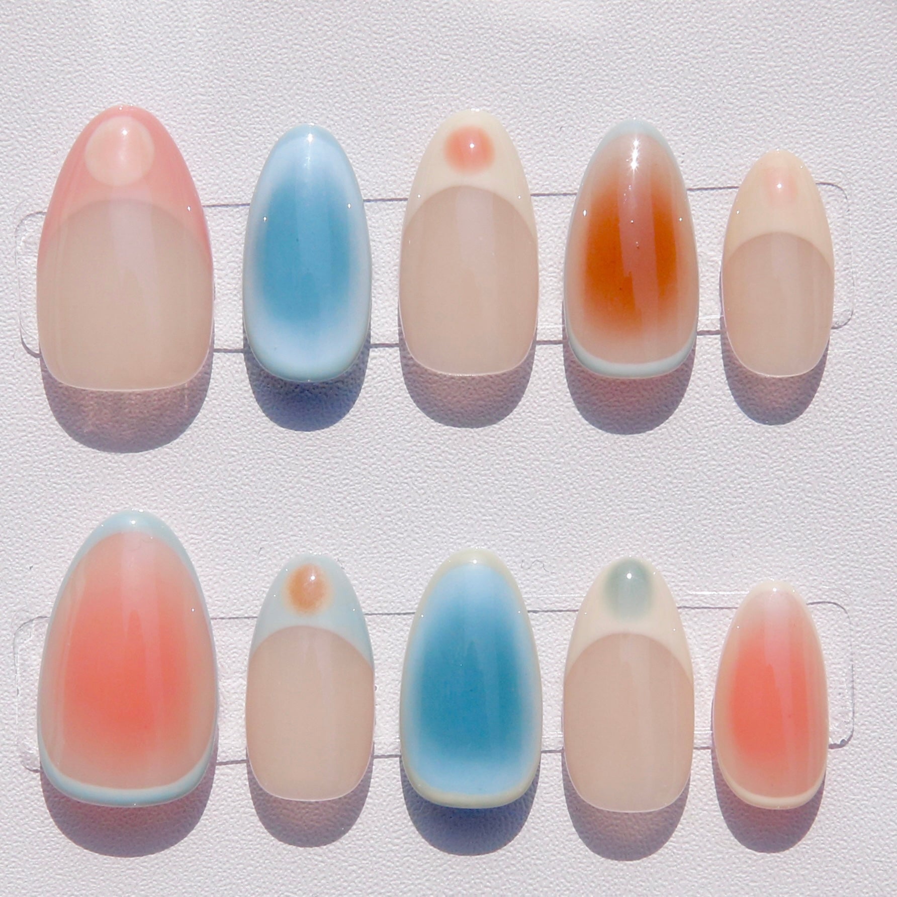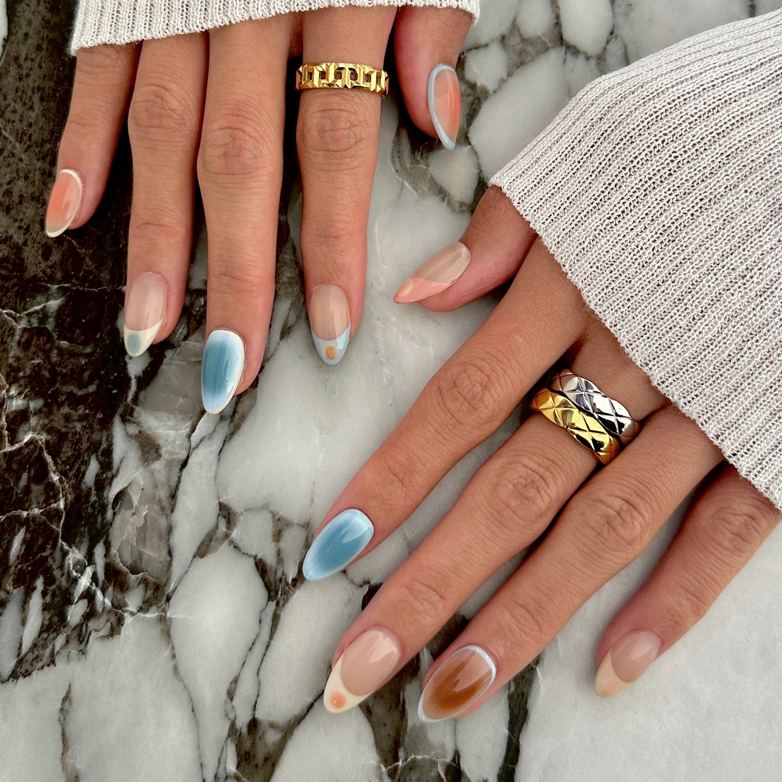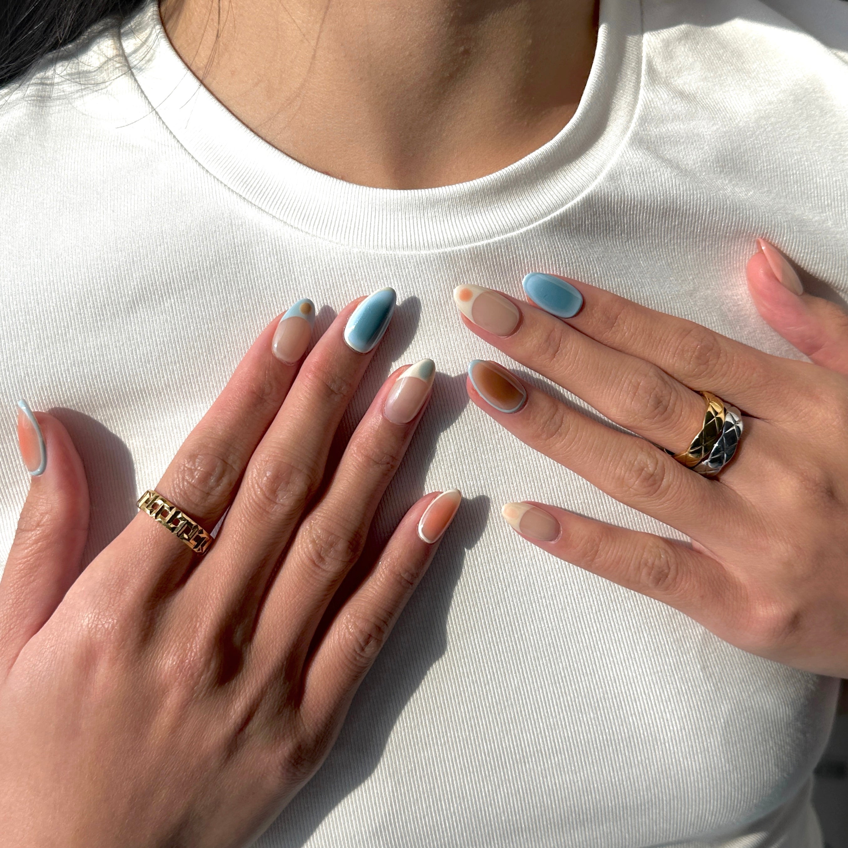 Dive into the mystical allure of Neptune, where the ethereal beauty of the cosmos meets the tranquil depths of the ocean. This captivating addition to our aura nail collection features a seamless blend of baby blue, pastel pink, and warm brown ombre, finished with an elegant French design that embodies both celestial wonder and earthly elegance.