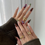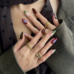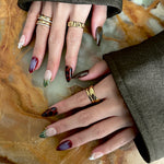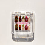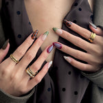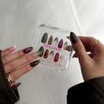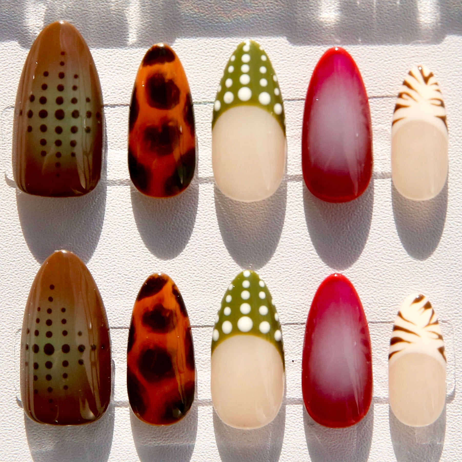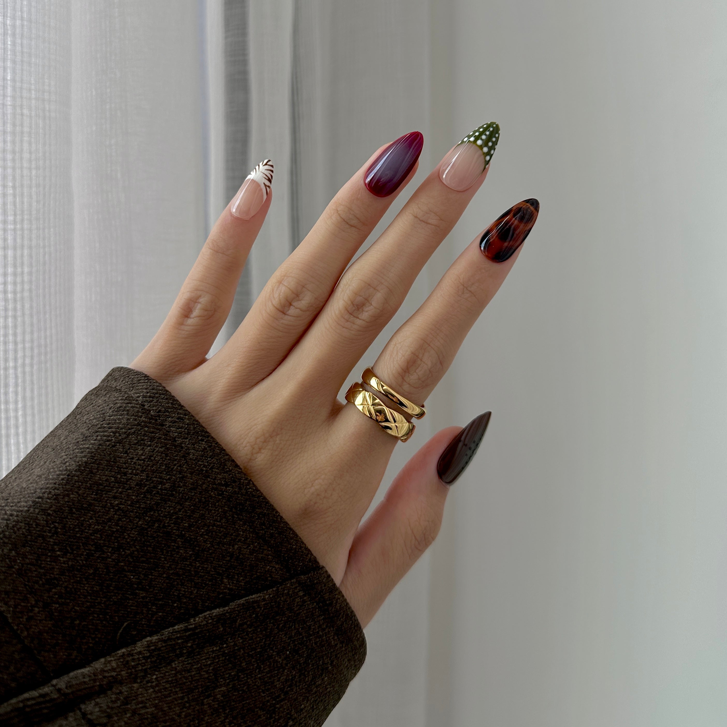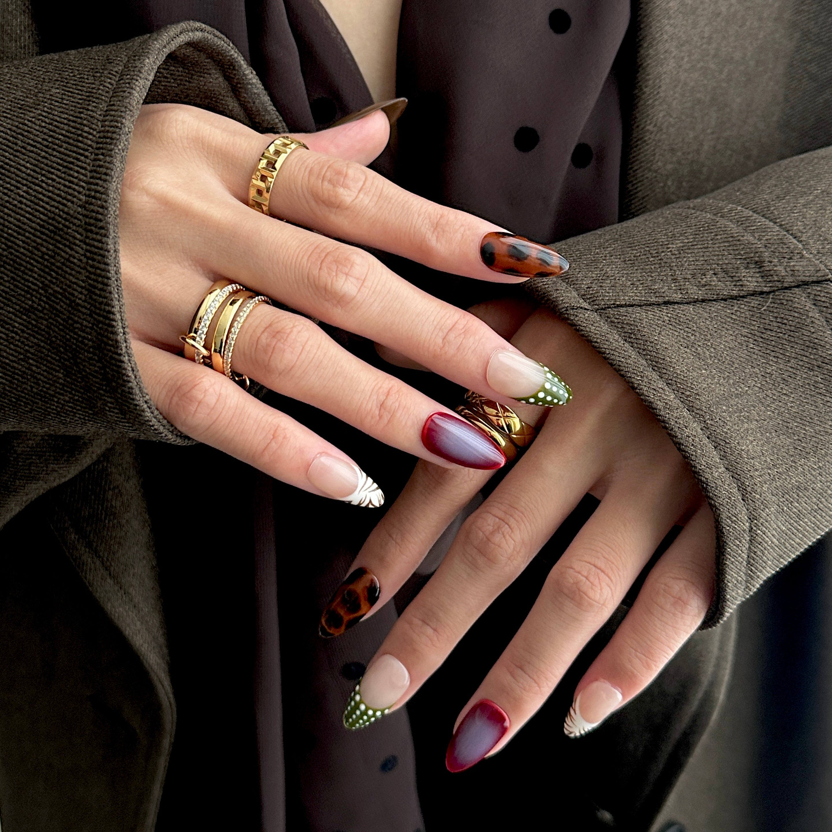 Inspired by the rich, luxurious scent of Oud, this nail design captures the essence of autumn with a sophisticated blend of patterns. This handmade press-on nail style showcases a mesmerizing mix of polka dots, animal prints, and gradient aura, bringing the untamed beauty of the forest to your fingertips.