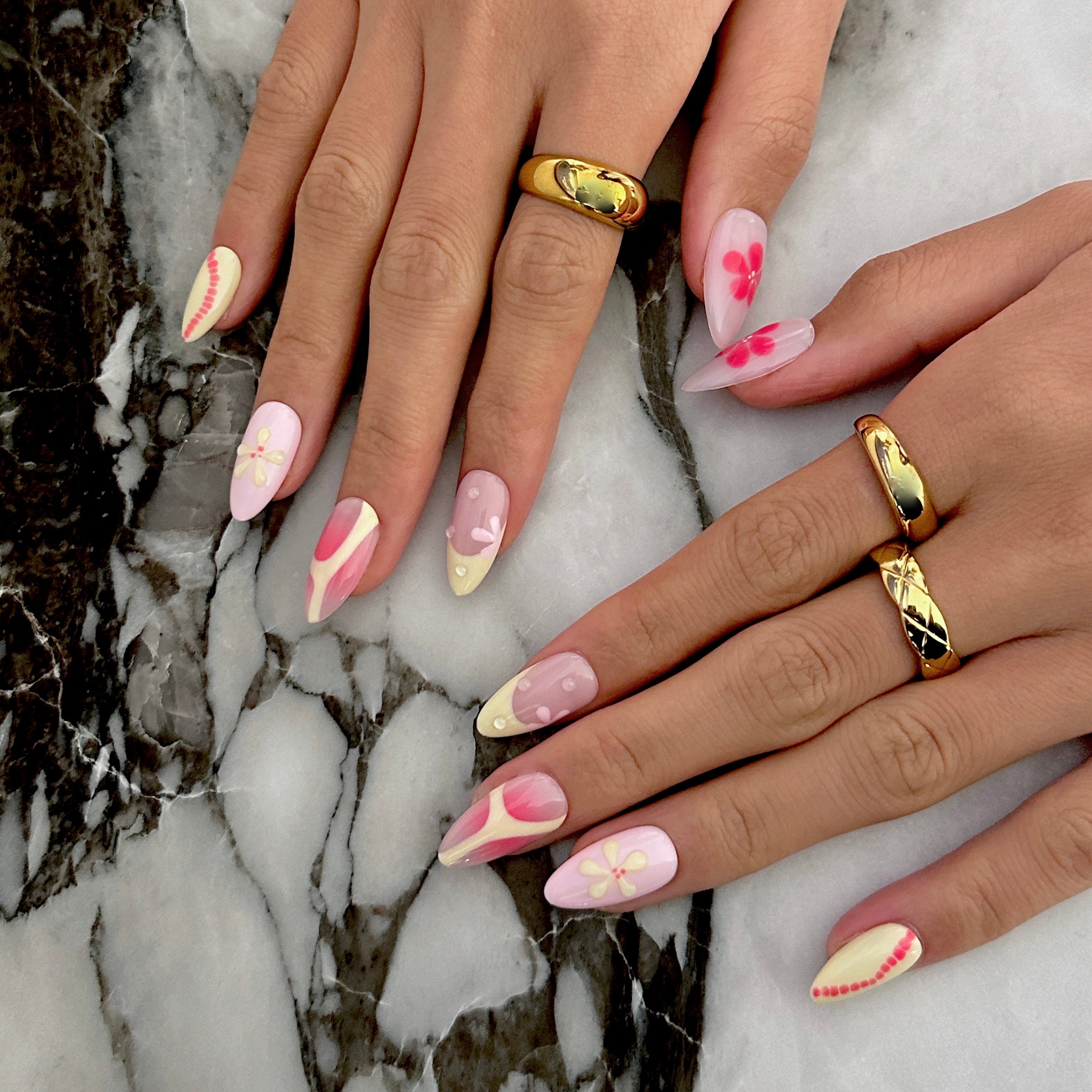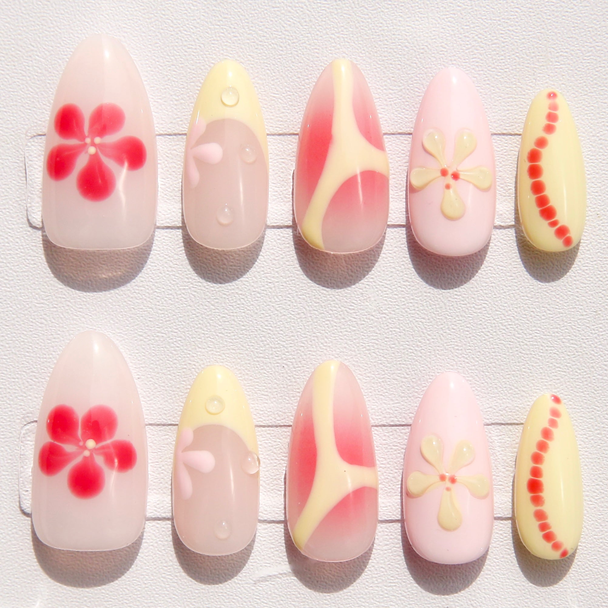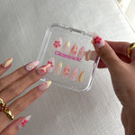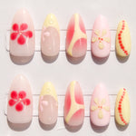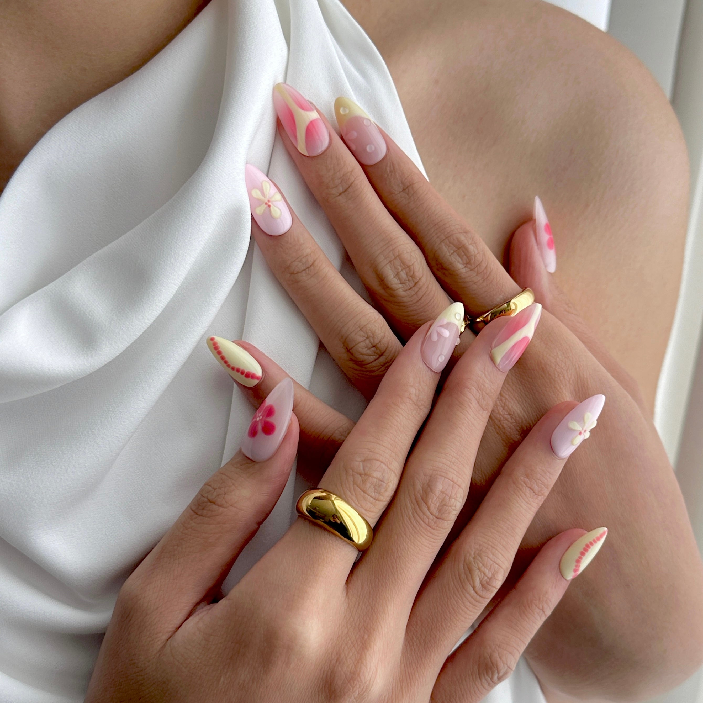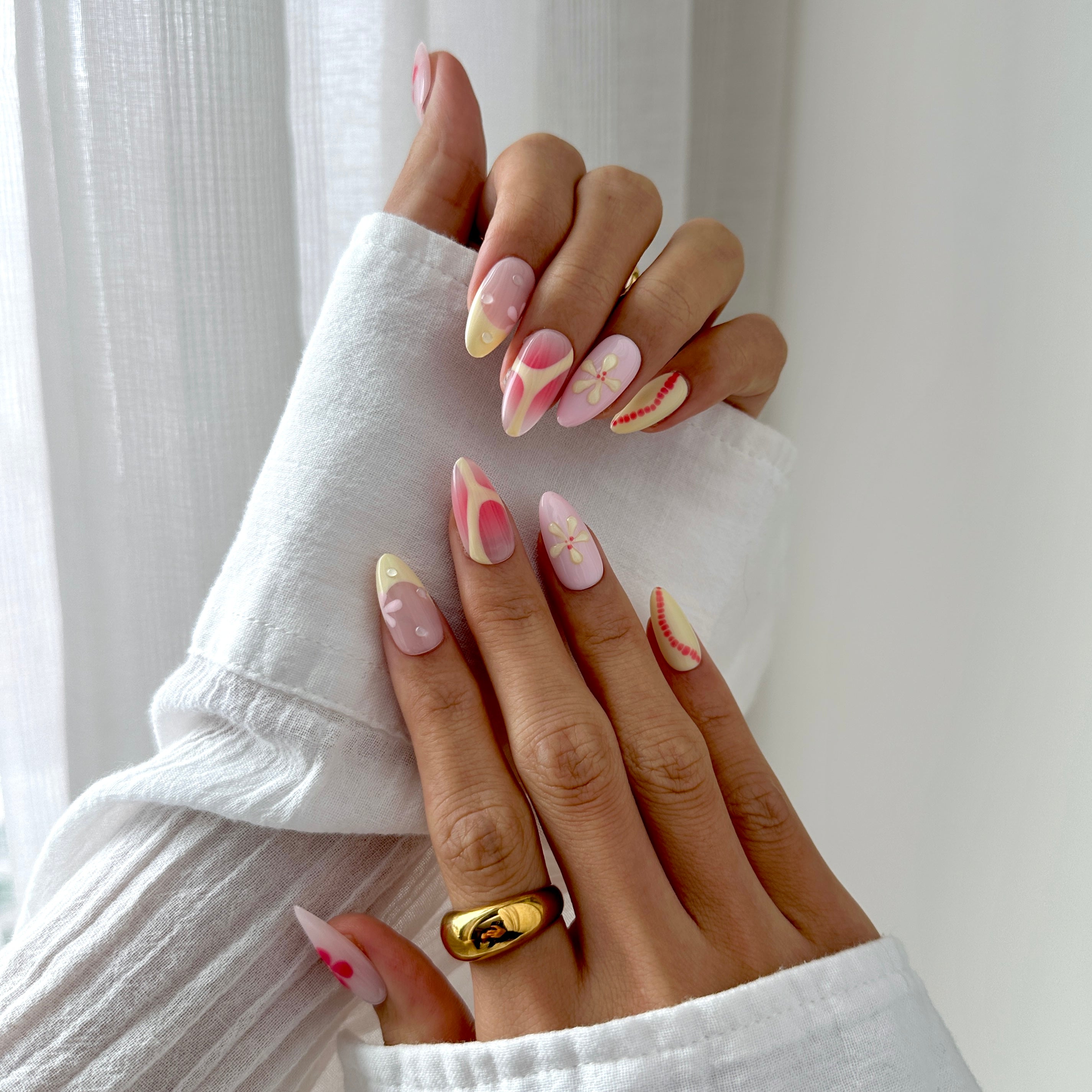 Sip into summer with Rosé Sangria, a handcrafted press-on nail set inspired by the playful charm of a chilled glass of fruity sangria. Featuring a dreamy blend of blush pinks, soft corals, and creamy whites, this set dazzles with whimsical floral accents and vibrant citrus motifs. Each nail is a celebration—perfect for sunlit picnics, rooftop brunches, or any moment you want to capture the sparkling joy of summer.