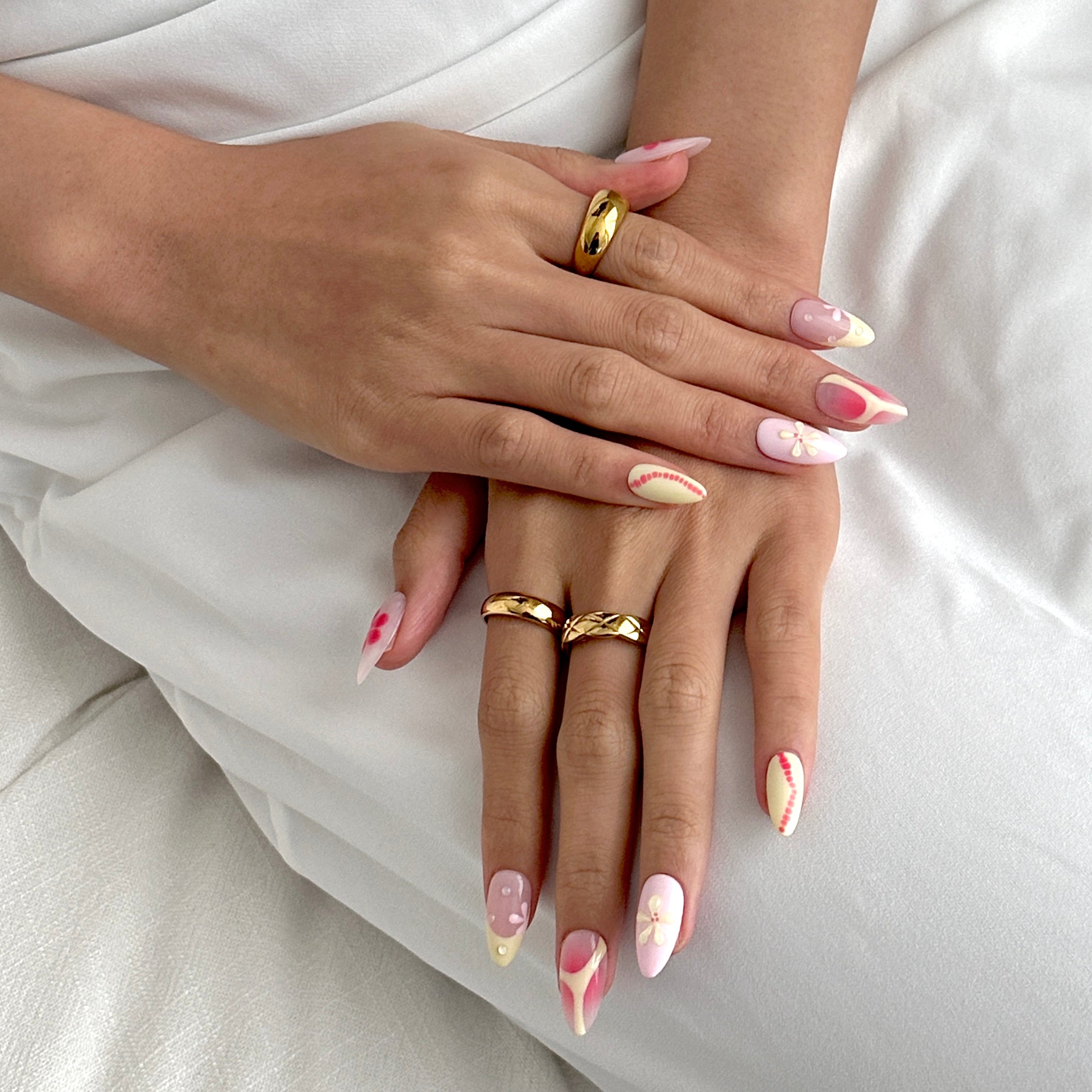 Indulge in the luxurious comfort and easy application of our handmade press-on nails. Choose from various application methods to suit your preferences. Please find a detailed guide here on preparing, applying, and removing our press-on nails according to the specific gel you opt for.